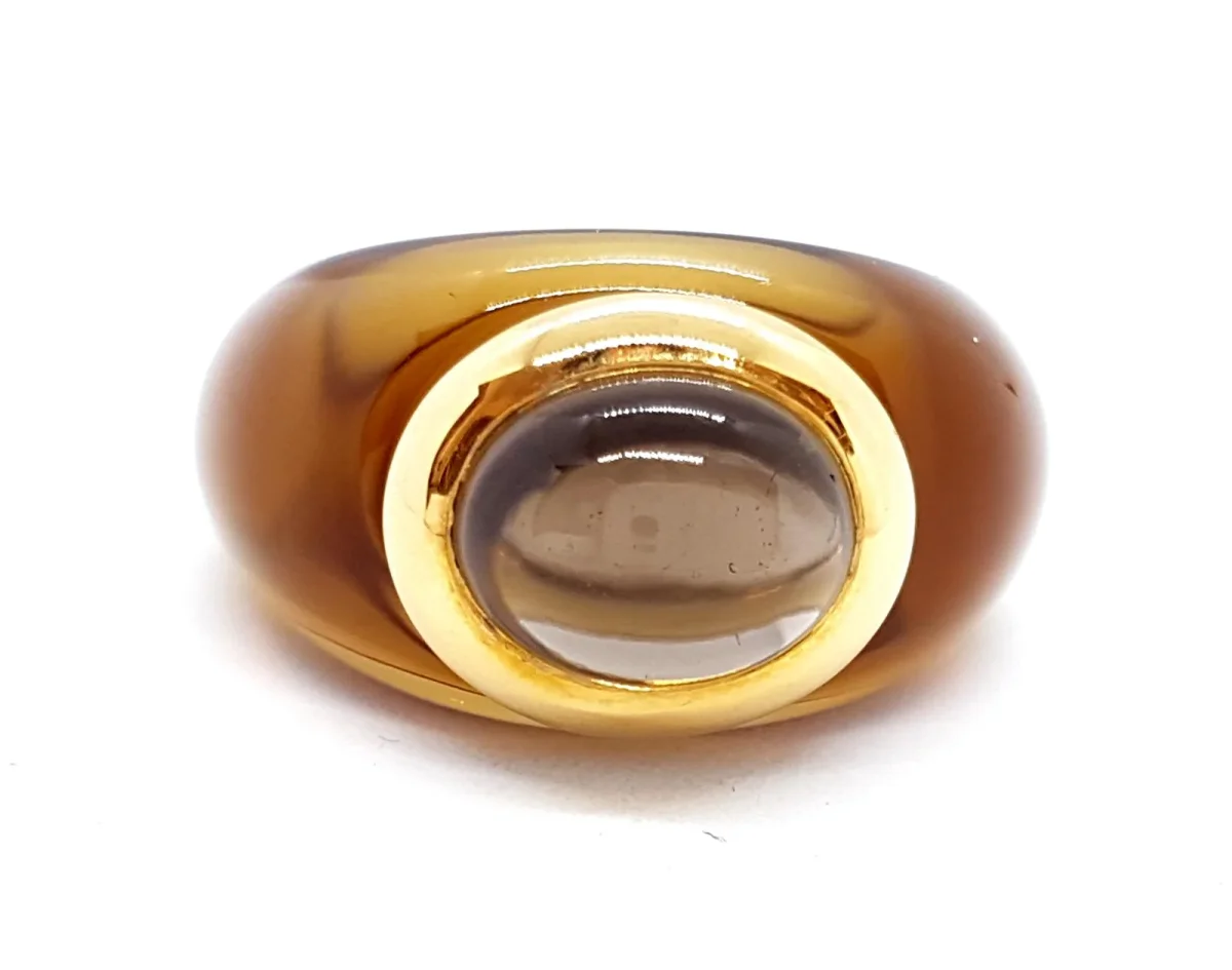 Bague signée Benitah, résine brun tranparente, serti sur Or jaune 750 millièmes (18 carats) d’un quartz fumé de 2.91 cts taillé en cabochon, Taille de doigt 56, poids total: 4,26 g, poids or: 1,85 g, état neuf, prix neuf: 700 €