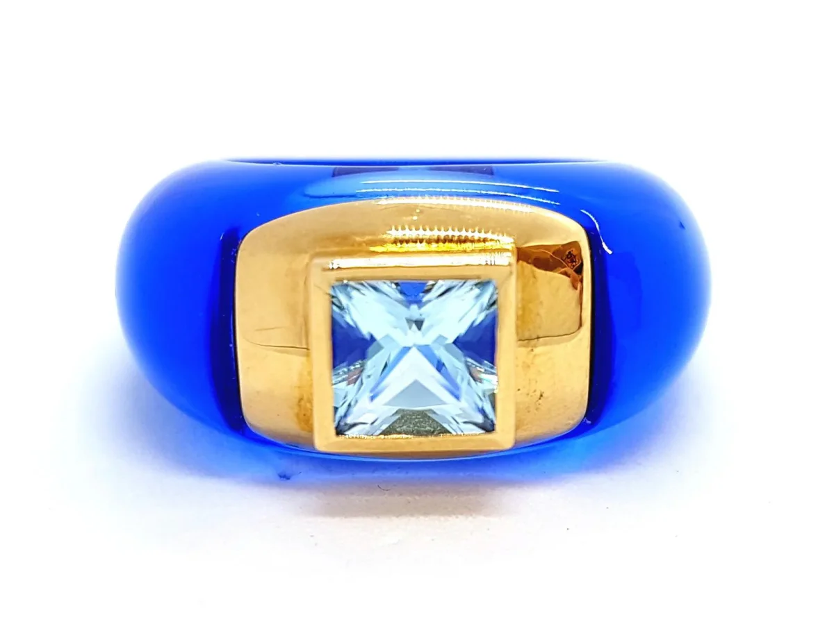 Bague signée Benitah, en résine bleue transparente, sertie sur Or jaune 750 millièmes (18 carats) d’une topaze bleue taillée carrée d’environ 0,80 ct, taille de doigt: 52, poids total: 4,62 g, poids or: 2.48 g, état neuf, prix neuf 750€