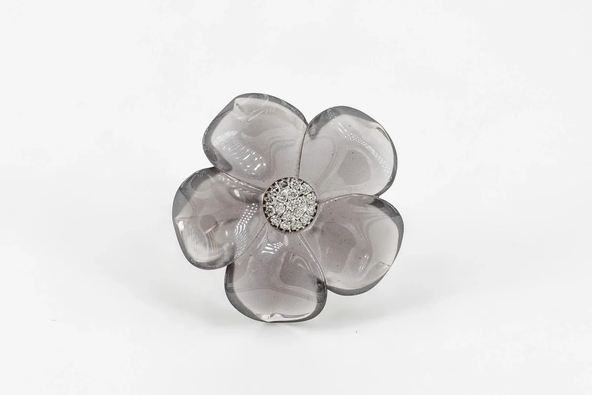 Bague de la Maison André Bénitah, modèle « Printania », en forme de fleur, en or blanc 18 carats, Sertie de diamants pour 0.09 carat au total, Taille 8/8, couleur G-H, Pureté VS-SI, Fleur en résine grise, Taille: 53, Poids total: 6.04 g, Poinçonnée, état neuf
