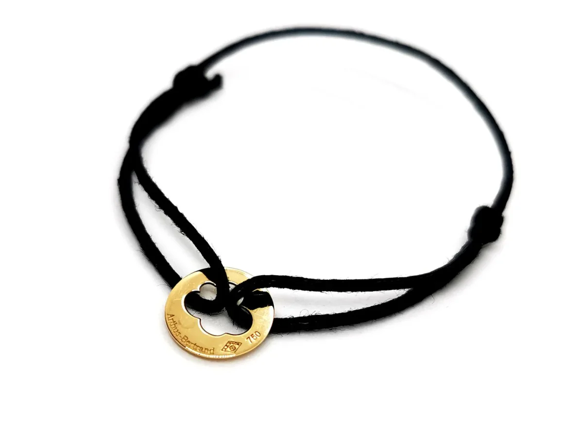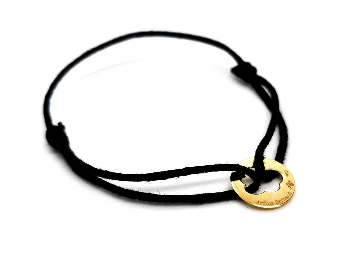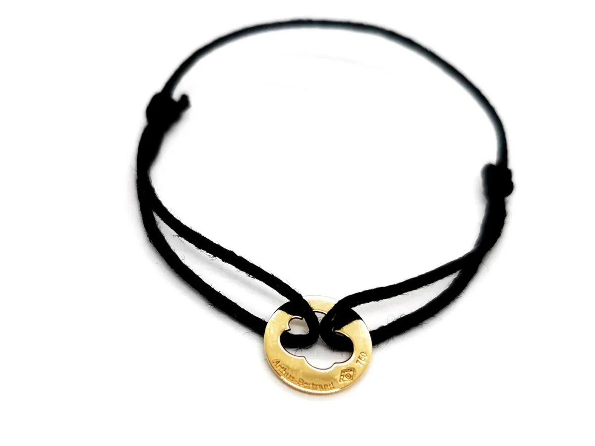 Bracelet signé de la maison Arthus Bertrand, en or jaune 750 millièmes (18 carats)testé , plaque ronde ajourée en forme de nuage, sur cordon noir, taille ajustable, poids total: 0,44 g, longueur maximale du cordon: 16 cm, diamètre plaque: 0,98 cm, épaisseur plaque: 0,03 cm, signature Arthus Betrand, poinçon de maître, prix neuf: 195€, excellent état.