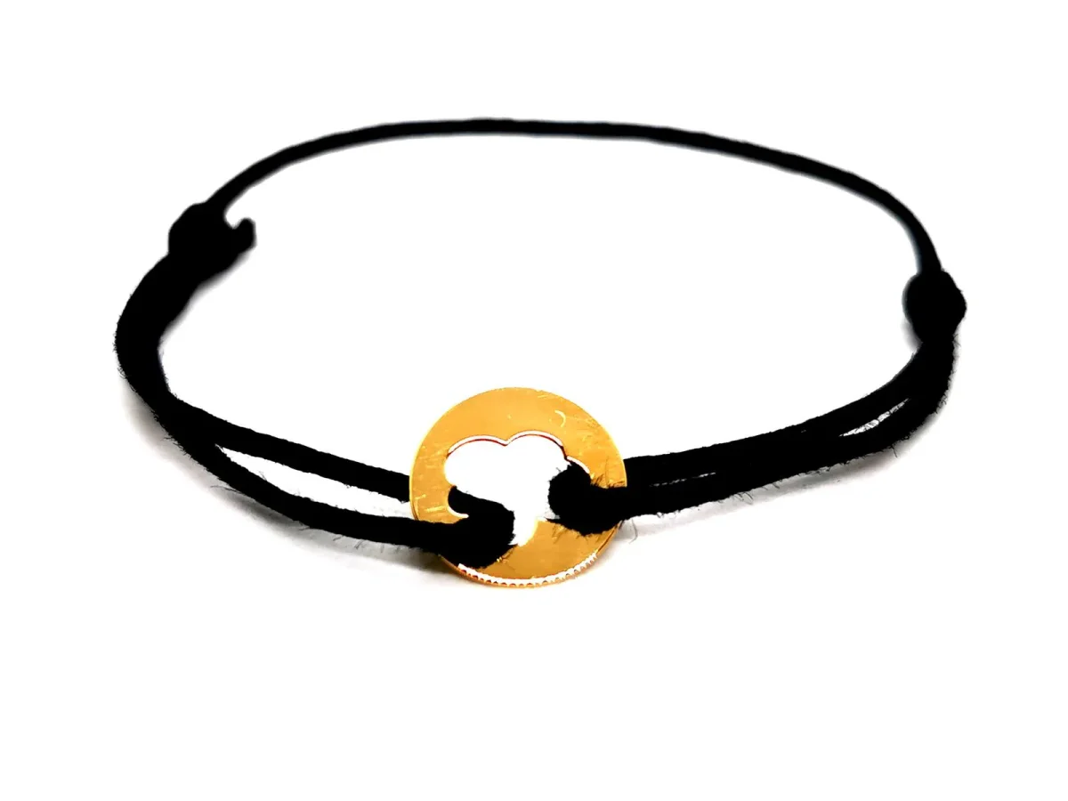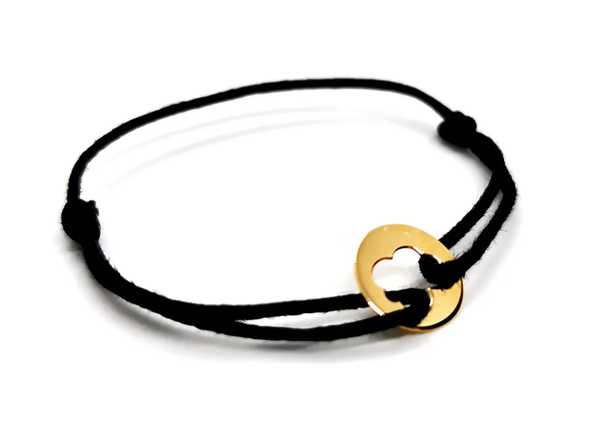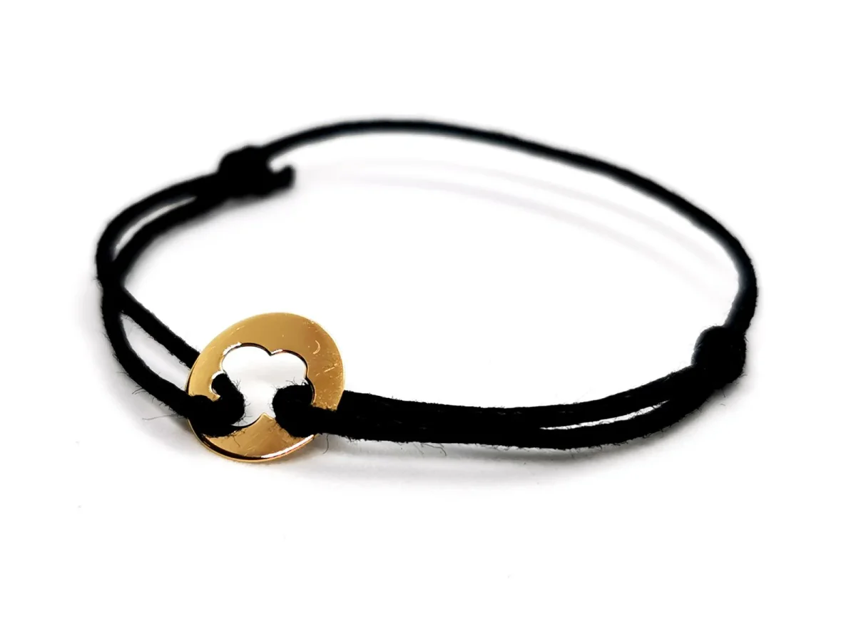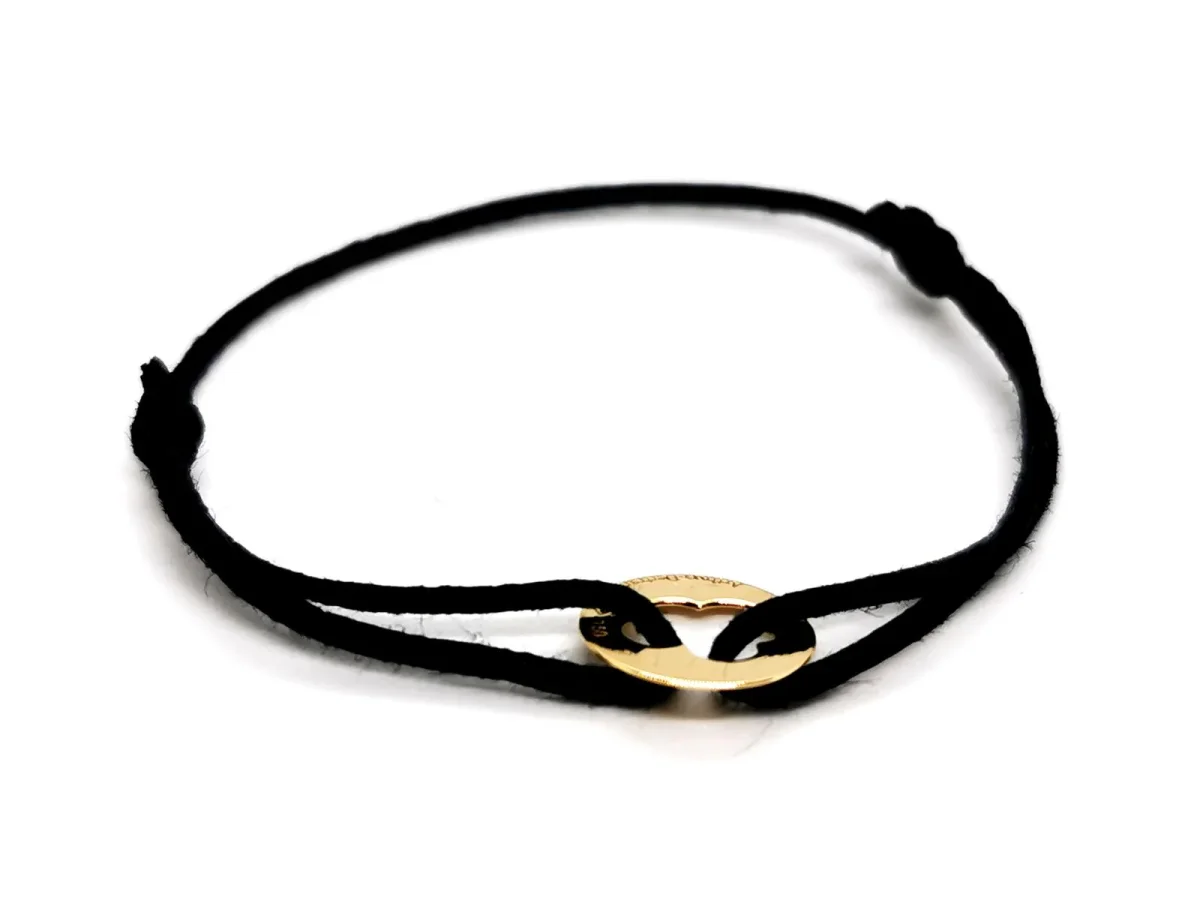 Bracelet signé de la maison Arthus Bertrand, en or jaune 750 millièmes (18 carats)testé , plaque ronde ajourée en forme de nuage, sur cordon noir, taille ajustable, poids total: 0,44 g, longueur maximale du cordon: 16 cm, diamètre plaque: 0,98 cm, épaisseur plaque: 0,03 cm, signature Arthus Betrand, poinçon de maître, prix neuf: 195€, excellent état.