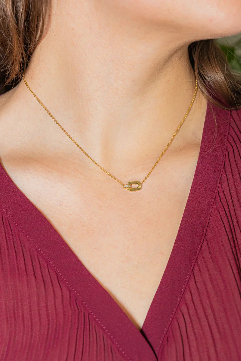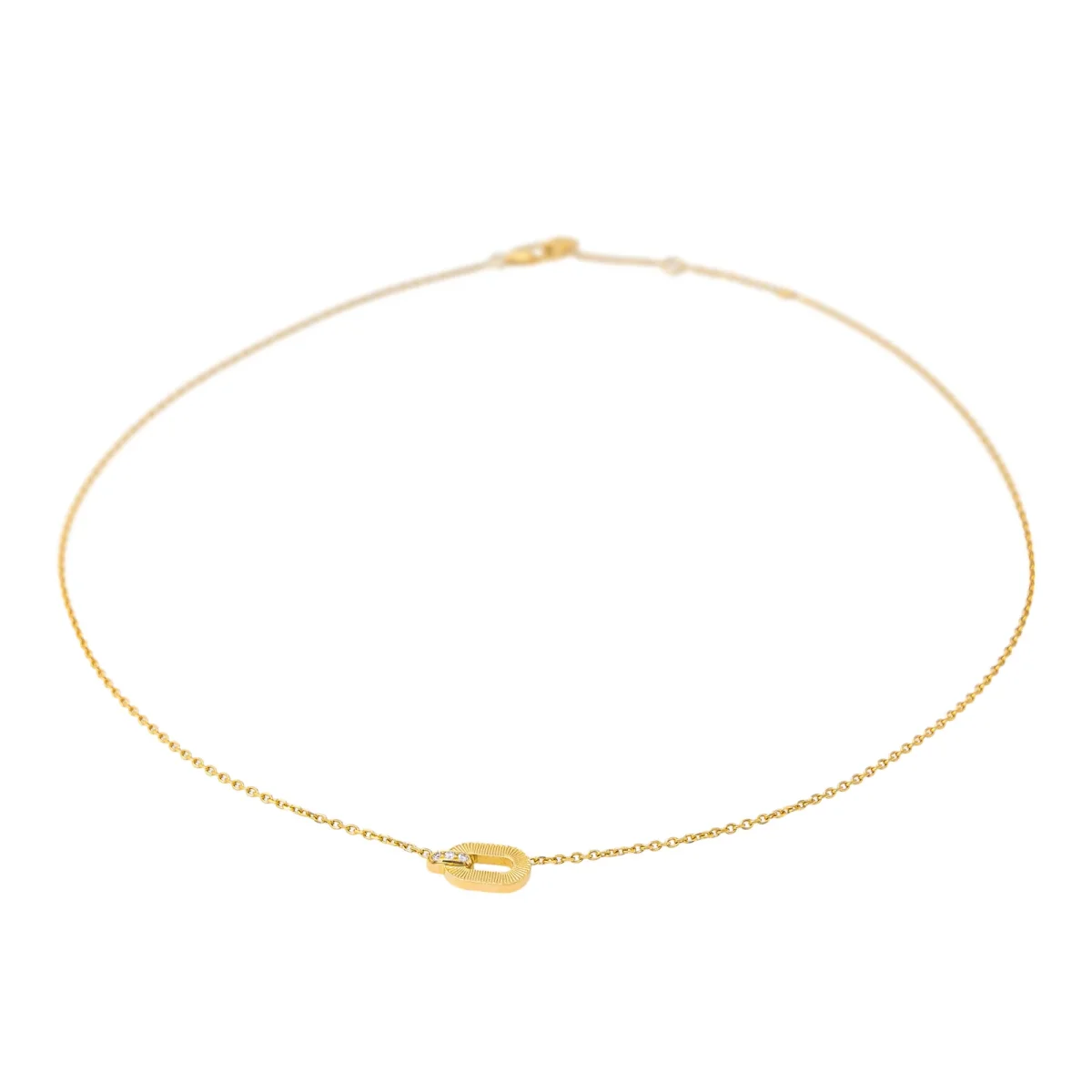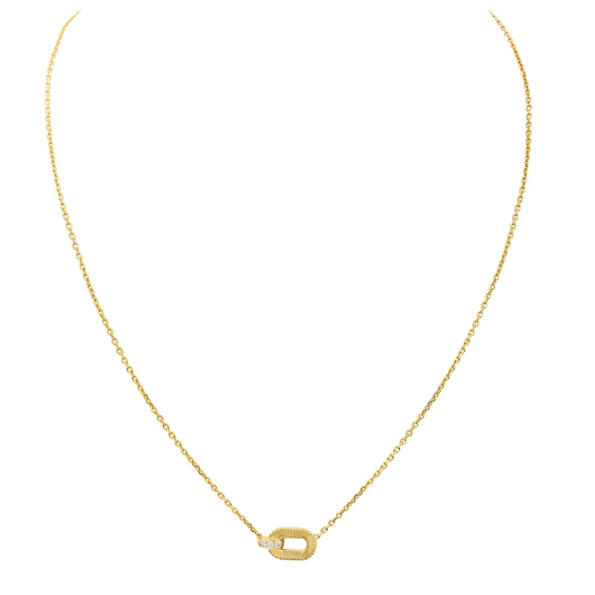Collier signé de la Maison Arthus Bertrand en or jaune 750 millièmes (18 carats), collection Ruban, motifs géométriques sertis de 3 diamants, taille brillant, environ H-SI, d’un poids total d’environ 0,045 ct, (chaque dimants d’un poids d’environ 0,015 ct), maille froçat limé, longueur : 42 cm, longueur de la partie comprenant les motifs : 1,3 cm, largeur : 0,72 cm, poids total : 4,74 g, poinçon tête d’aigle, excellent état