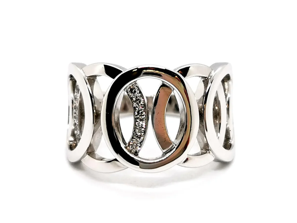 Bague signée de la maison Audemars Piguet, en or blanc 750 millièmes (18 carats), composée de 6 cercles entrelacés, un cercle pavé de 12 diamants taille brillant d’environ 0,01 ct chacun, environ G/VS, tour de doigt: 60, poids total diamant environ: 0,12 ct, largeur sur le dessus: 1,35 cm, poids total: 11,92 g, poinçon Hibou, numérotée: B2206, excellent état.