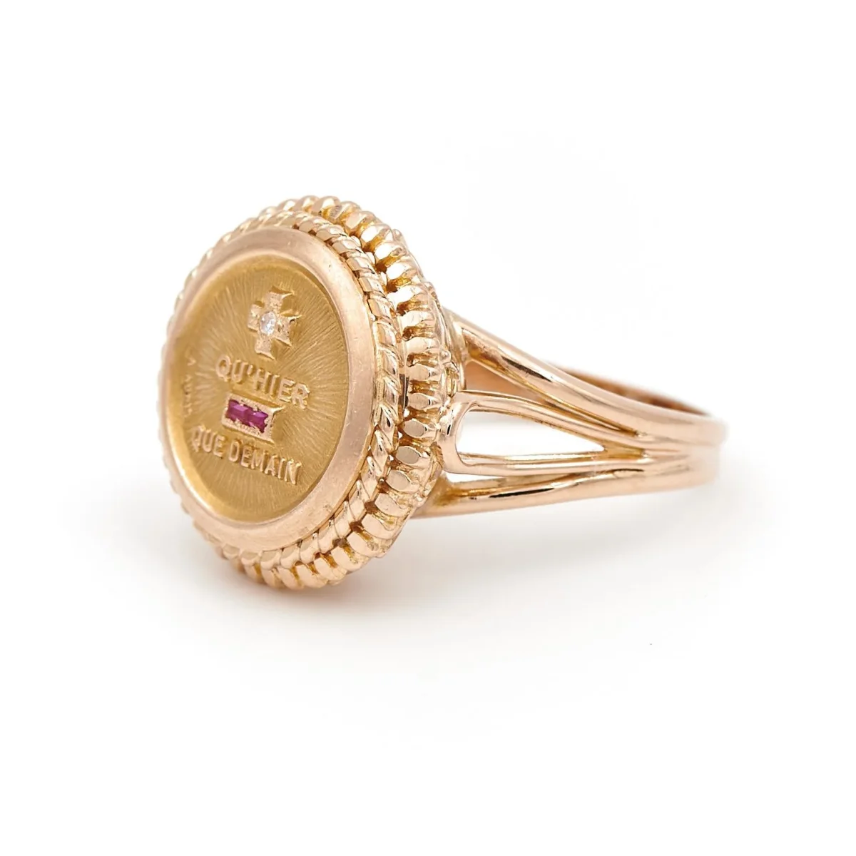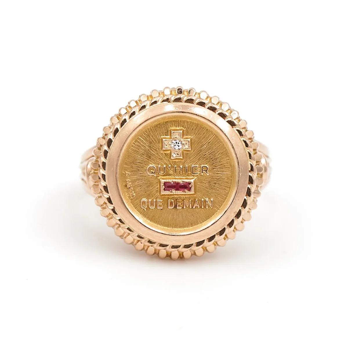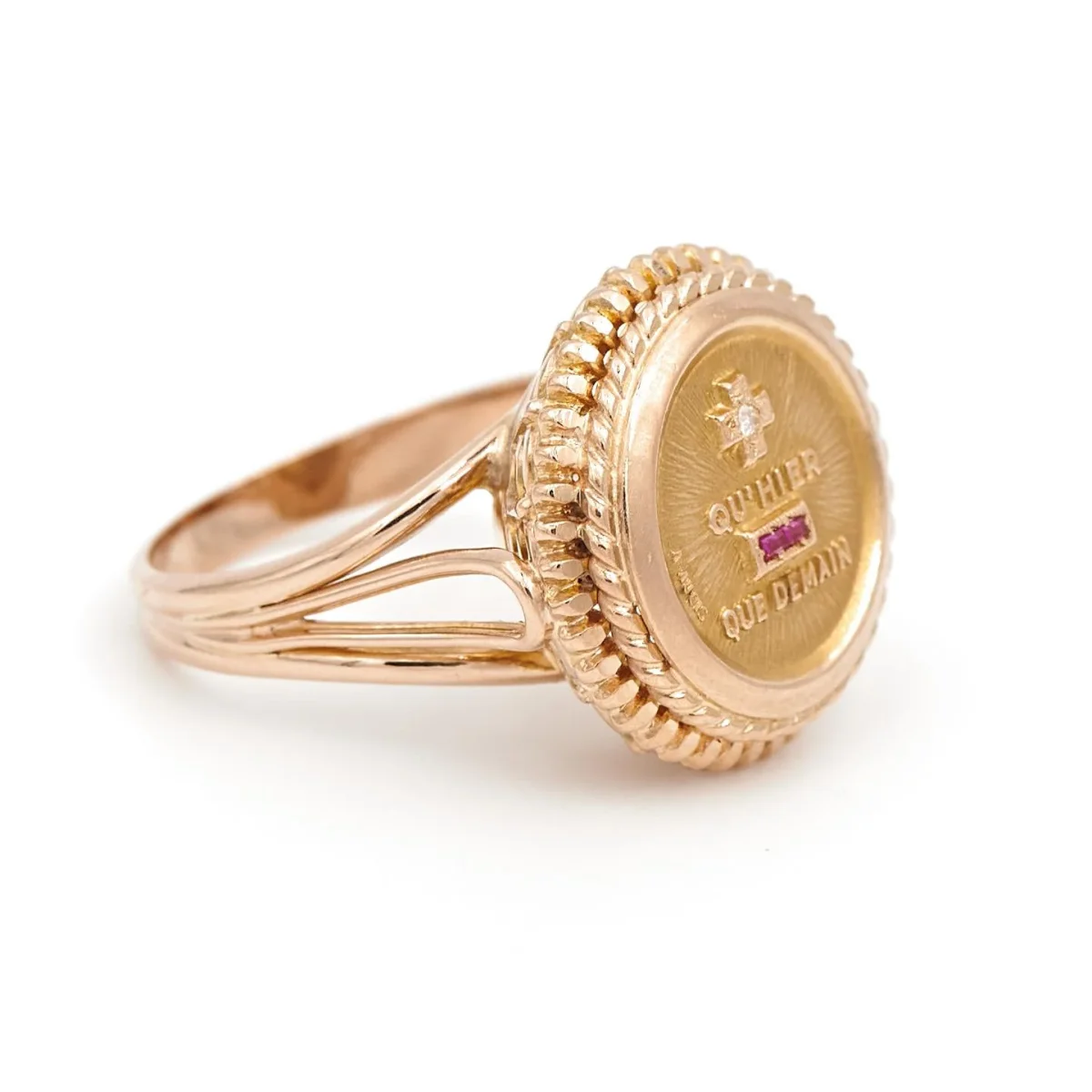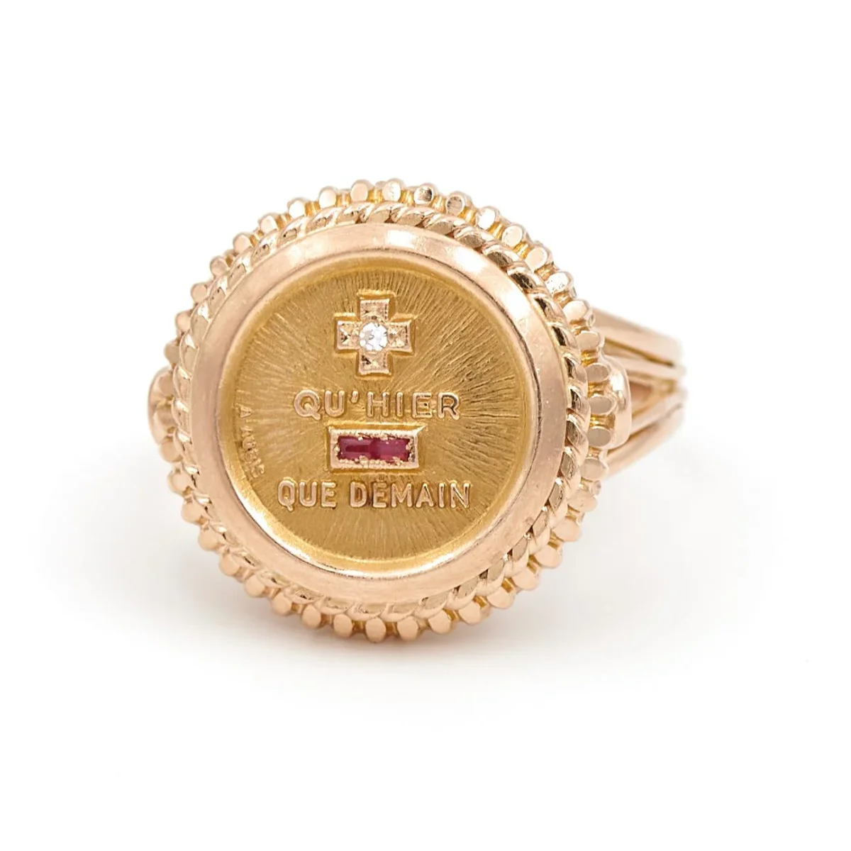 Bague signée Augis en or jaune 750 millièmes (18 carats), modèle + qu’hier – que demain, sertie de 2 rubis de taille baguette d’environ 0,005 ct chacun, Poids total des rubis: 0,01 ct, un diamant de taille brillant d’environ 0,01 ct estimé G/VS, Tour de doigt: 55, Largeur sur le dessus: 1,77 cm, Poids total: 7,67 g, Poinçon tête d’aigle, Excellent état