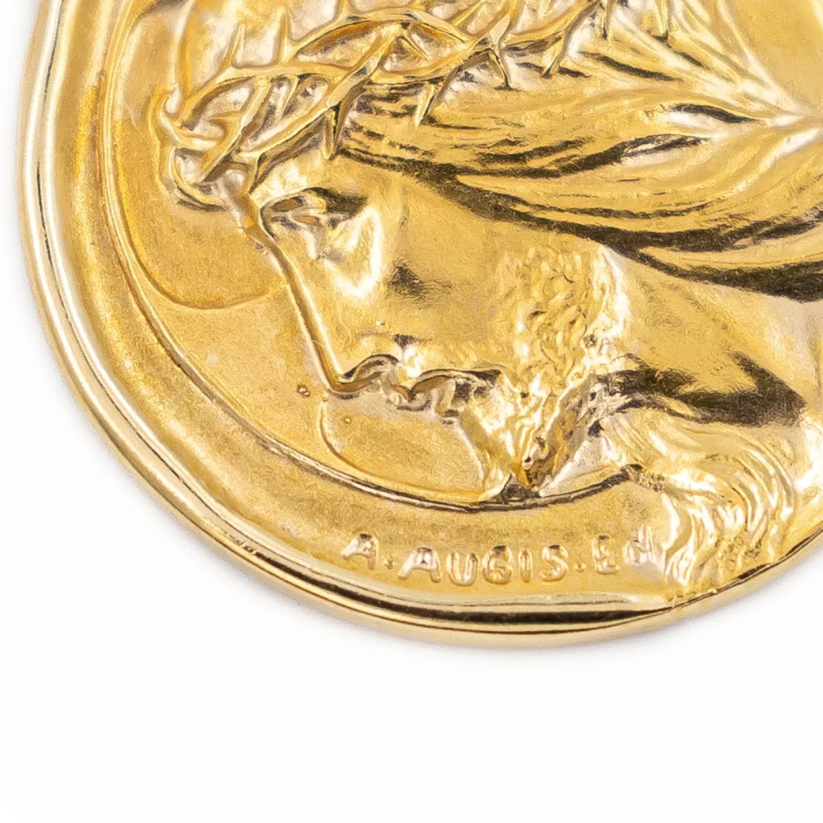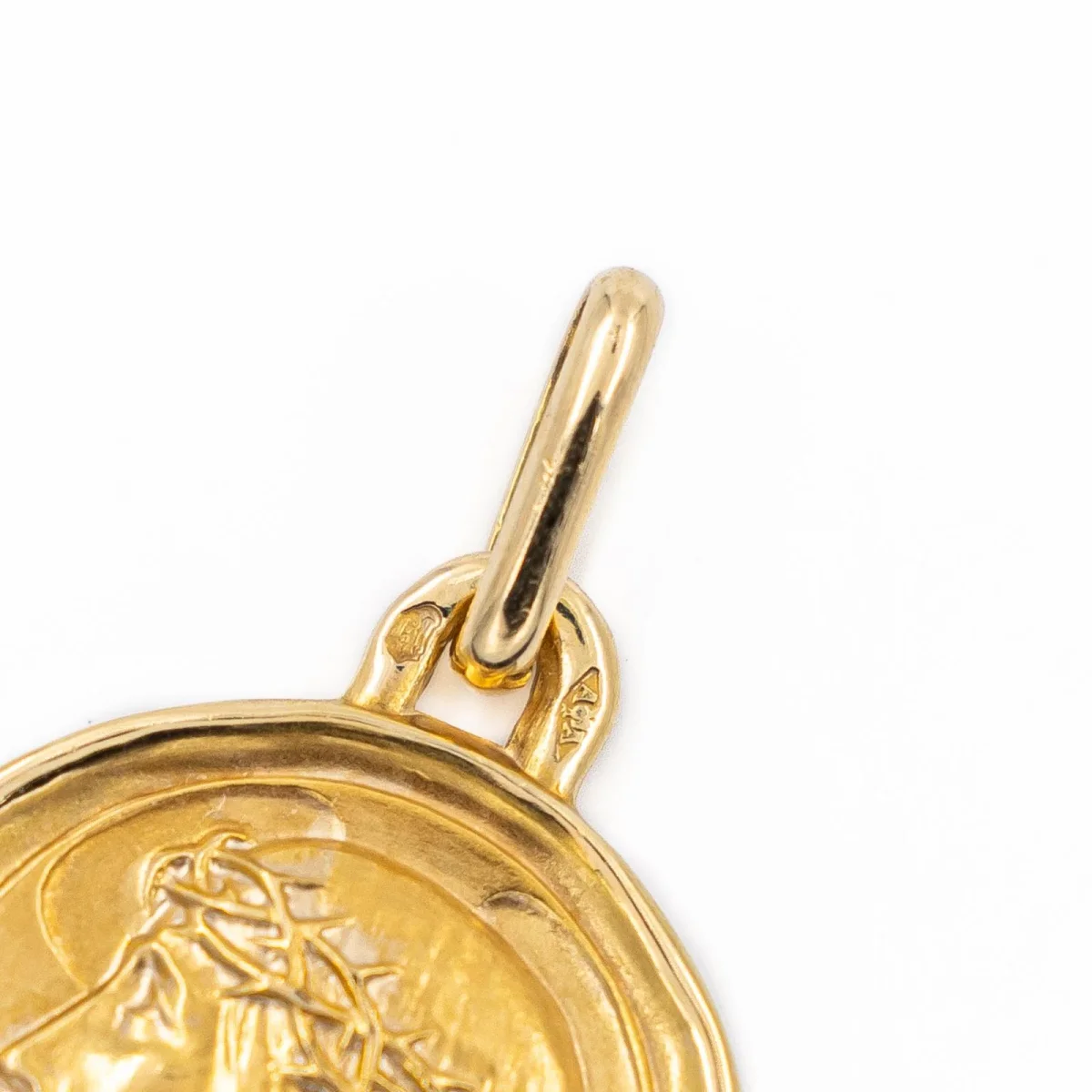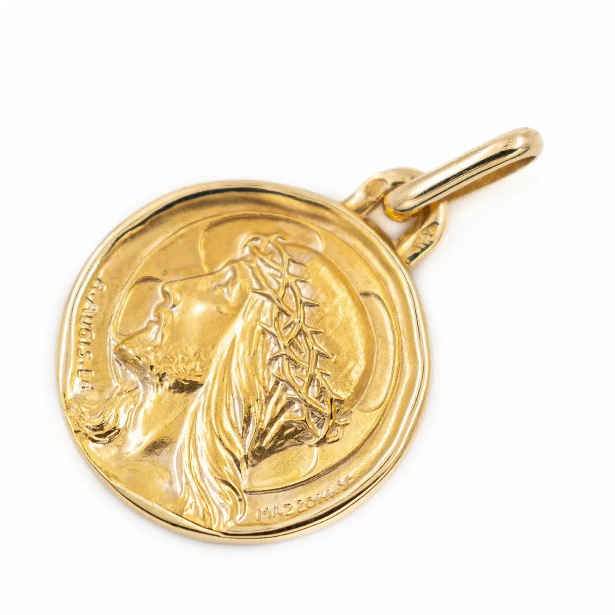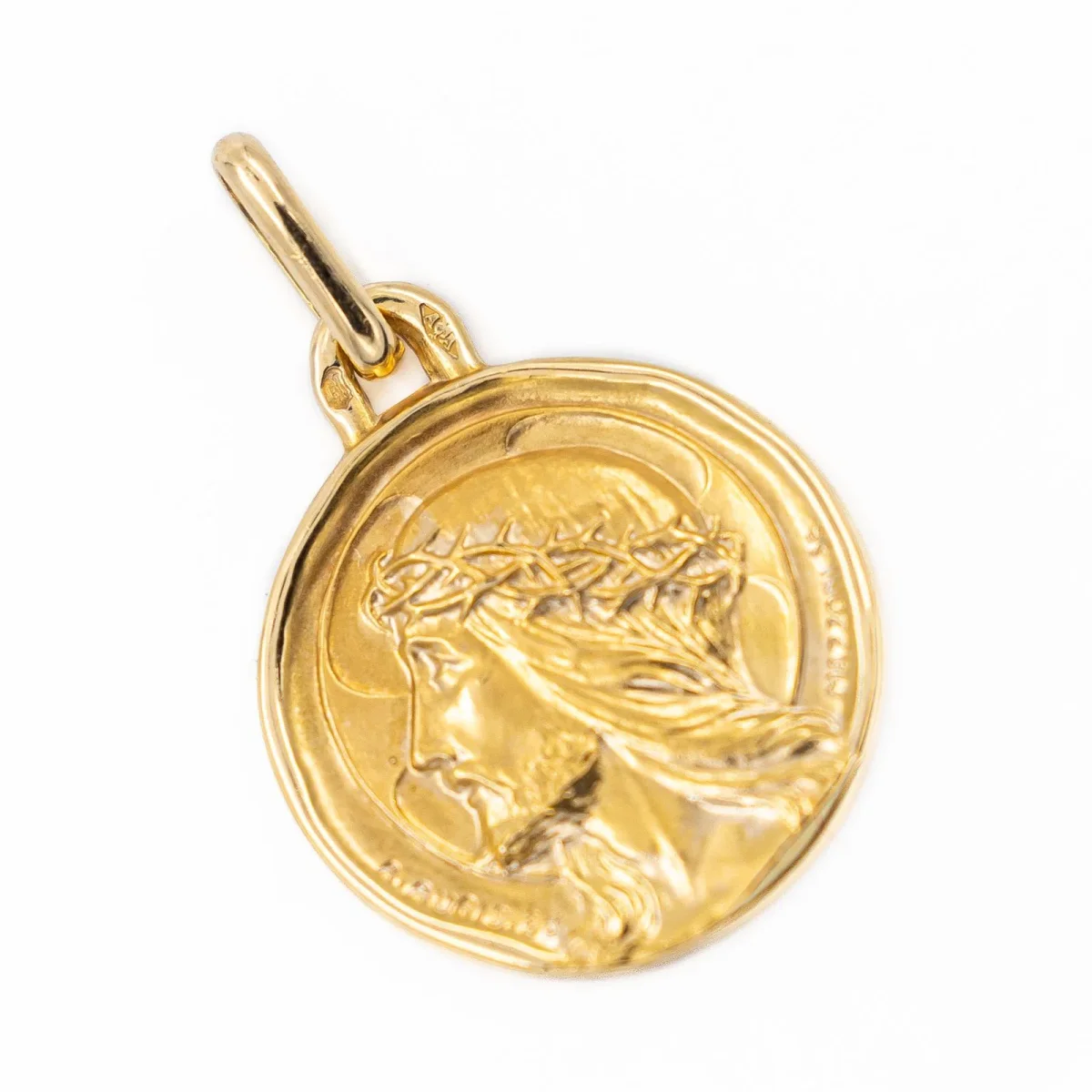 Pendentif en or jaune 750 millièmes (18 carats), médaille du Christ, dimensions ( sans la bélière) : 2,21 cm x 1,81 cm, taille de la bélière : 0,83 cm, poids total : 3,91 g, poinçon tête d’aigle, excellent état