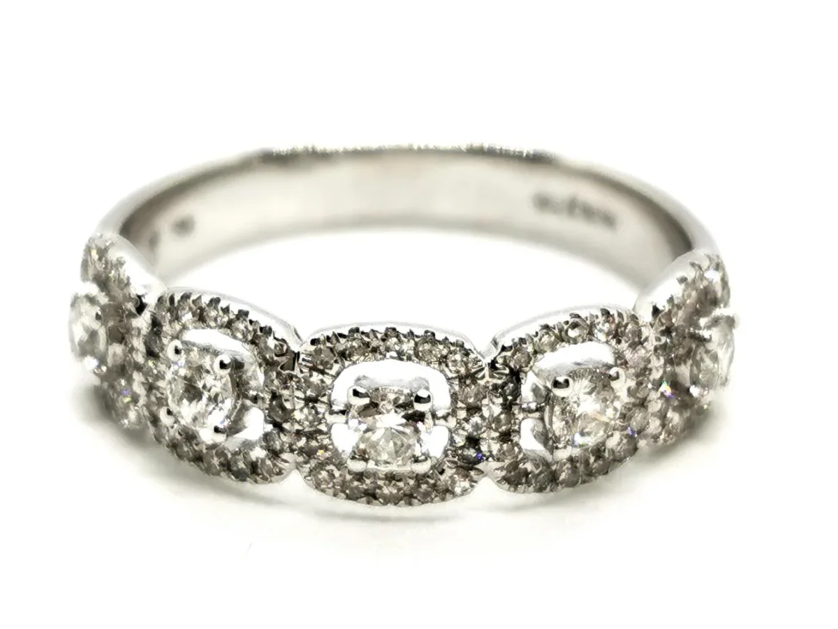 Alliance demi tour, en or blanc 750 millièmes (18 carats) testé, sertie de 85 diamants taille brillant environ FG-VS, (5 diamants d’environ 0,035 ct chacun et 80 diamants d’environ 0,005 ct chacun), diamants d’un poids total d’environ 0,0,5750 ct, largeur sur le dessus: 0,52 cm, taille de doigt: 50, poids total: 2,53 g, poinçon tête d’aigle, excellent état