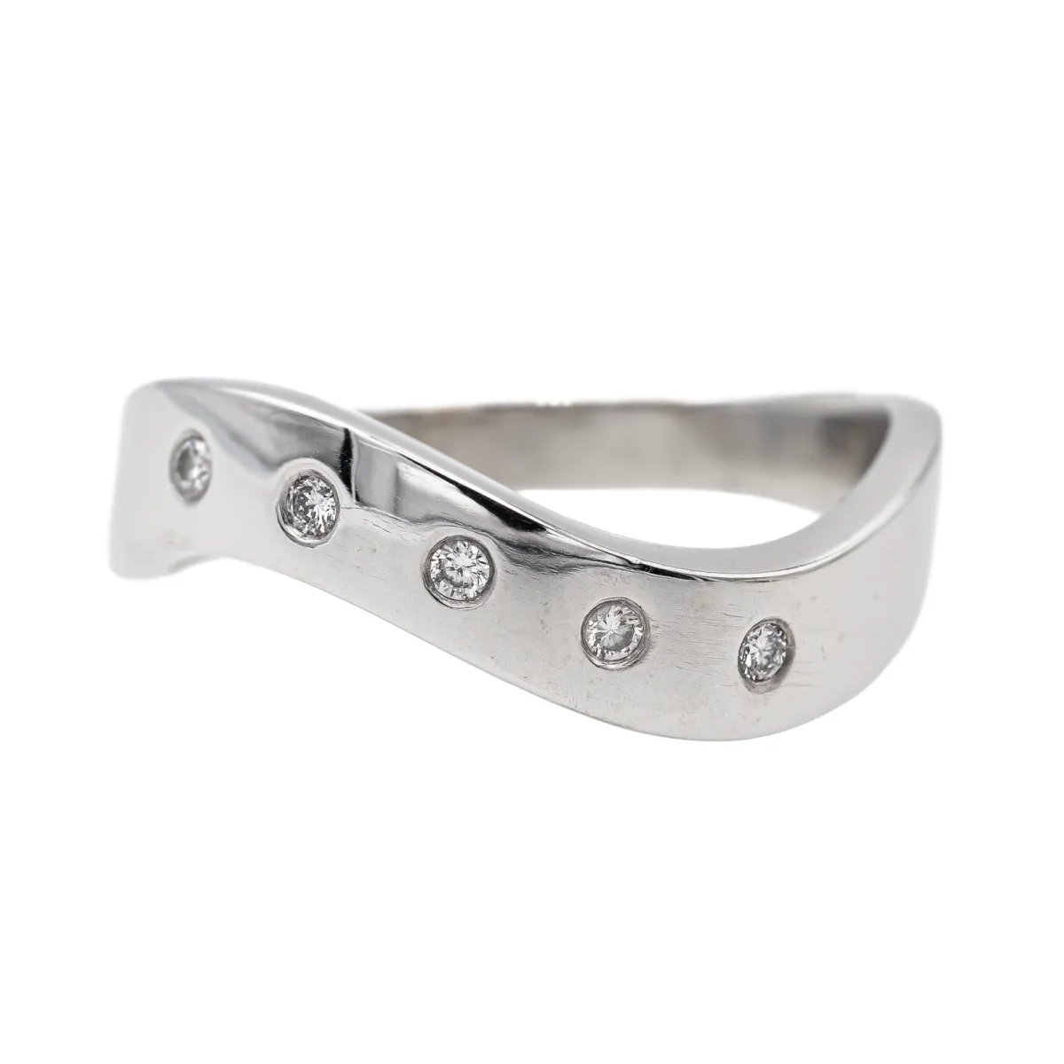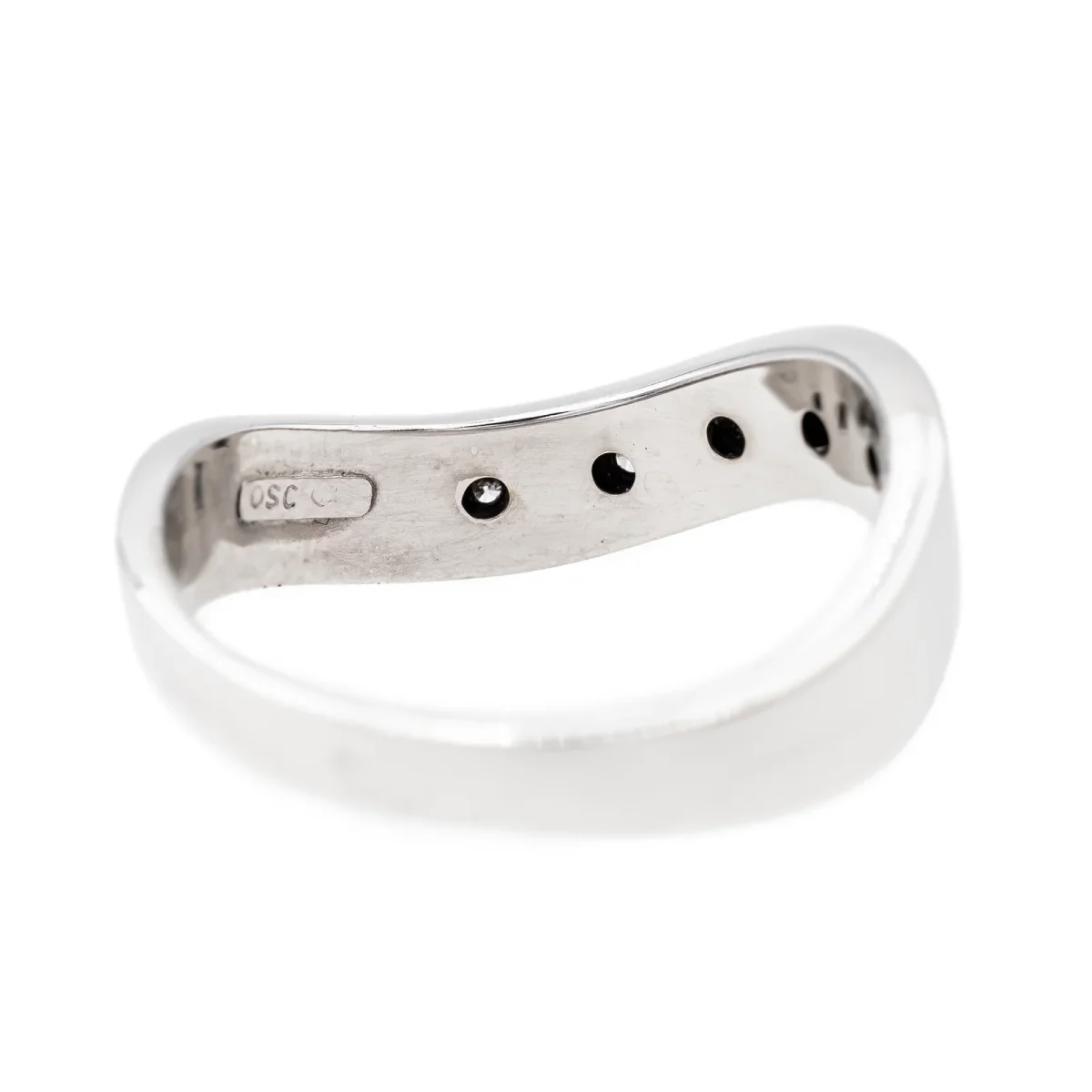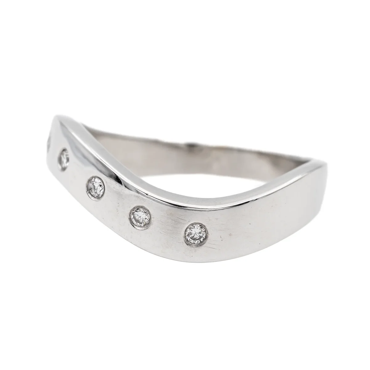 Alliance en or blanc 750 millièmes (18 carats), sertie de 5 diamants taille brillant estimés H/SI, d’environ 0,02 ct chacun, poids total diamants: environ 0,10 ct, largeur sur le dessus: 0,48 cm, tour de doigt: 63, poids total: 5,15 g, poinçon hibou, excellent état