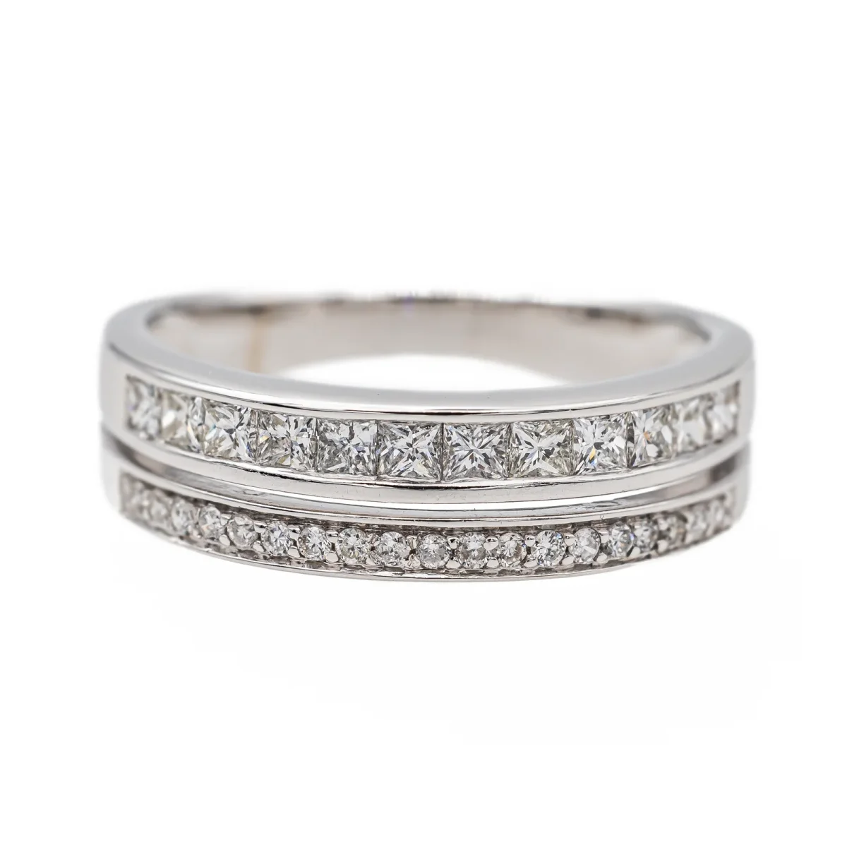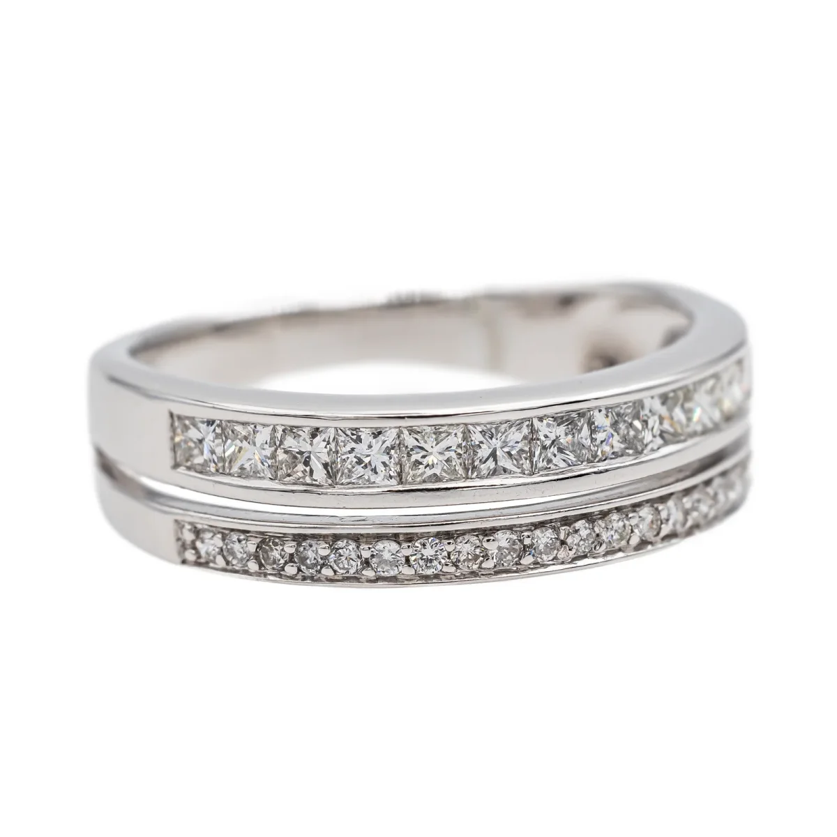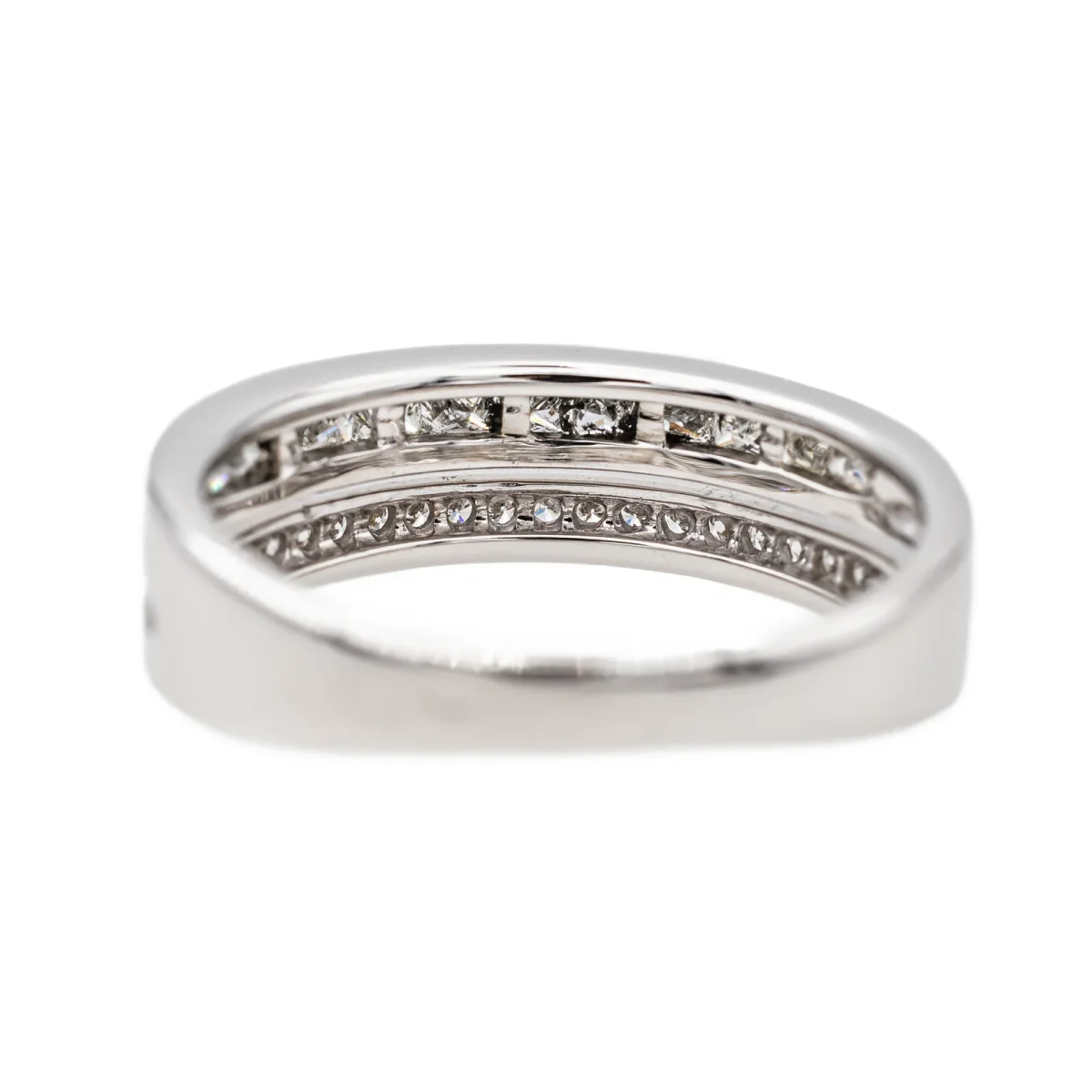 Demi-alliance en or blanc 750 millièmes (18 carats), sertie de 19 diamants taille brillant environ H-VS, d’environ 0,005 ct chacun, et de 12 diamants taille princesse environ H-VS, d’un poids d’environ 0,03 ct chacun, poids total diamants : environ 0,45 ct, largeur sur le dessus : 0,55 cm, tour de doigt : 52, poids total : 3,71 g, poinçon hibou, excellent état