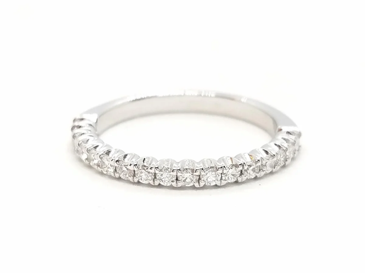 Demie alliance en or blanc 750 millièmes (18 carats), sertie de 17 diamants taille brillant F-VS pour 0,34 ct au total, tour de doigt: 53, largeur: 0,21 cm, poids total: 2,51 g, poinçon tête d’aigle, état neuf