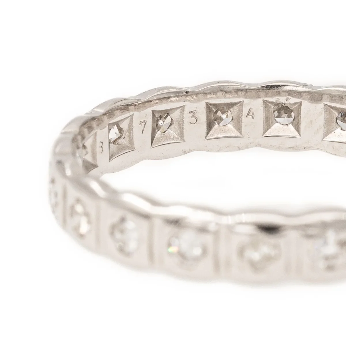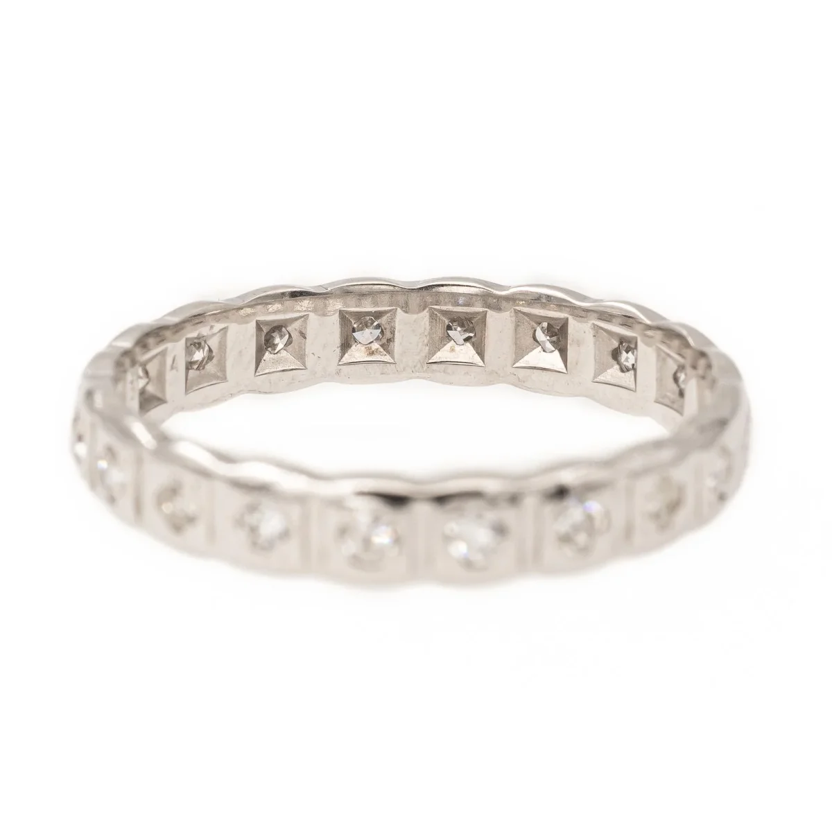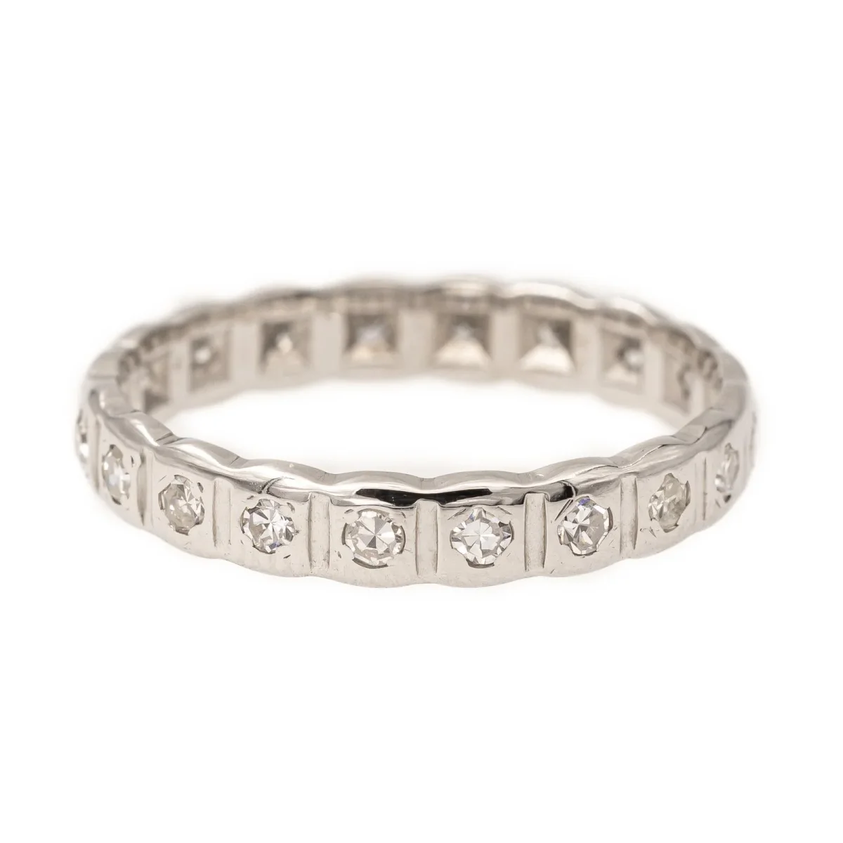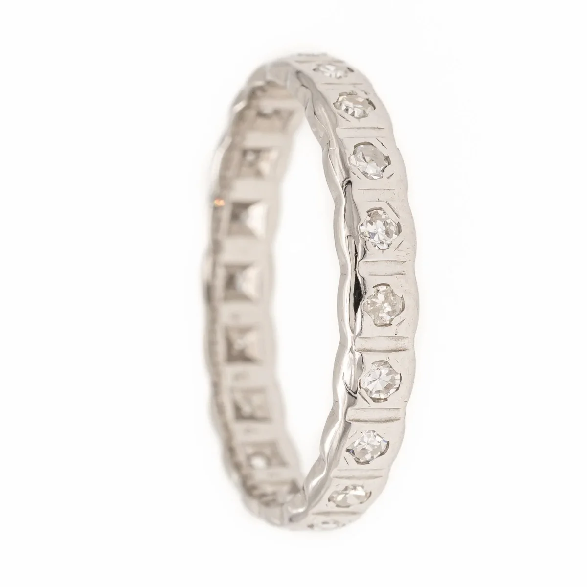 Alliance en or blanc 750 millièmes (18 carats) testé, sertie de 20 diamants, taille brillant, estimés H/VS, environ 0,01 ct chacun, Poids total des diamants: 0,20 ct, Tour de doigt: 52, Largeur sur le dessus : 0,32 cm, Poids total: 2,14 g, Excellent état