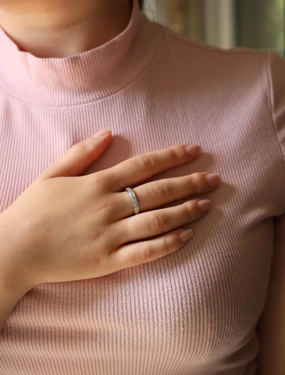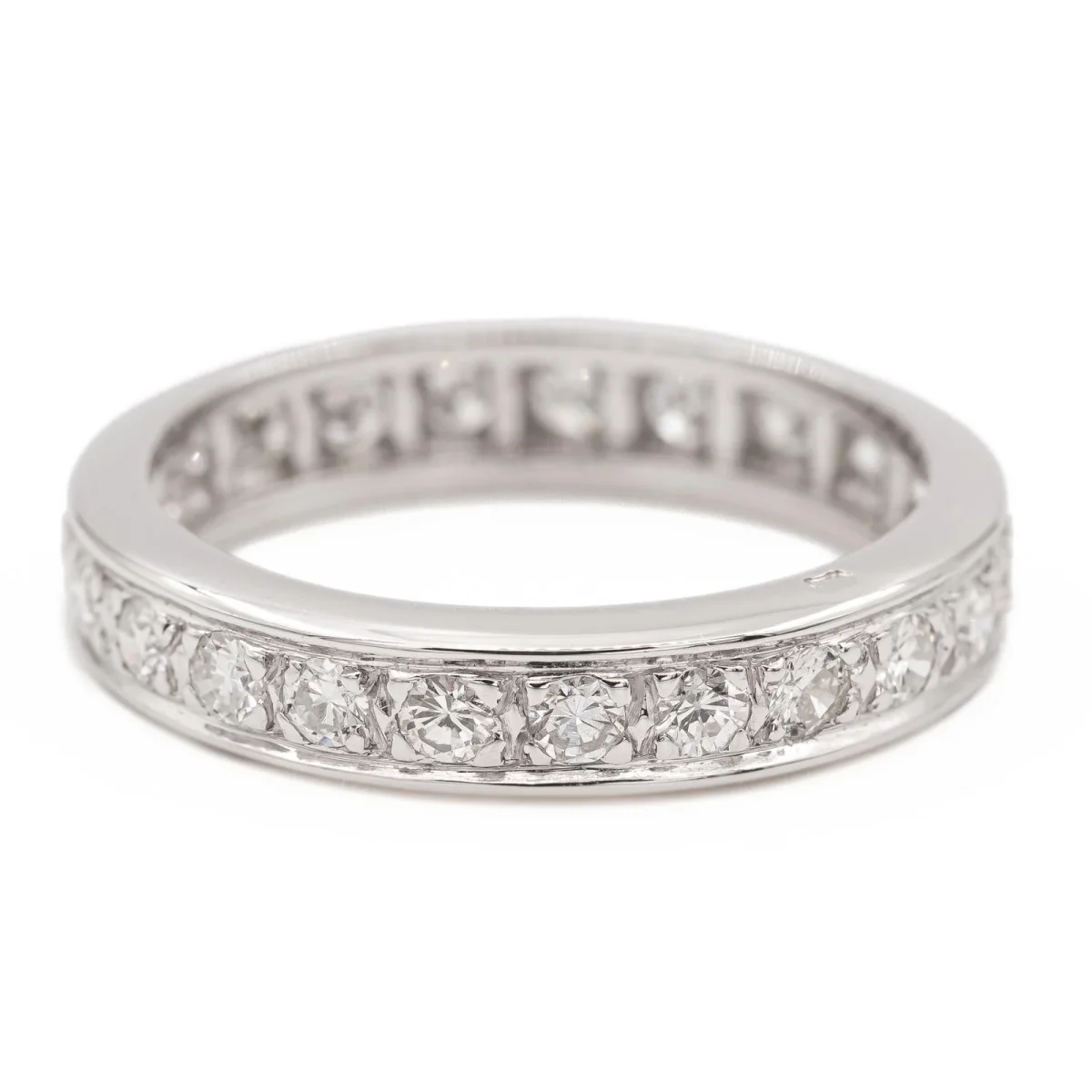 Alliance américaine en or blanc 750 millièmes (18 carats), sertie de 23 diamants taille brillant environ H-VS, d’environ 0,003 ct chacun, poids total diamant: environ 0,575 ct, largeur sur le dessus: 0,4 cm, tour de doigt: 53, poids total: 3,75 g, poinçon tête d’aigle, excellent état