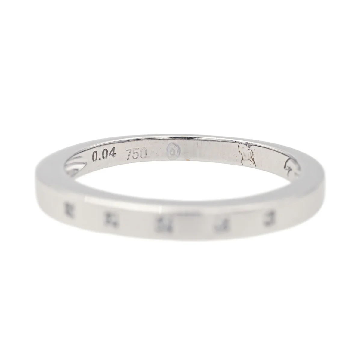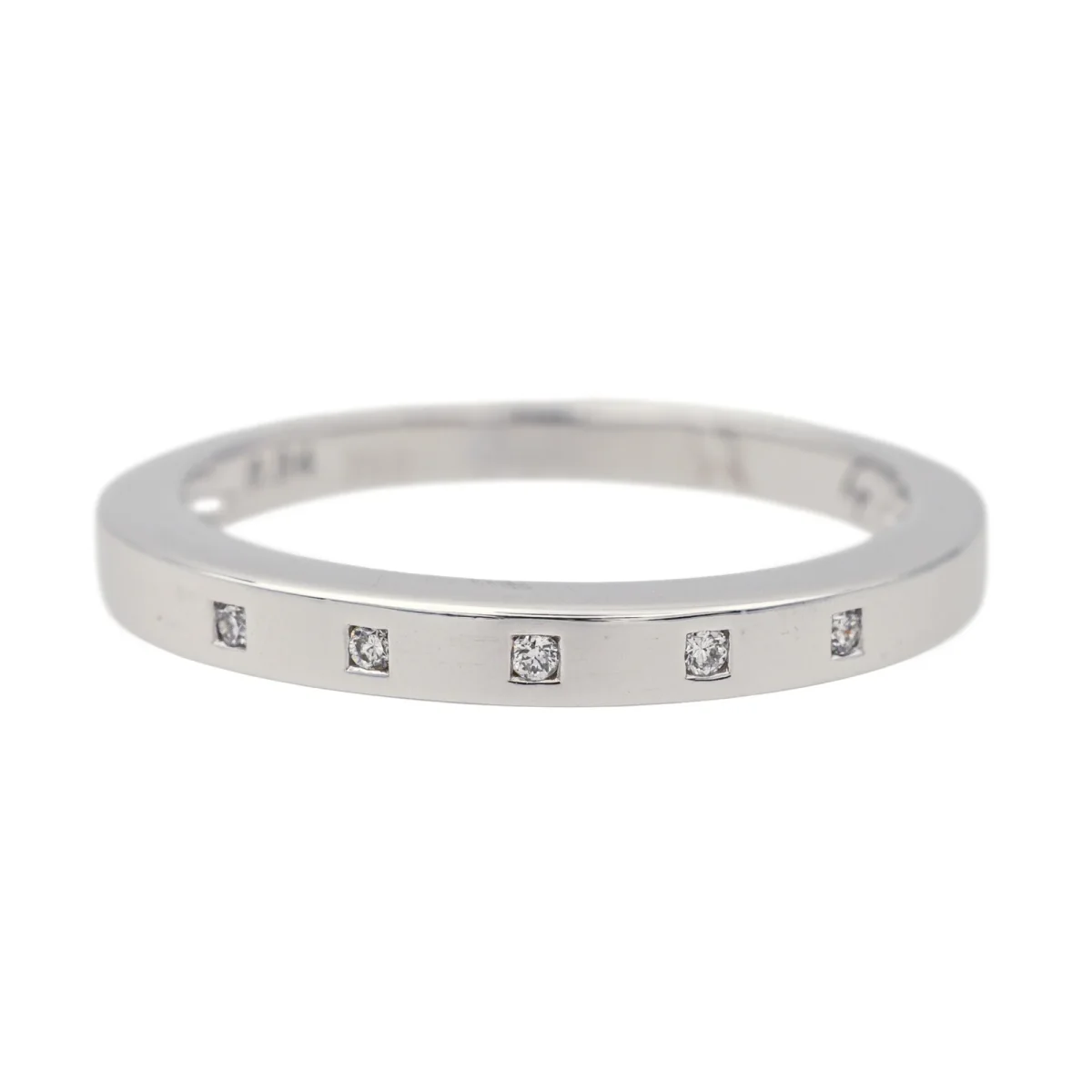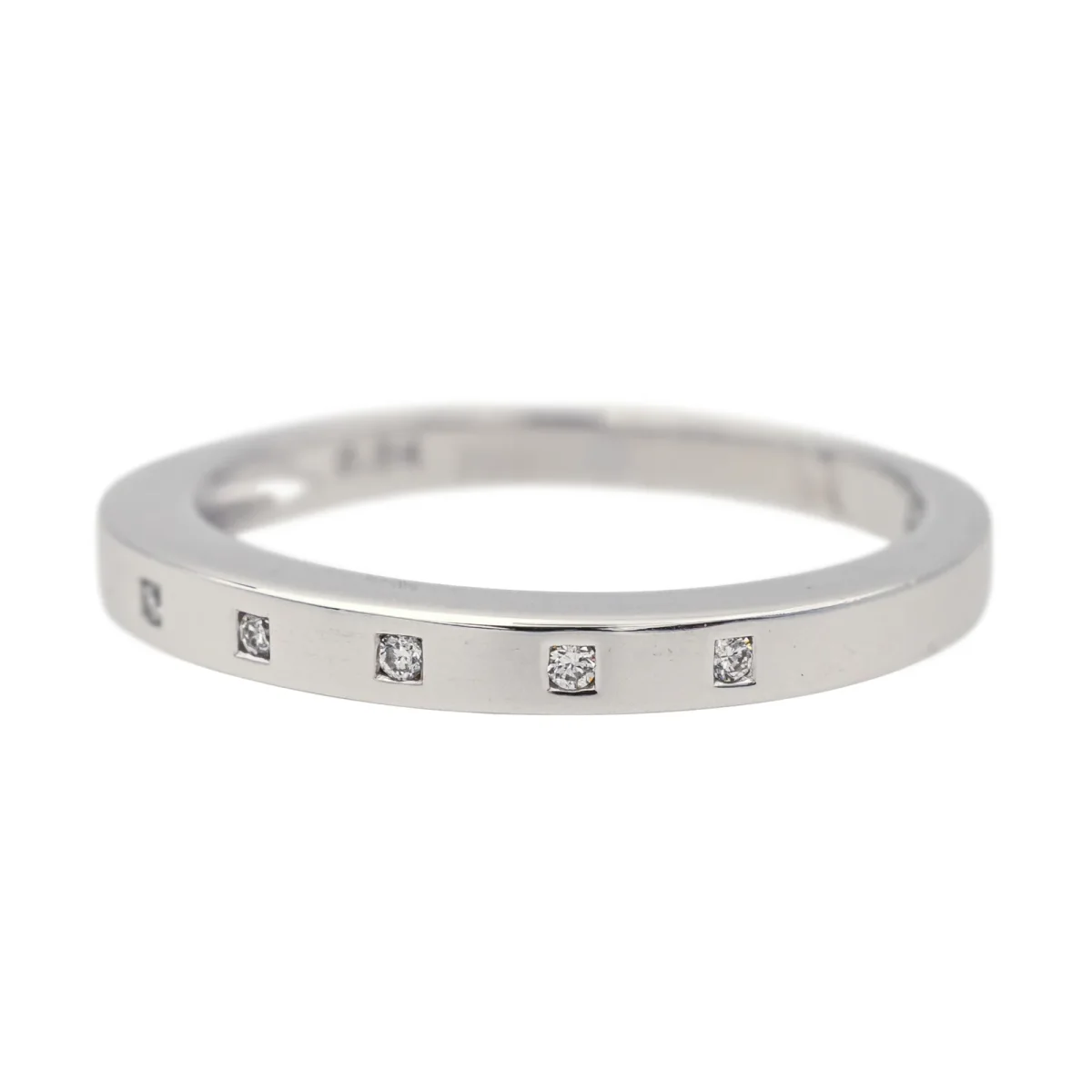 Alliance en or blanc 750 millièmes (18 carats), sertie de 5 diamants taille brillant environ G-VS, d’environ 0,005 ct chacun, poids total diamants : environ 0,02 ct, largeur sur le dessus : 0,25 cm, tour de doigt : 54, poids total : 3,27 g, poinçon tête d’aigle, excellent état