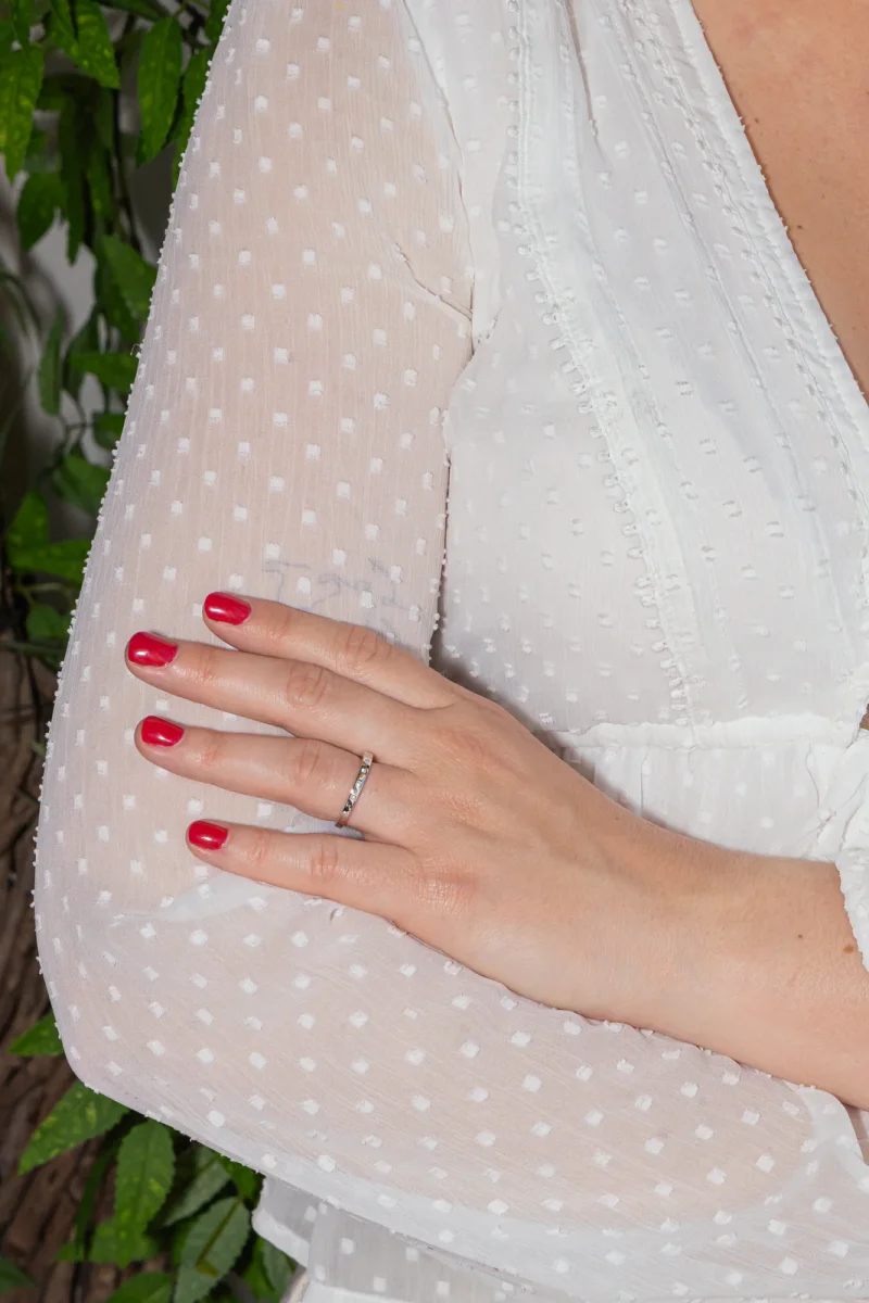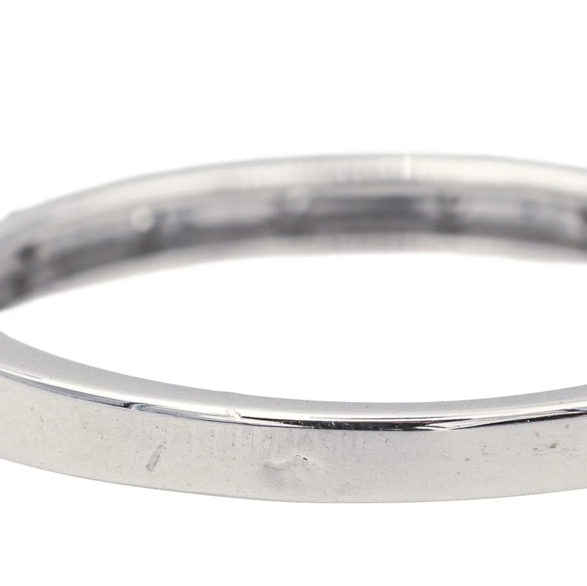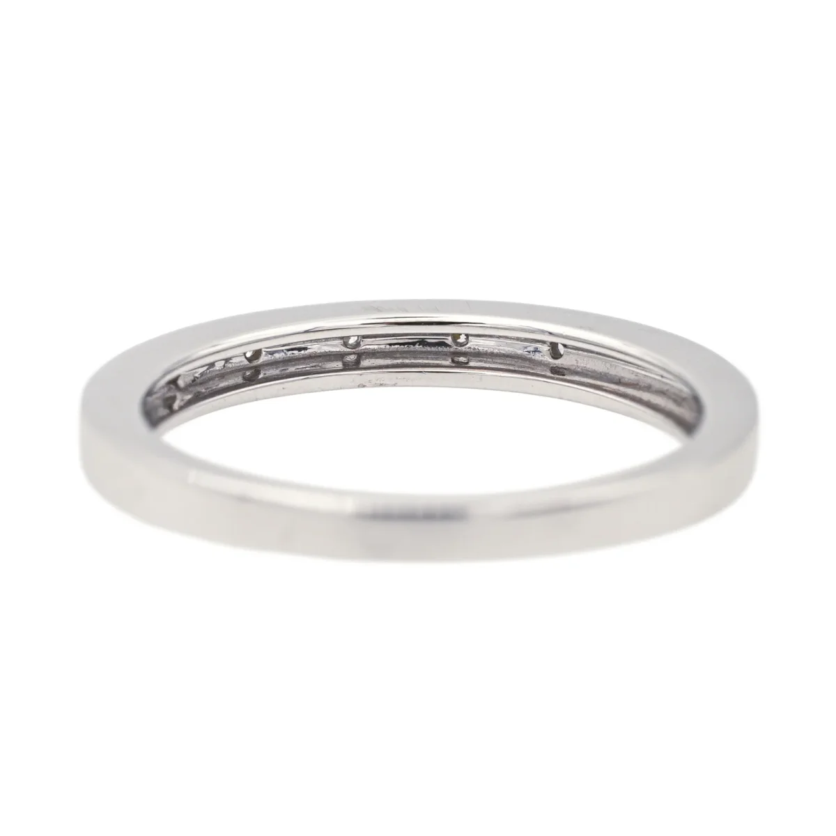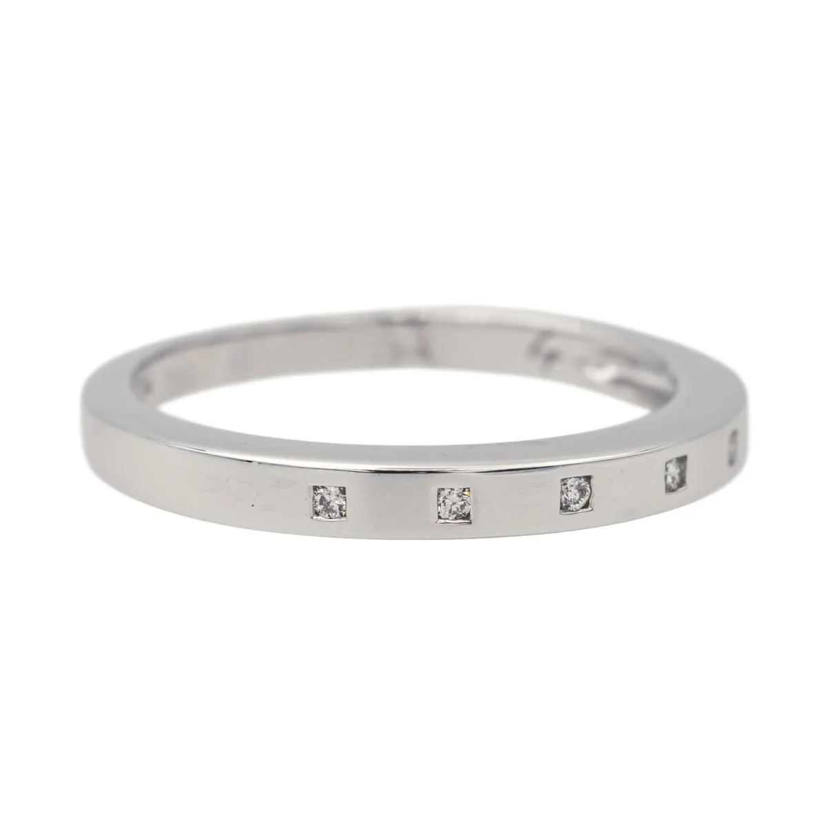 Alliance en or blanc 750 millièmes (18 carats), sertie de 5 diamants taille brillant environ G-VS, d’environ 0,005 ct chacun, poids total diamants : environ 0,02 ct, largeur sur le dessus : 0,25 cm, tour de doigt : 54, poids total : 3,27 g, poinçon tête d’aigle, excellent état