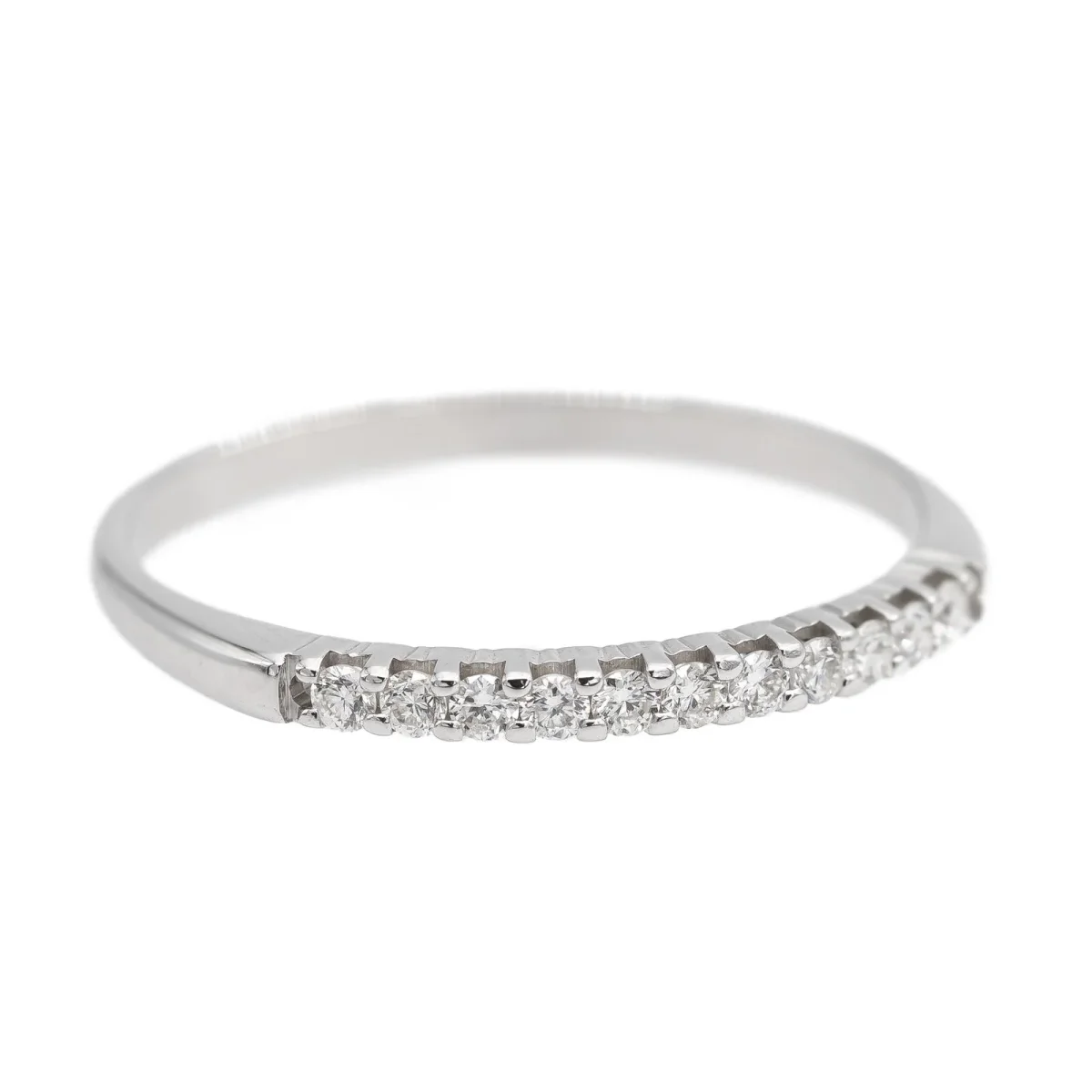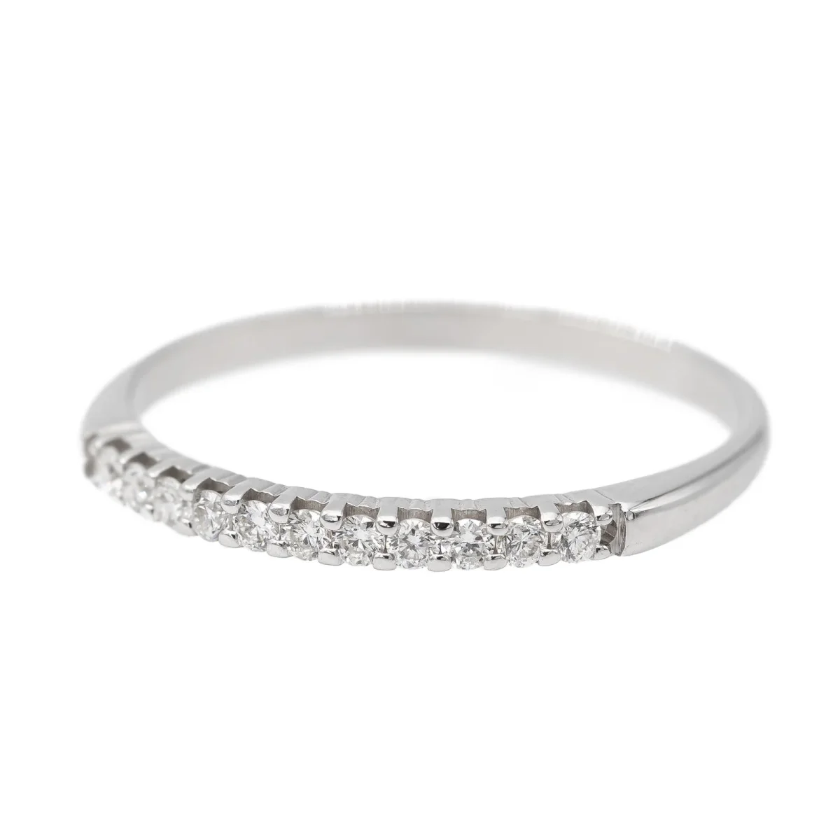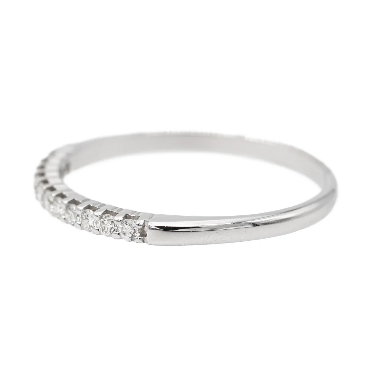 Demi alliance en or blanc 750 millièmes (18 carats), sertie de 11 diamants taille brillant environ I-VS, d’environ 0,005 ct chacun, poids total diamants: environ 0,055 ct, largeur sur le dessus: 0,15 cm, tour de doigt: 51, poids total: 1,16 g, poinçon tête d’aigle, excellent état