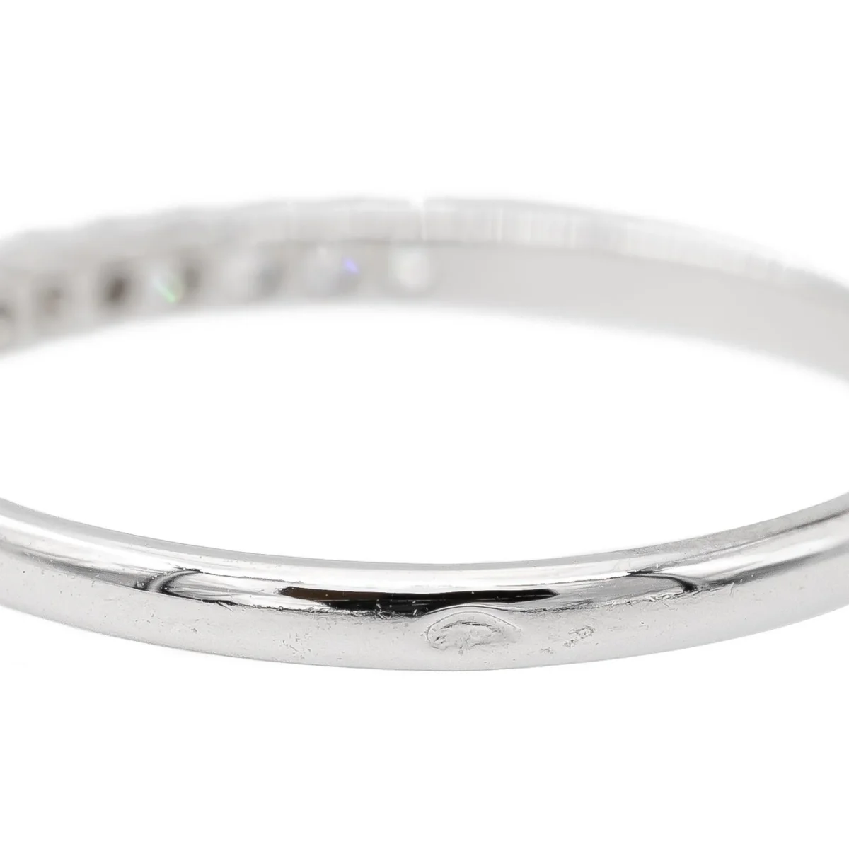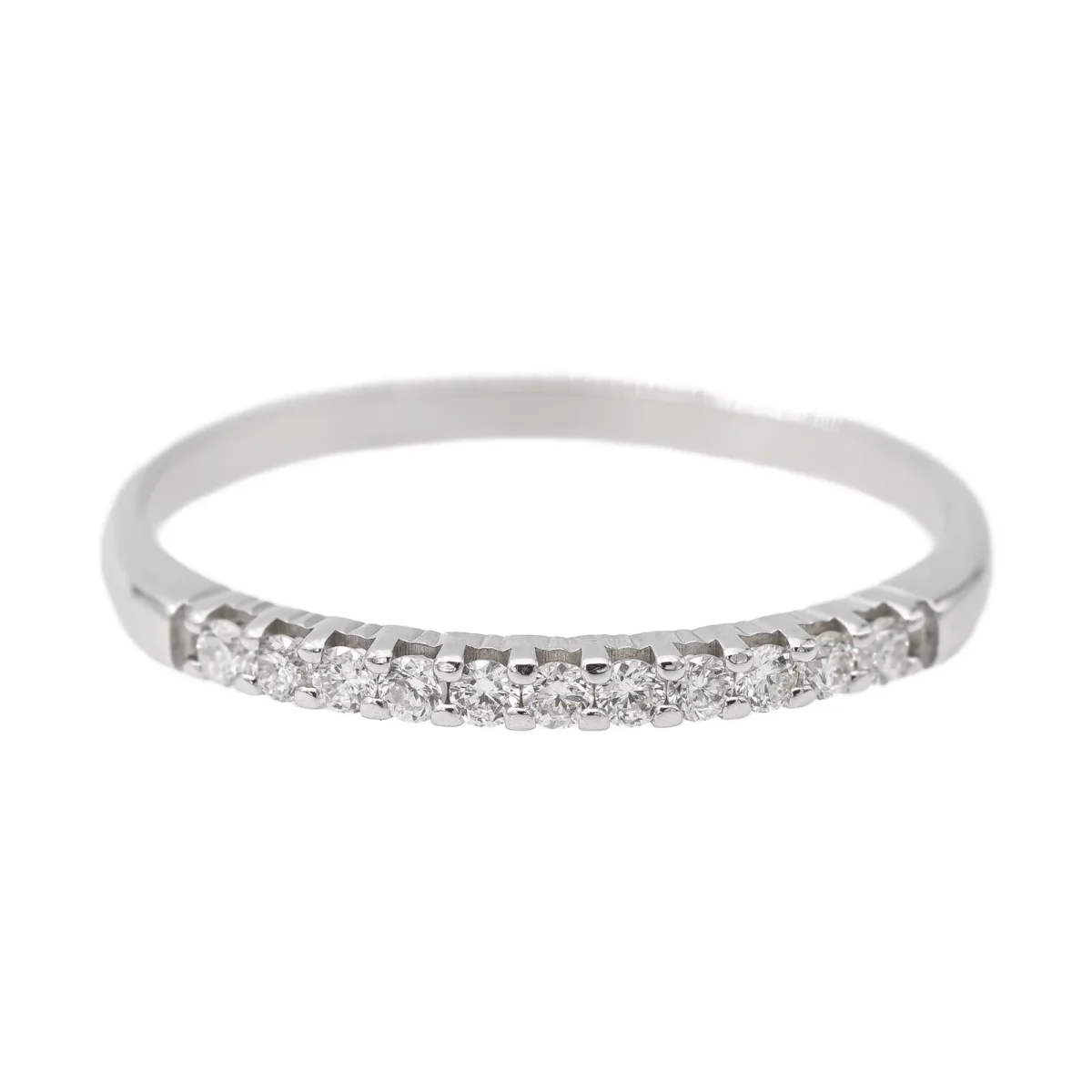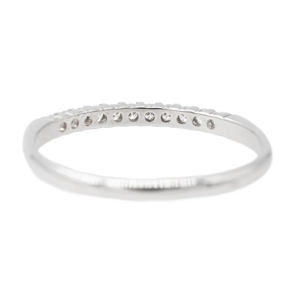 Demi alliance en or blanc 750 millièmes (18 carats), sertie de 11 diamants taille brillant environ I-VS, d’environ 0,005 ct chacun, poids total diamants: environ 0,055 ct, largeur sur le dessus: 0,15 cm, tour de doigt: 51, poids total: 1,16 g, poinçon tête d’aigle, excellent état