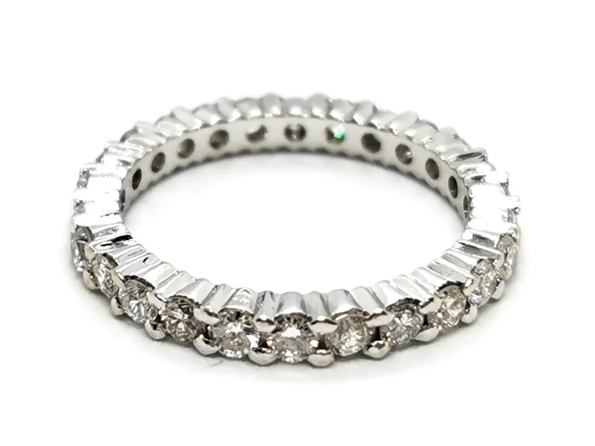 Alliance américaine en or blanc 750 millièmes (18 carats), sertie de 26 diamants taille brillant environ H-VS d’environ 0,035 ct chacun, poids total diamant: environ 0,91 ct, largeur sur le dessus: 0,24 cm, taille de doigt: 51, poids total: 2,75 g, poinçon tête d’aigle, excellent état