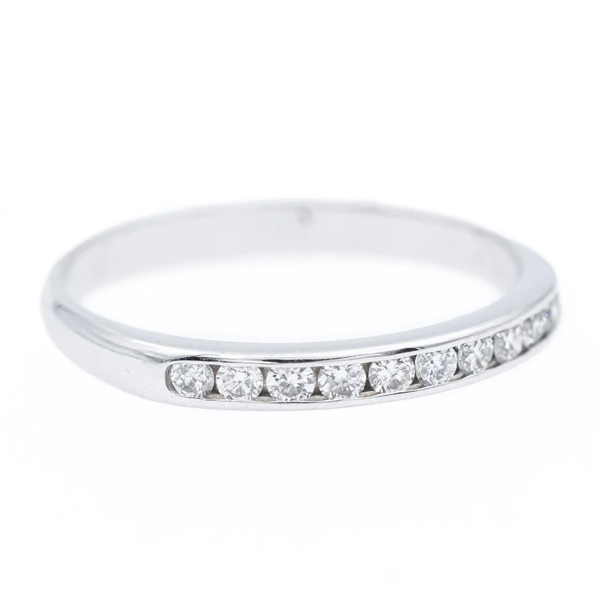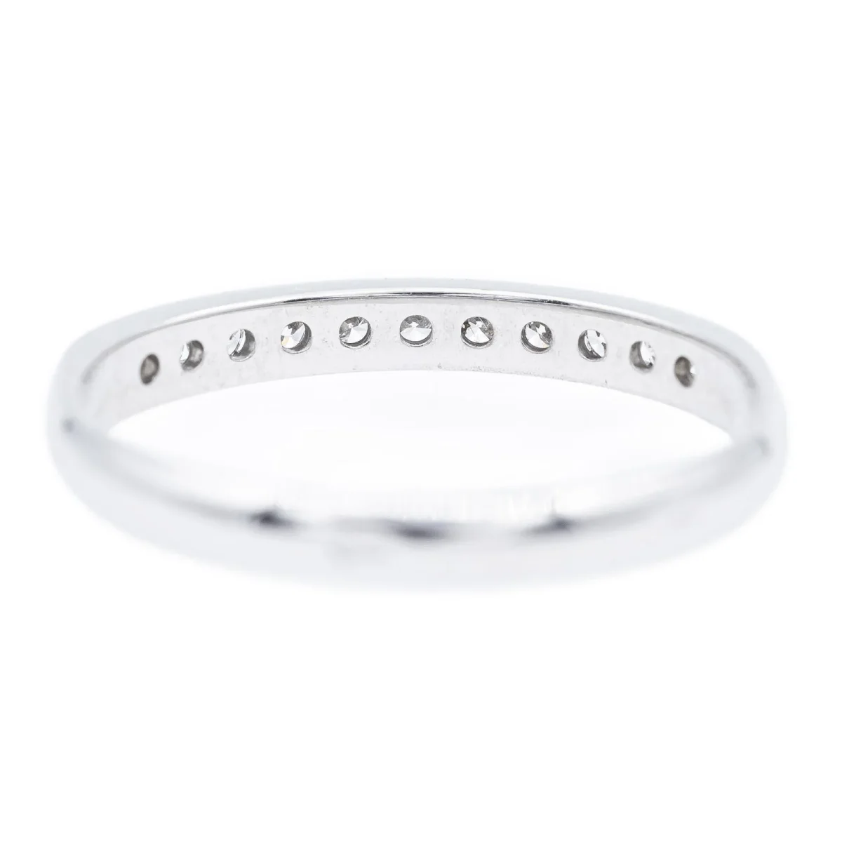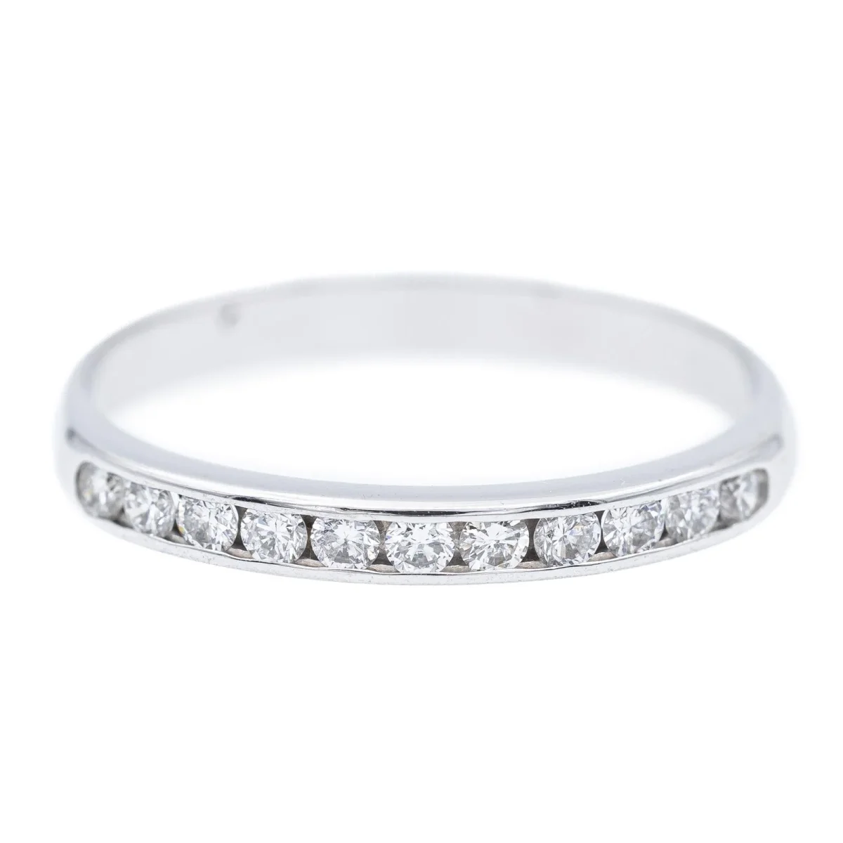 Demi alliance en or blanc 750 millièmes (18 carats), sertie de 11 diamants taille brillant environ G/VS, d’environ 0,02 ct chacun, poids total diamants: environ 0,22 ct, largeur sur le dessus: 0,2 cm, tour de doigt: 51, poids total: 1,64 g, poinçon tête d’aigle, excellent état