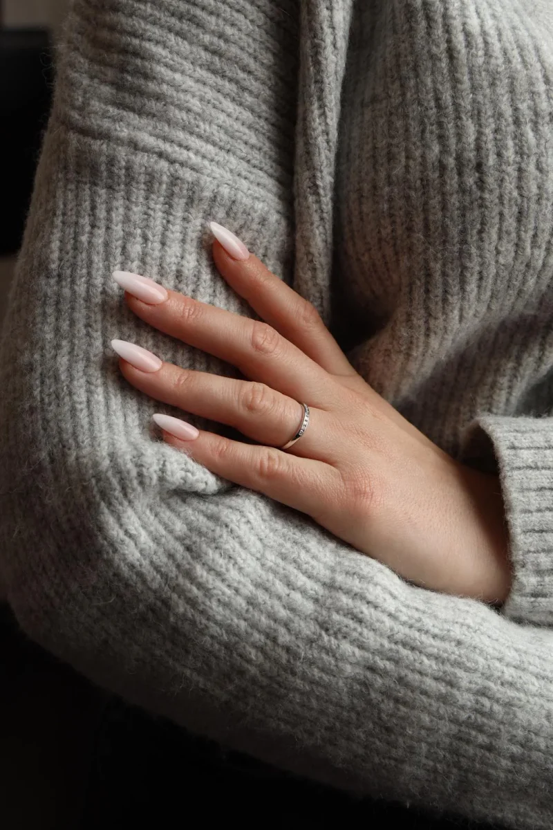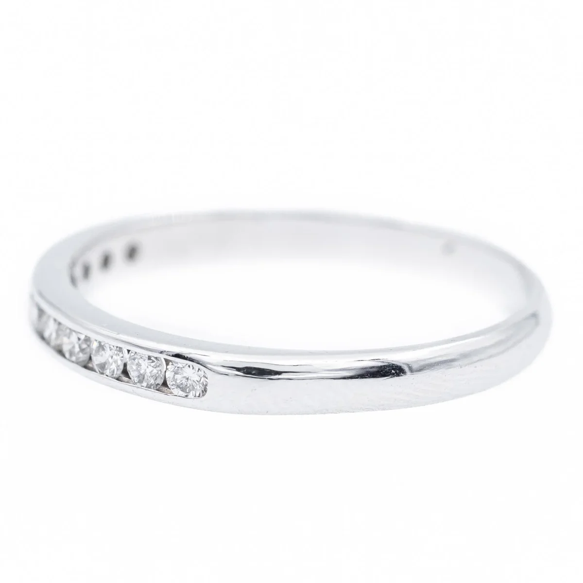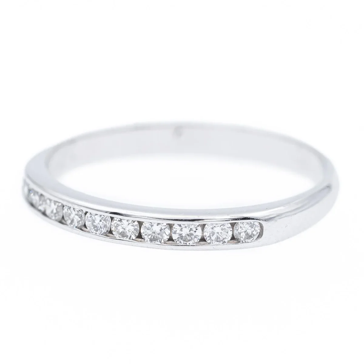 Demi alliance en or blanc 750 millièmes (18 carats), sertie de 11 diamants taille brillant environ G/VS, d’environ 0,02 ct chacun, poids total diamants: environ 0,22 ct, largeur sur le dessus: 0,2 cm, tour de doigt: 51, poids total: 1,64 g, poinçon tête d’aigle, excellent état