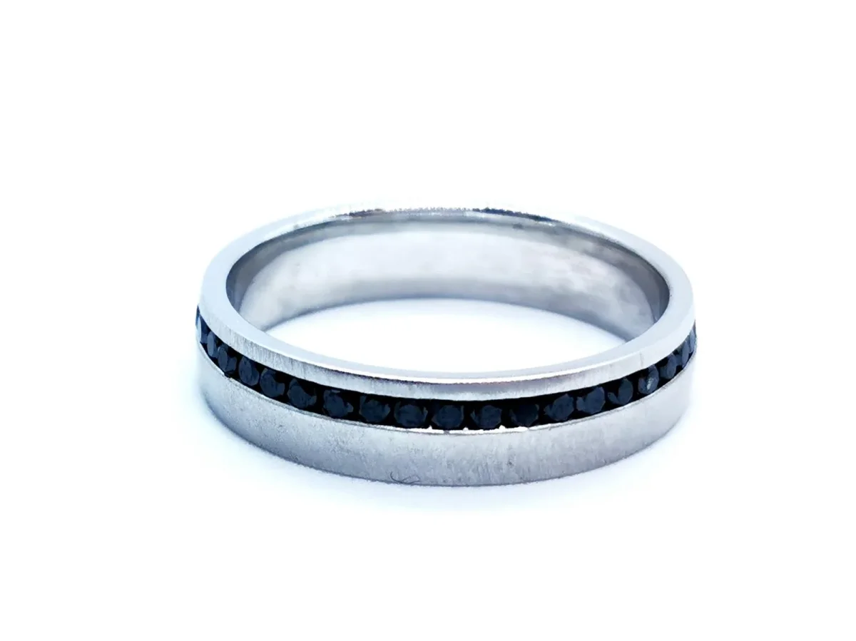Alliance en or blanc 750 millièmes (18 carats), or brossé mat, tour complet de diamants noir, taille brillant, pour environ 0,25 ct au total, taille: 59, largeur: 0,48 cm, poids total: 5,69 g, poinçon tête d’aigle, excellent état