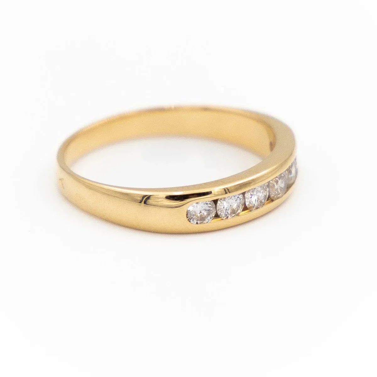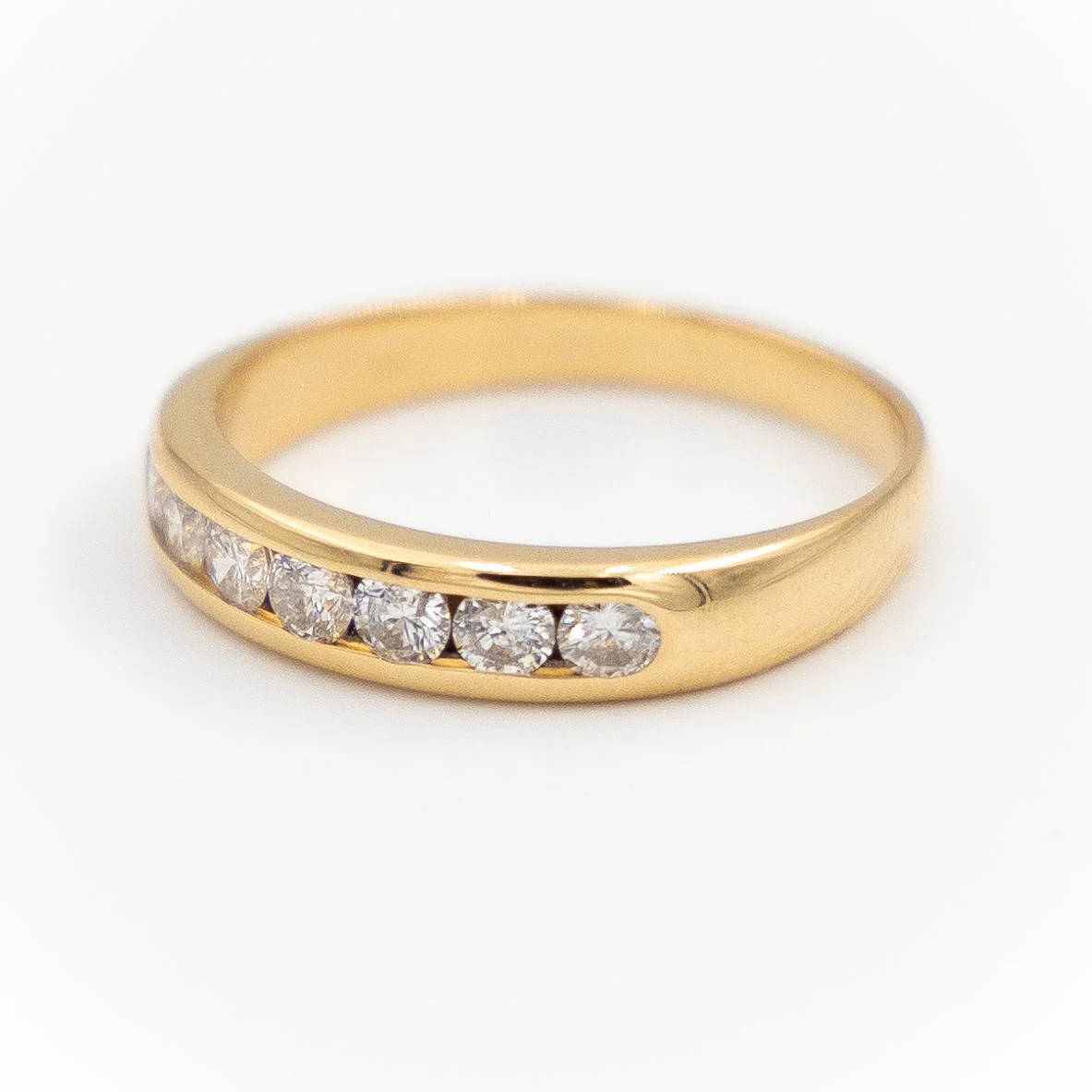 Alliance en or jaune 750 millièmes (18 carats), sertie sur la moitié du tour de 7 diamants de taille brillant, environ 0,10 ct chacun, estimés G/VS, Poids total des diamants: 0,70 carat, Tour de doigt: 54, Largeur sur le dessus: 0,40 cm, Poids total: 3,05 g, Poinçon hibou, Excellent état