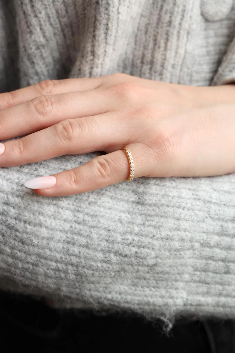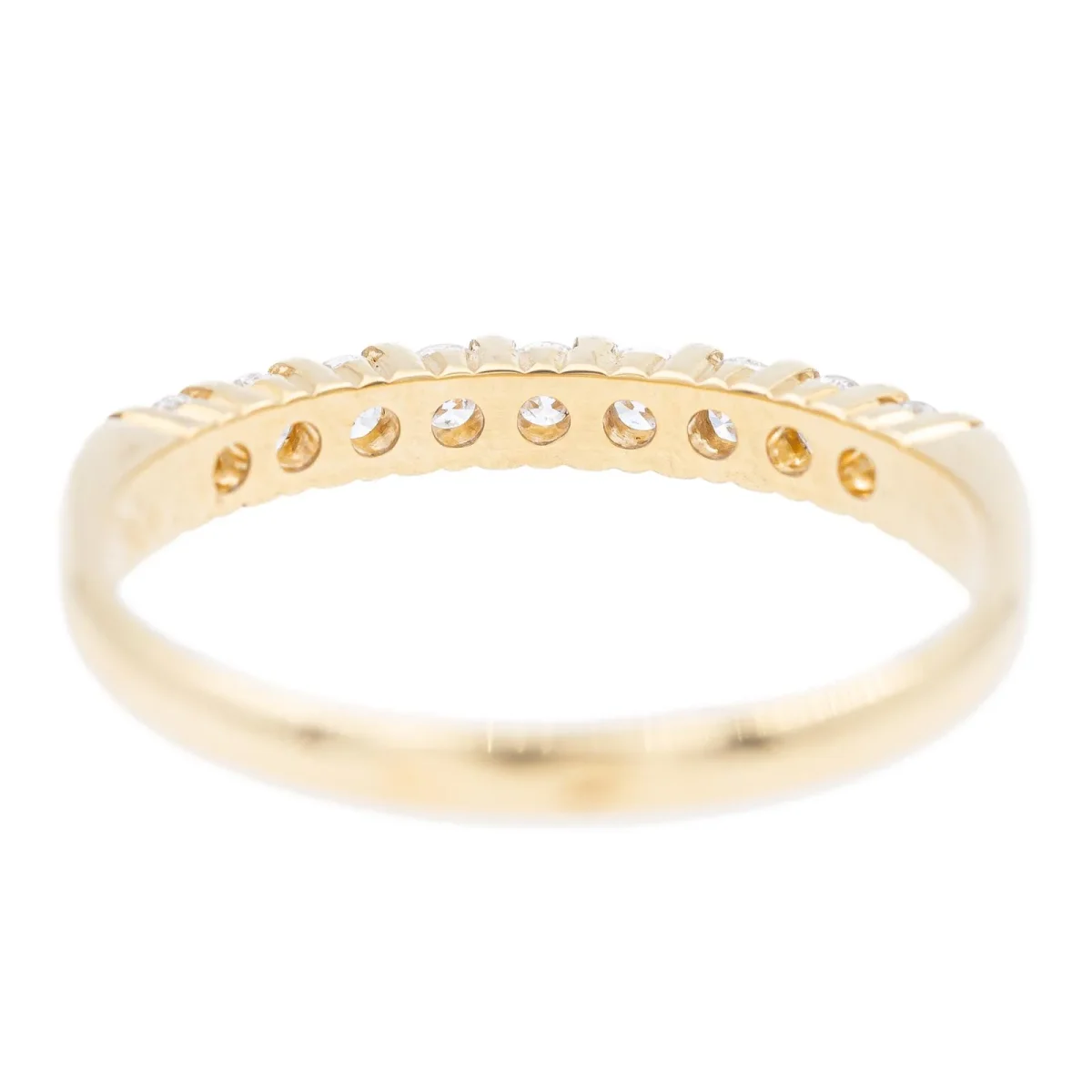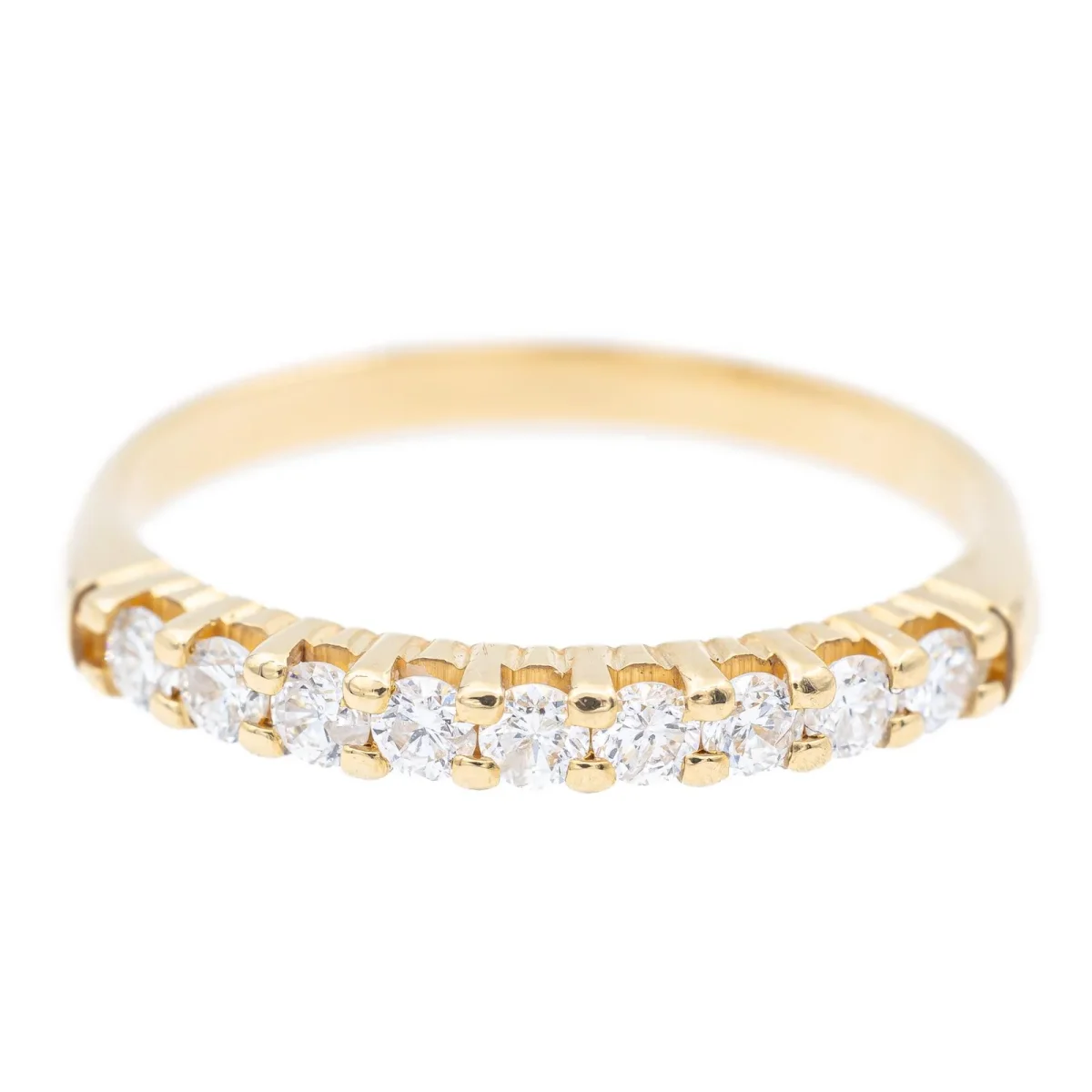 Demi alliance en or jaune 750 millièmes (18 carats), sertie de 9 diamants taille brillant environ H/VS, d’environ 0,02 ct chacun, poids total diamants: environ 0,18 ct, largeur sur le dessus: 0,2 cm, tour de doigt: 48, poids total: 1,57 g, poinçon tête d’aigle, excellent état