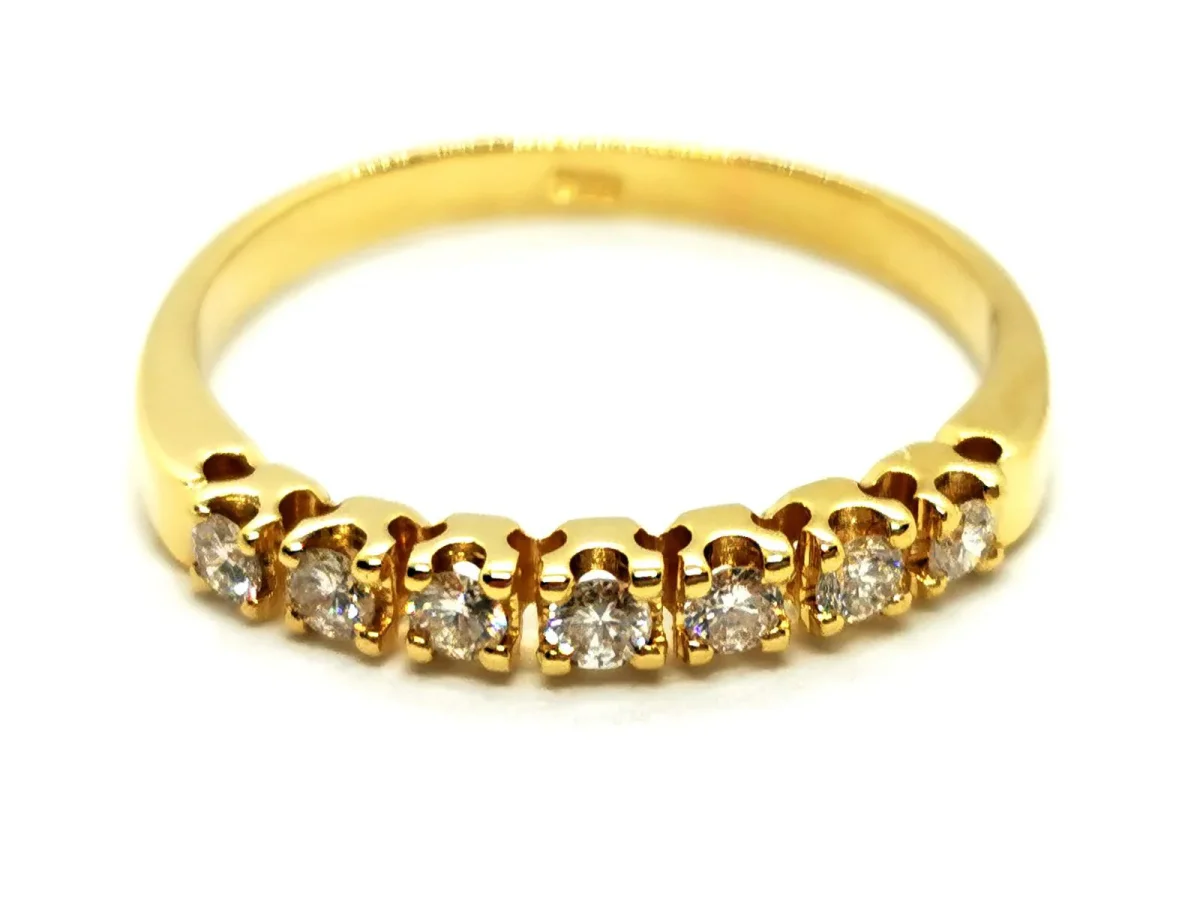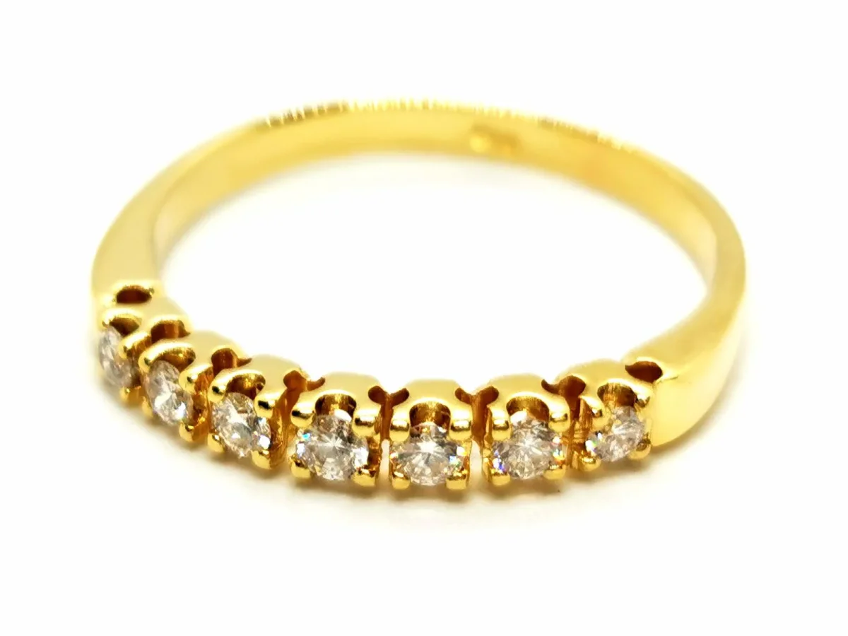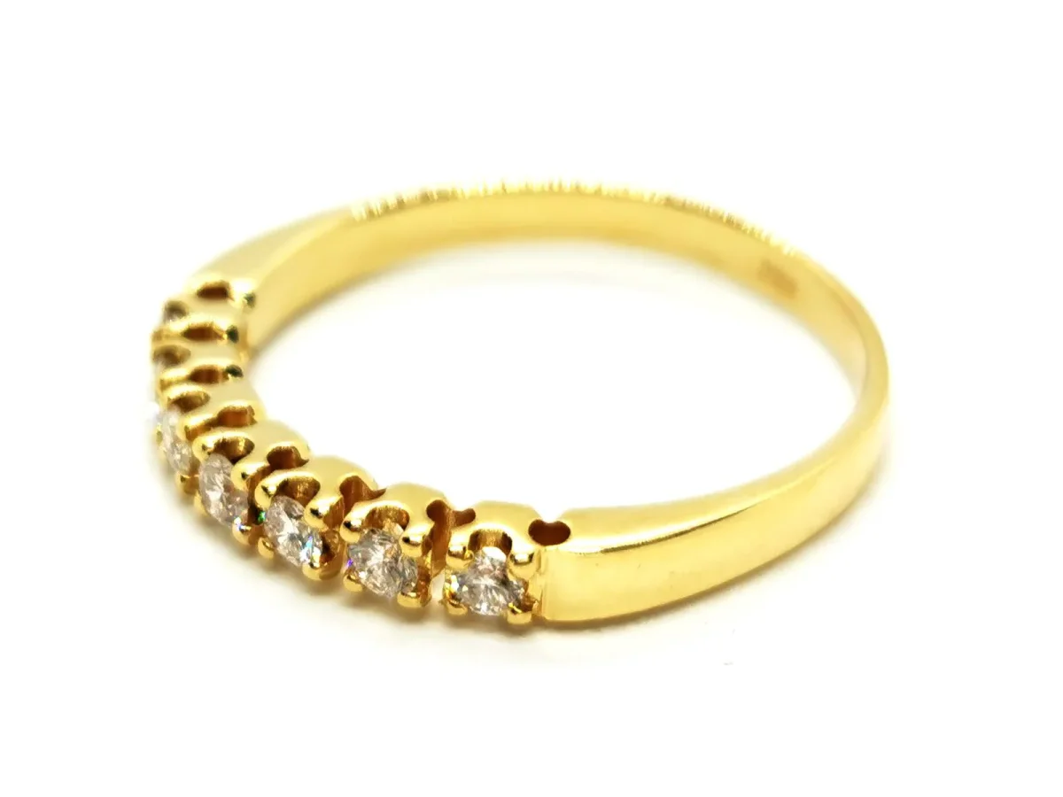 Alliance demi tour en or jaune 750 millièmes (18 carats), sertie de 7 diamants taille brillant environ G-VS d’environ 0,03 ct chacun, poids total diamant: environ 0,21 ct, largeur sur le dessus: 0,25 cm, taille de doigt: 54, poids total: 2,21 g, poinçon tête d’aigle, excellent état