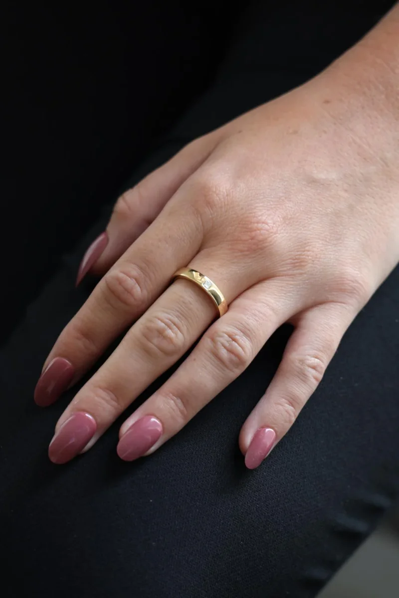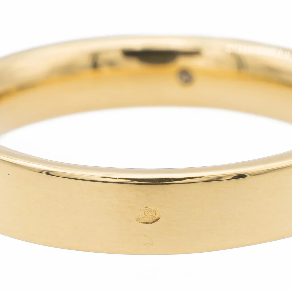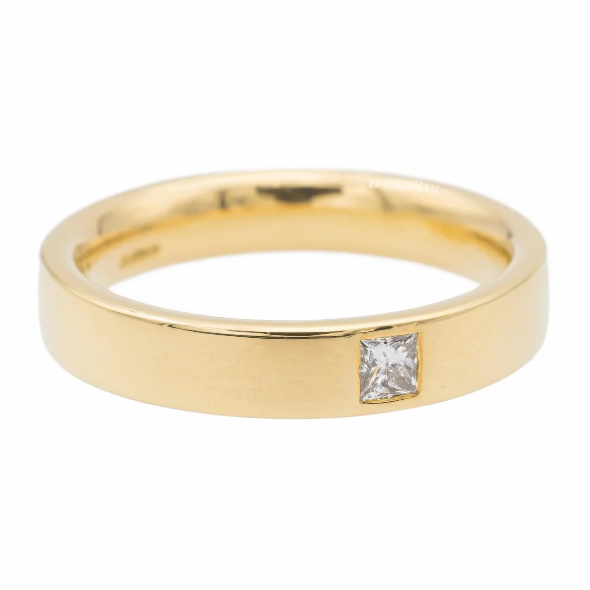 Alliance en or jaune 750 millièmes (18 carats), anneau lisse, serti d’un diamant taille princesse d’environ 0,08 ct, environ G-H/VS, largeur sur le dessus: 0,38 cm, tour de doigt: 54, poids total: 6,80 g, poinçon tête d’aigle, excellent état.