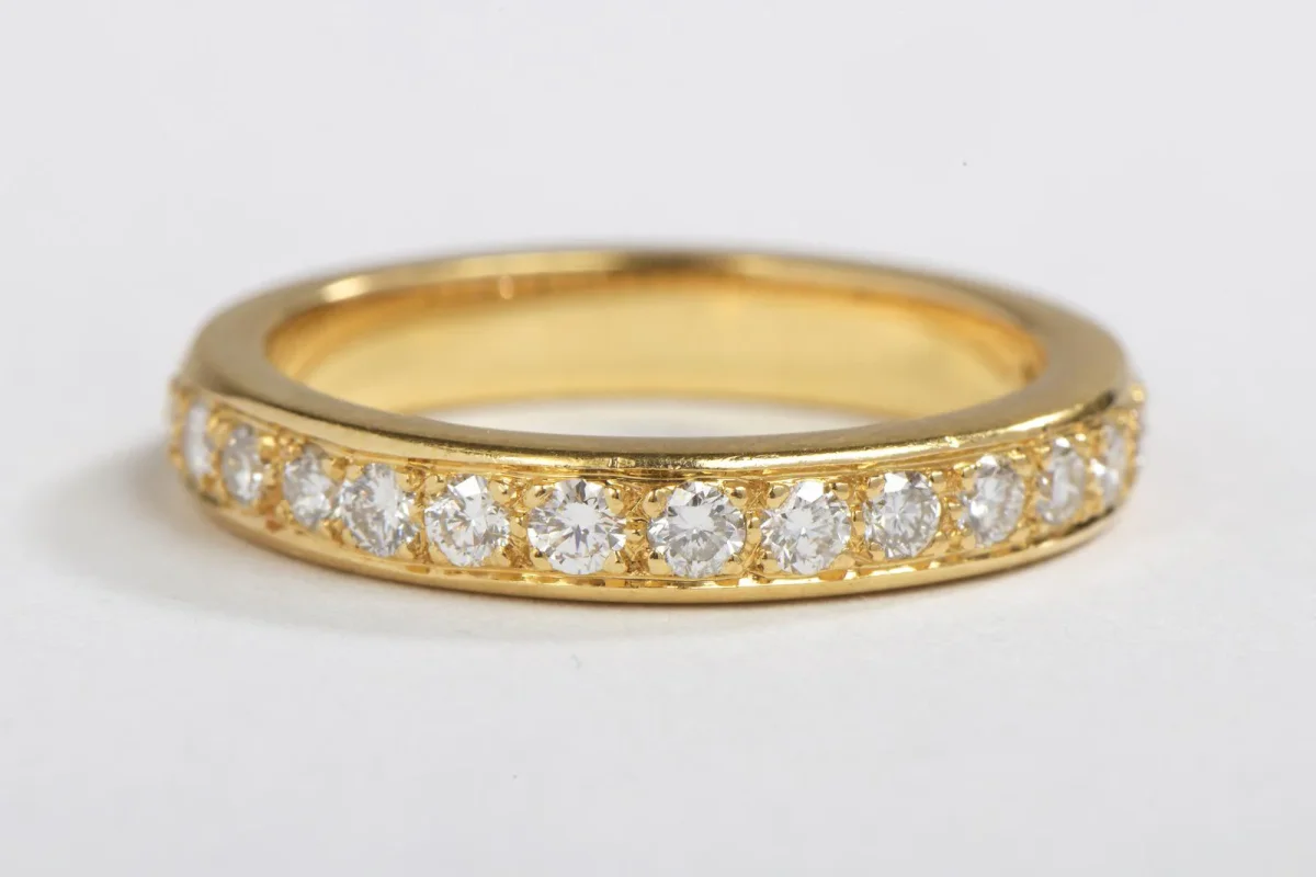 Demie alliance diamant, Or jaune 750 millièmes (18 carats), serties de 17 diamants taille brillant H-SI pour environ 0,17 ct au total, Taille de doigt 53, Poids total: 4.87 g, excellent état, Poinçonné