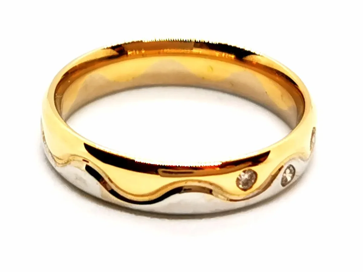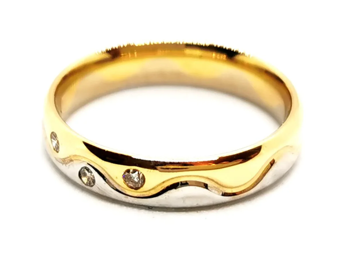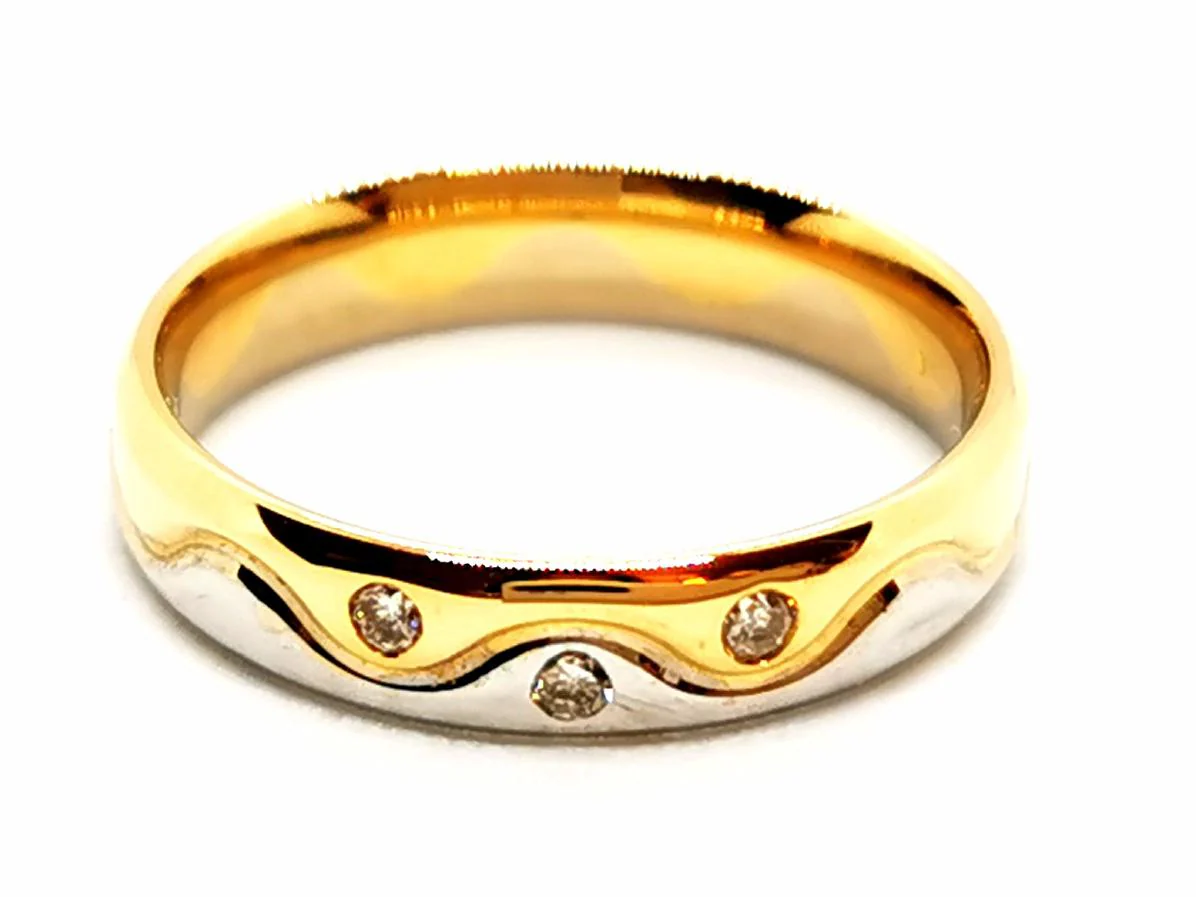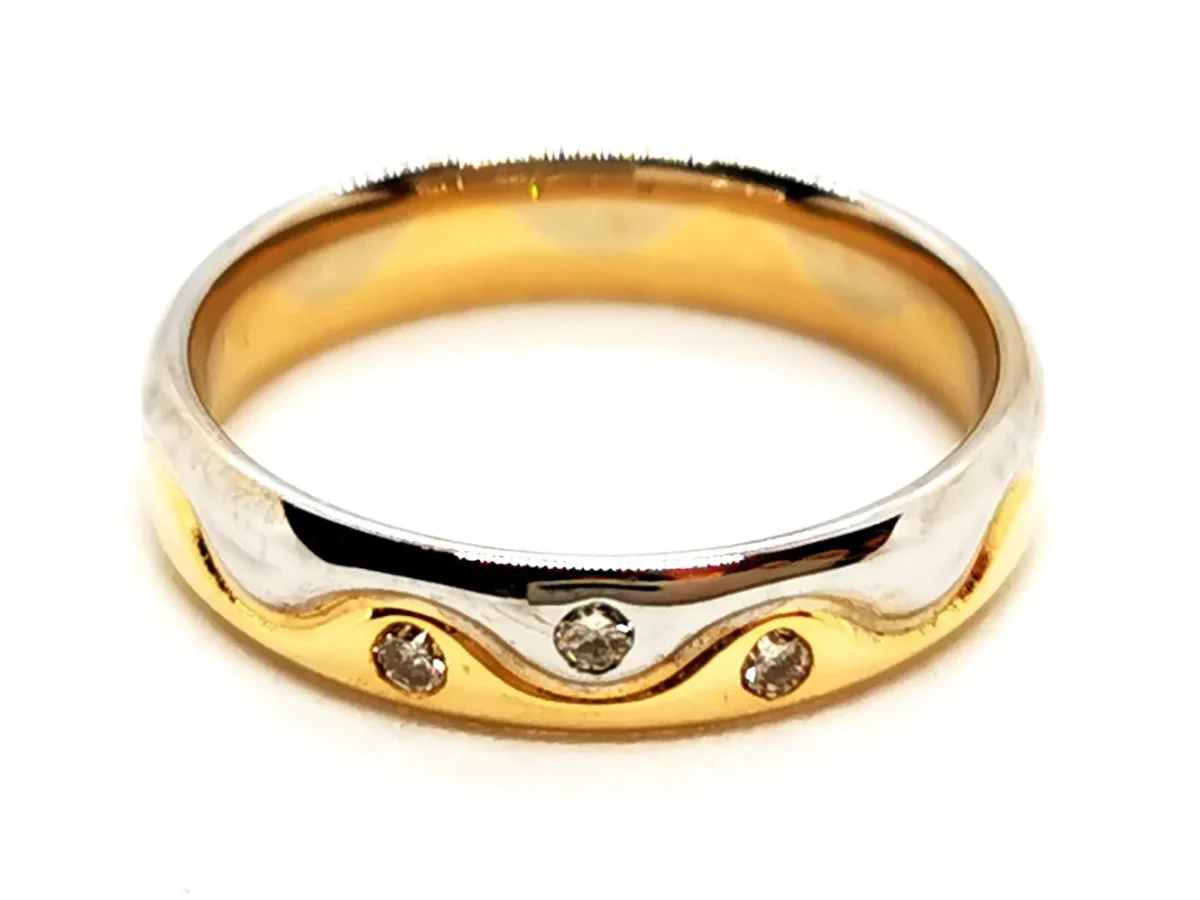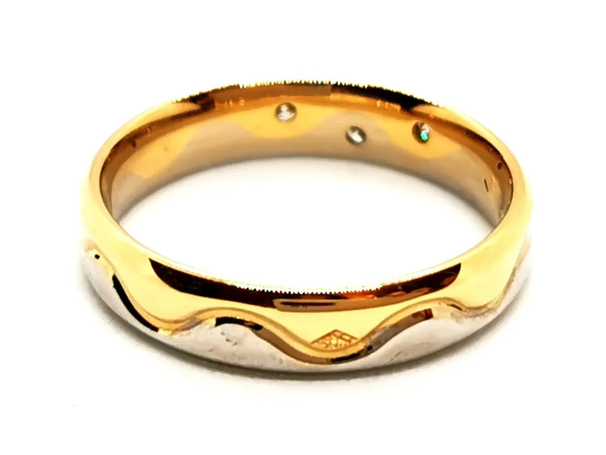 Alliance en or jaune et blanc 750 millièmes (18 carats) sertie clos de 3 dimants H-SI taille brillant d’environ 0,01 ct chacun, poids total des diamants: 0,03 ct, taille: 49,5, largeur: 0,38 cm, poinçon tête d’aigle, excellent état