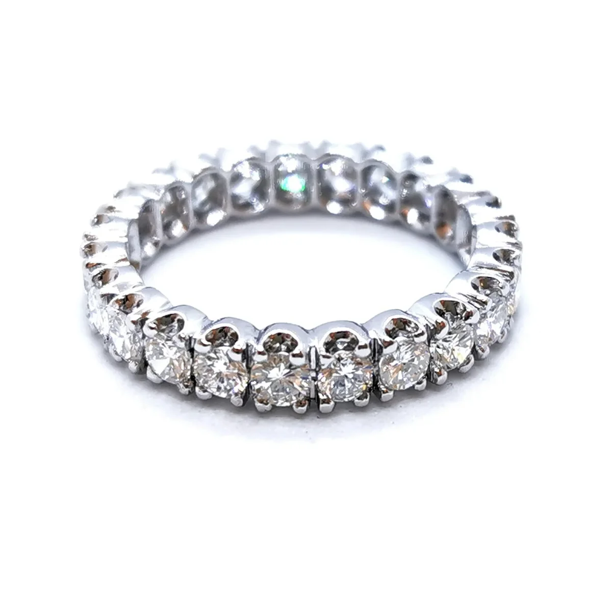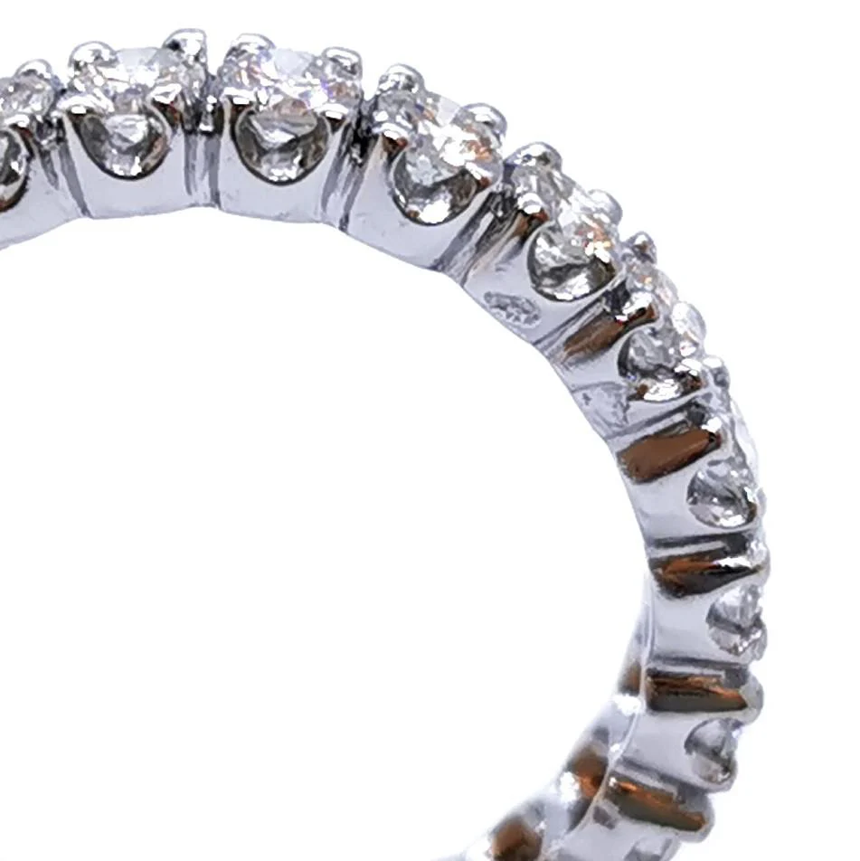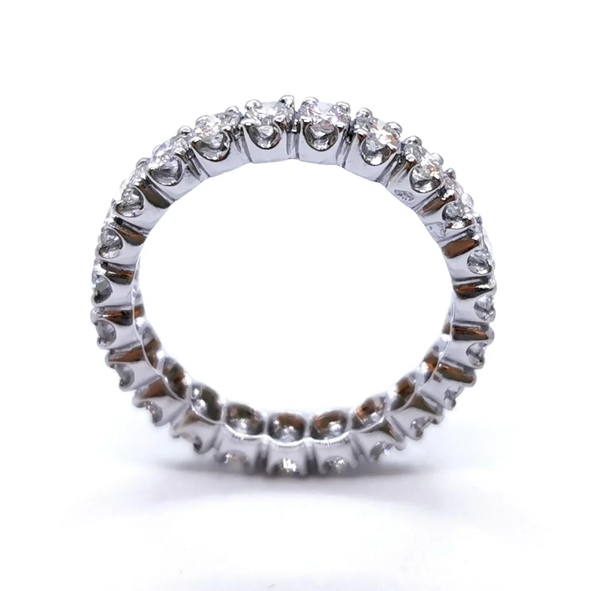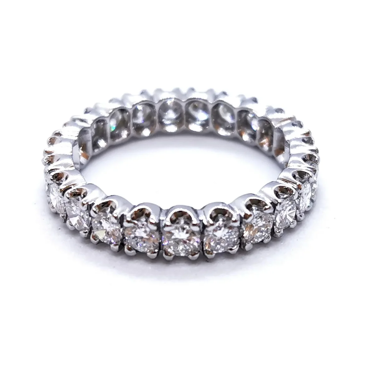 Alliance américaine en platine 950 millièmes, sertie de 23 diamants taille brillant environ G-VS, d’environ 0,065 ct chacun, poids total diamant: environ 1,49 cts, largeur sur le dessus: 0,39 cm, taille de doigt: 55, poids total: 5,37 g, poinçon tête de chien, excellent état