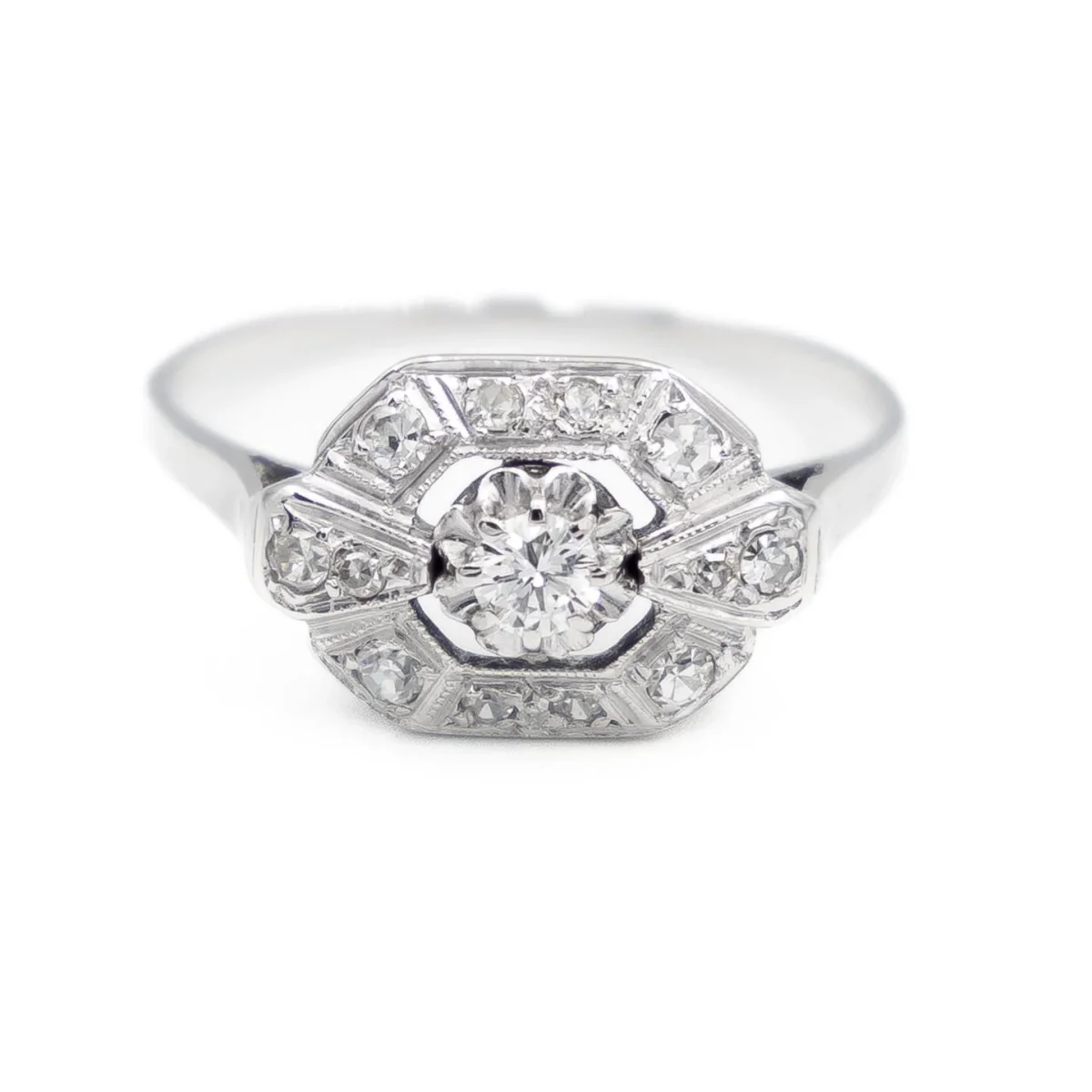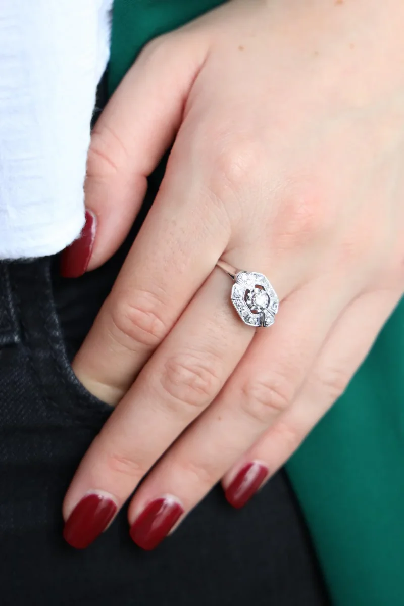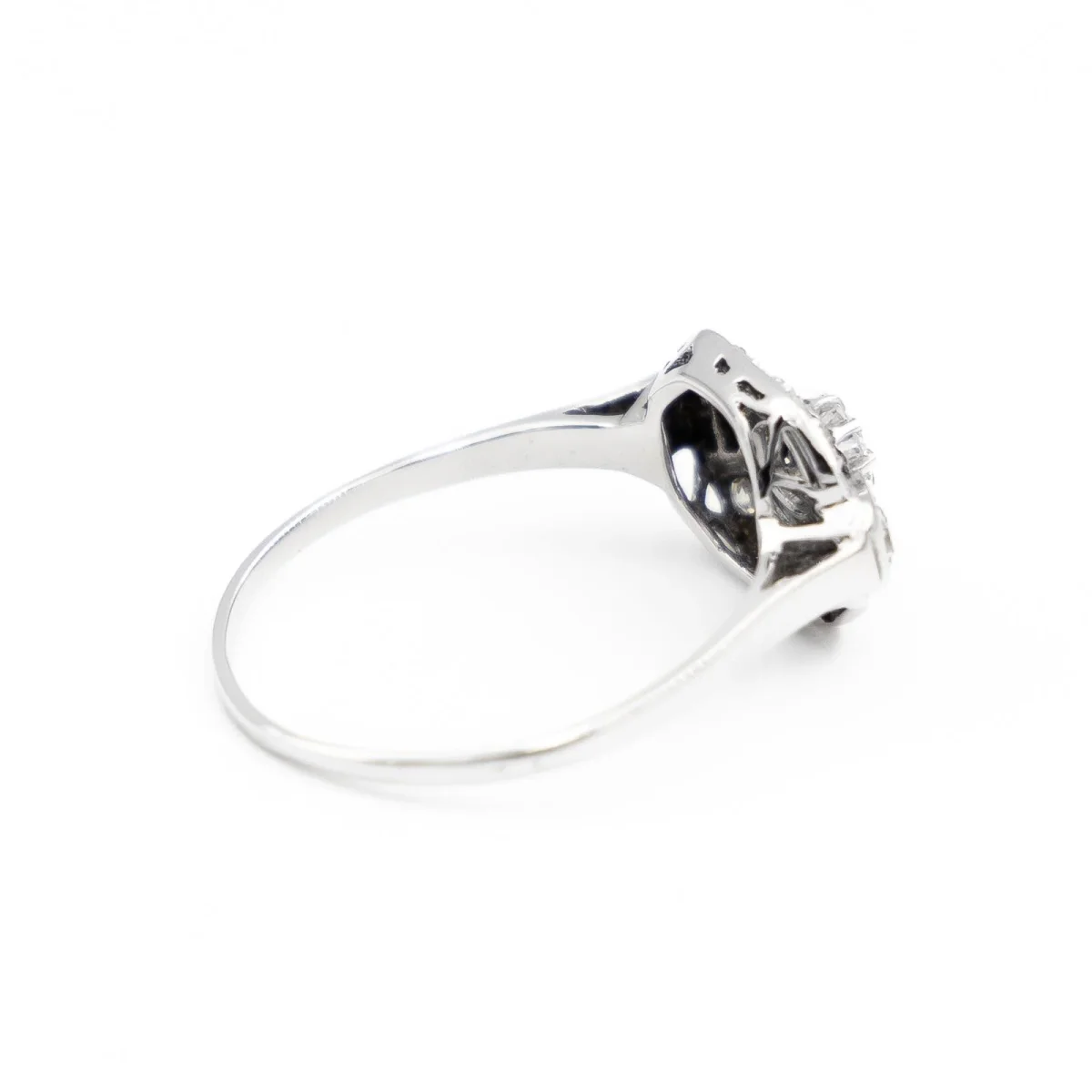 Bague art déco en or blanc 750 millièmes (18 carats), sertie de 13 diamants taille brillant environ G-VS, poids total diamants: environ 0,32 ct, (un diamant d’environ 0,11 ct, 6 diamants d’environ 0,025 ct chacun, 6 diamants d’environ 0,06 ct chacun), largeur sur le dessus: 1,03 cm, taille de doigt: 60,5, poids total: 3,01 g, poinçon hibou, excellent état