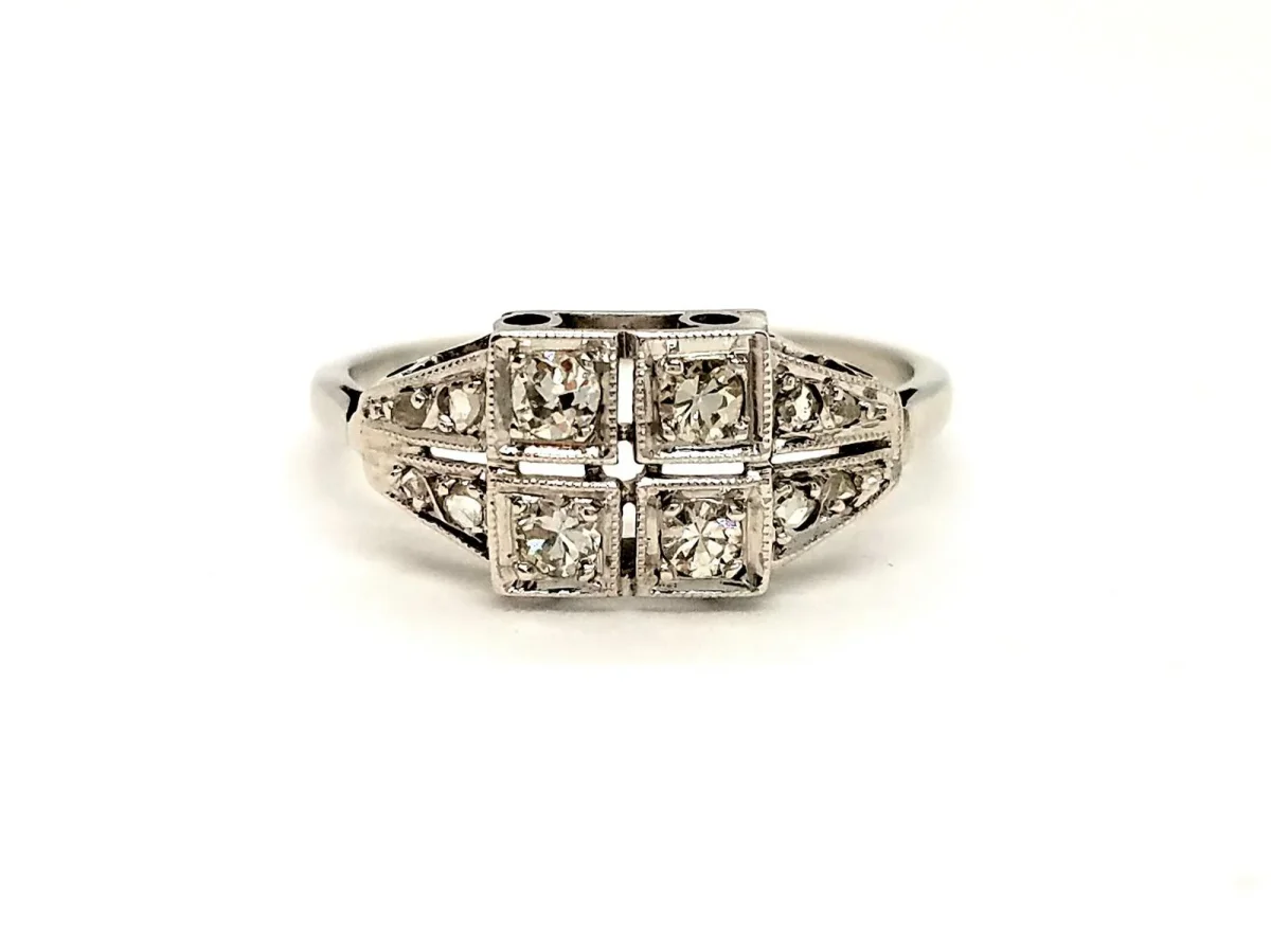 Bague art déco en or blanc 750 millièmes (18 carats) testé, sertie de 8 diamants taille ancienne H-SI pour un total d’environ 0,18 ct, tour de doigt: 50.5, largeur sur le dessus: 0,71 cm, poids total: 1,67 g, excellent état