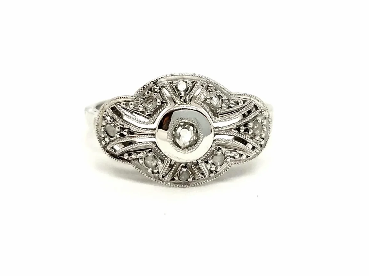 Bague art déco, en or blanc 750 millièmes (18 carats), sertie de 9 diamants taille ancienne H-SI pour environ 0,08 ct, dont diamant central d’environ 0,04 ct, taille: 48, dimensions du motif sur le dessus: 1,5 cm x 0,96 cm, poids total: 2,13 g, poinçon tête d’aigle, excellent état