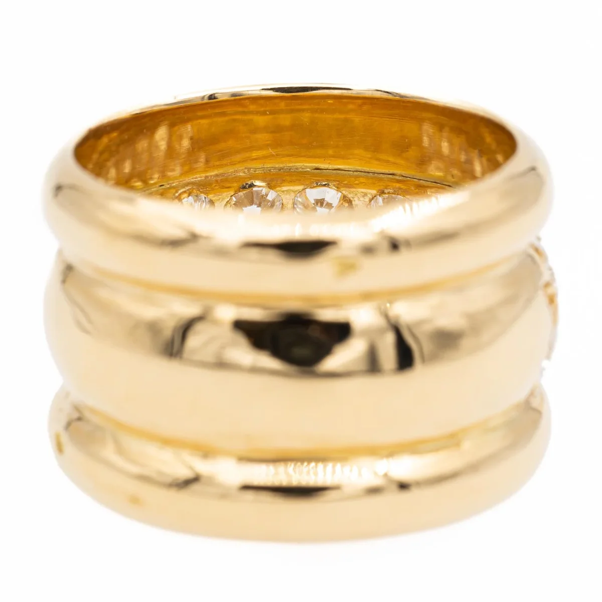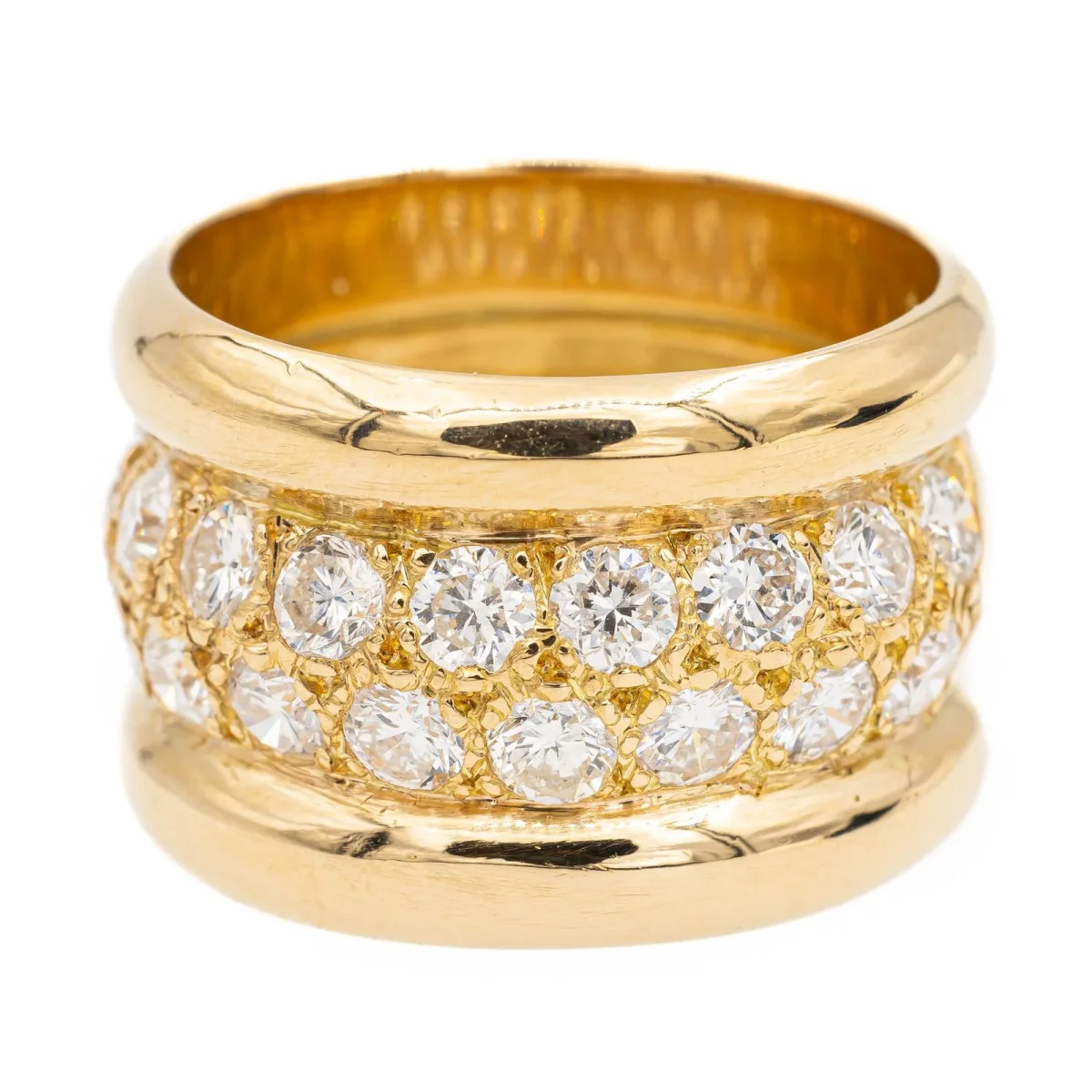 Bague bandeau en or jaune 750 millièmes (18 carats), sertie de 18 diamants taille brillant environ G/VS, d’environ 0,10 ct chacun, poids total diamants: environ 1,8 ct, largeur sur le dessus: 1,35 cm, tour de doigt: 53, poids total: 10,99 g, poinçon tête d’aigle, excellent état
