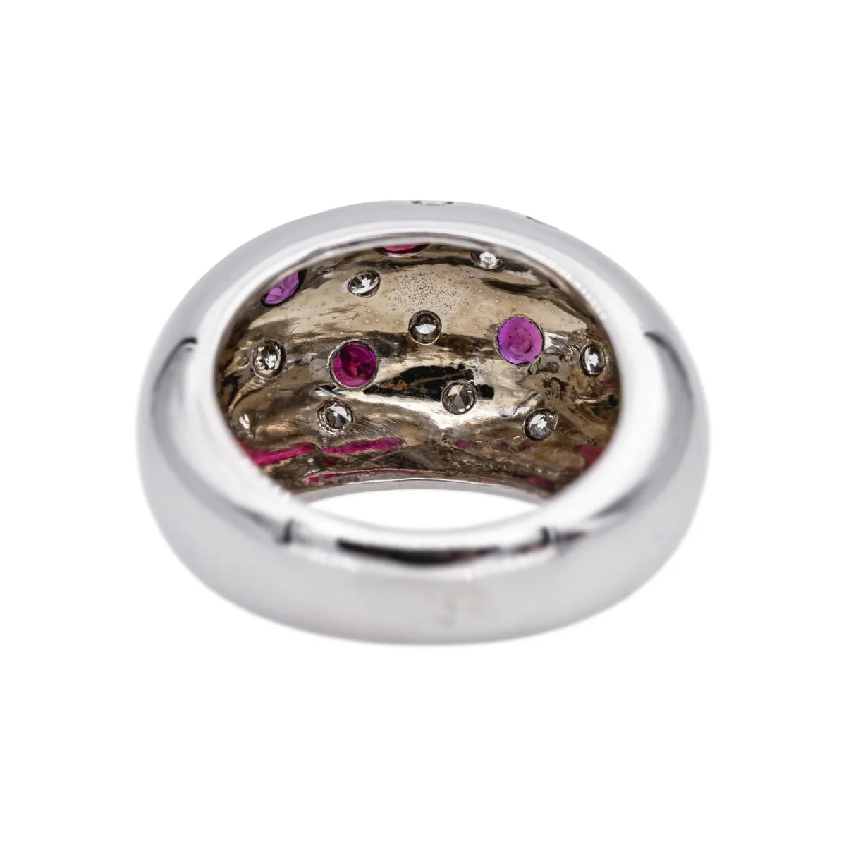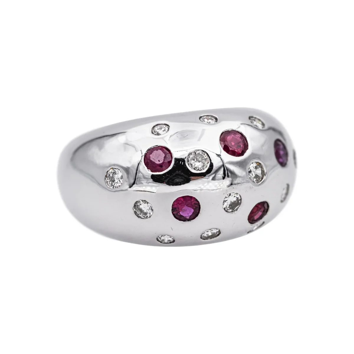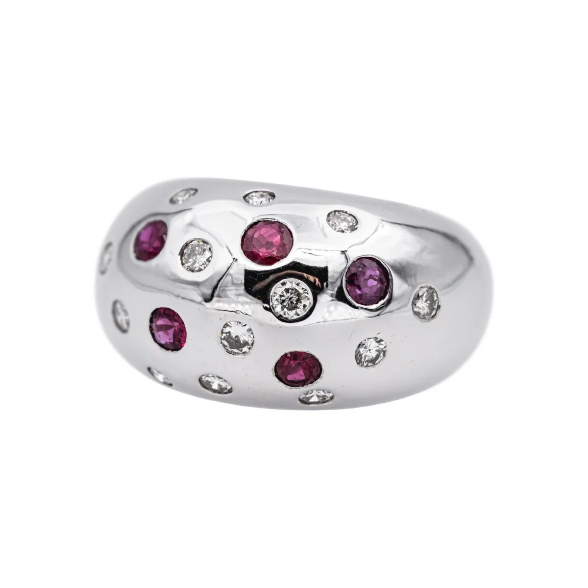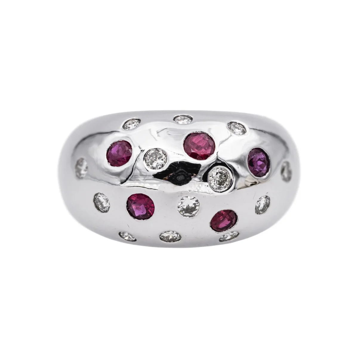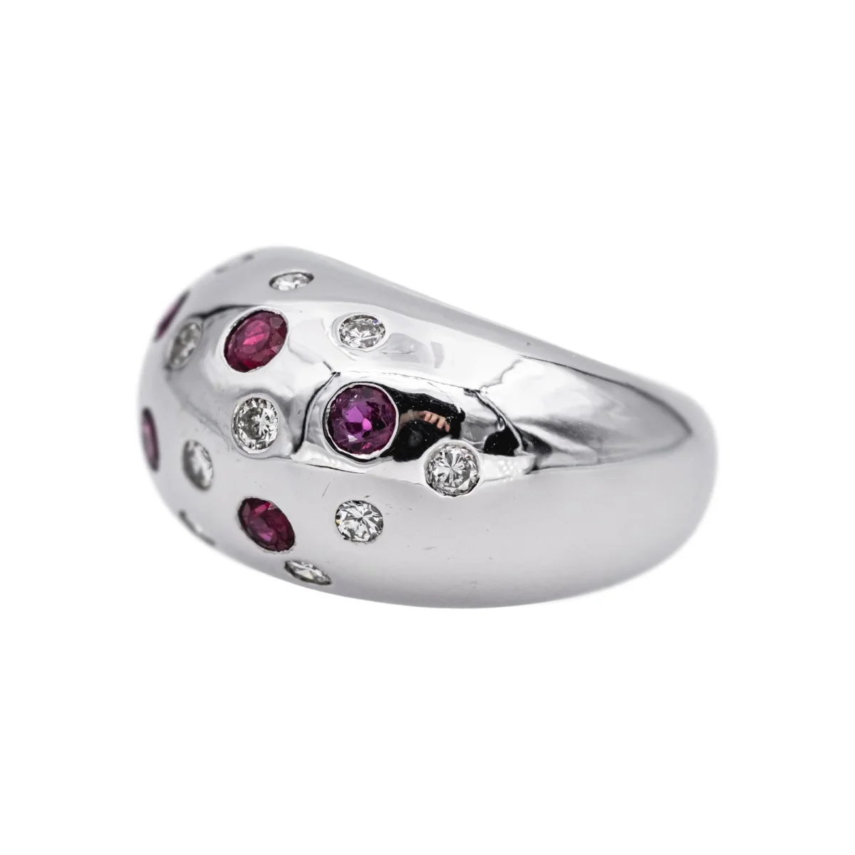 Bague cocktail en or blanc 750 millièmes (18 carats), pavée de diamants et de rubis, 13 diamants taille brillant, environ I-VS, d’un poids total d’environ 0,52 ct, (chaque diamant d’un poids d’environ 0,04 ct) entourés de 5 rubis taillés en rond, d’un poids total d’environ 0,70 ct (chaque rubis d’un poids d’environ 0,14 ct), largeur sur le dessus : 1,39 cm, tour de doigt : 53, poids total : 14,28 g, poinçon tête d’aigle, excellent état