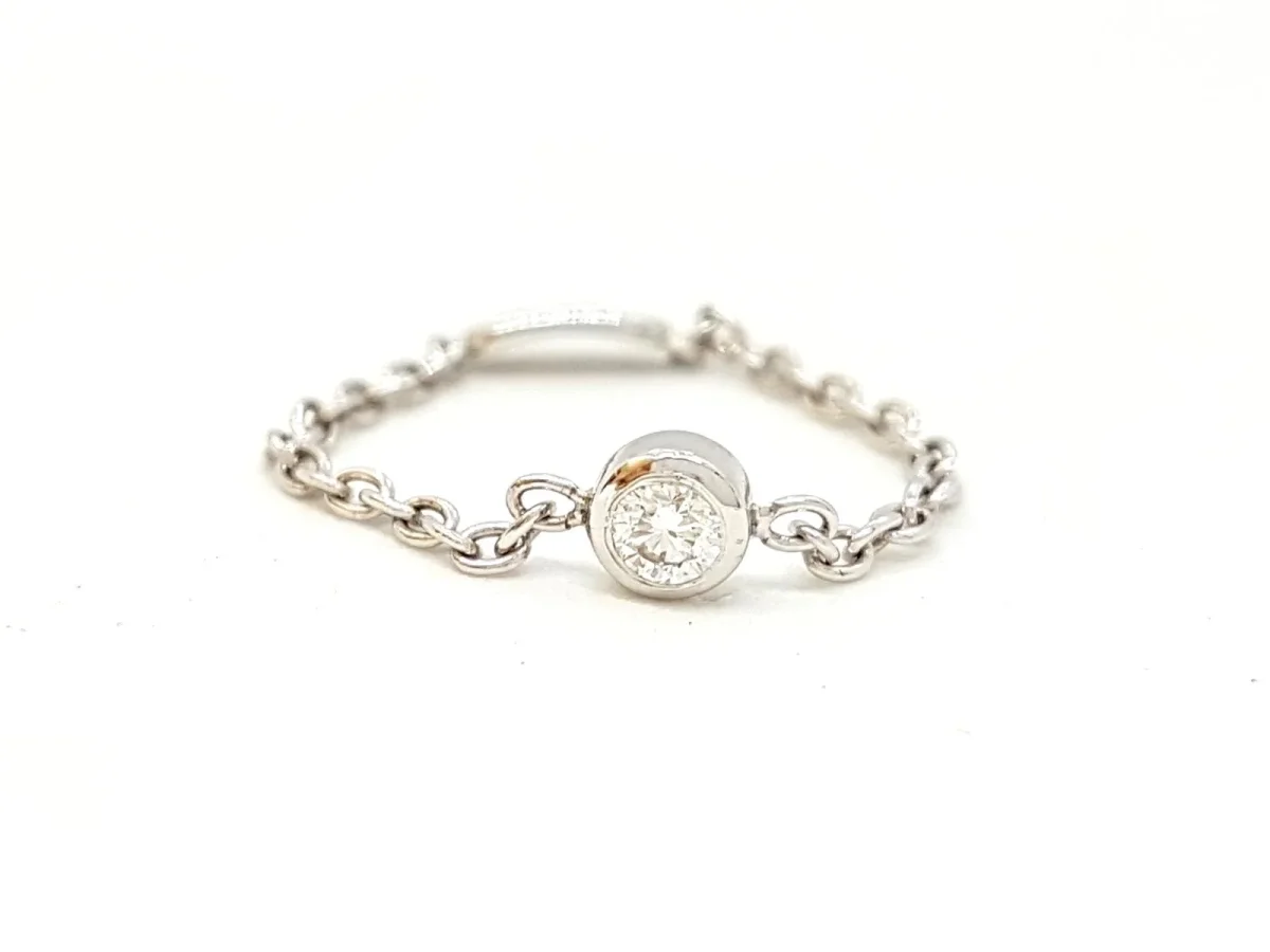 Bague chaînette en or blanc 750 millièmes (18 carats), serti d’un diamant taille brillant G-VS d’environ 0,07 ct en serti clos, chaînette maille forçat de 1,4 mm de largeur, tour de doigt: 53, diamètre du serti: 0,4 cm, poids total: 0,66 g, état neuf
