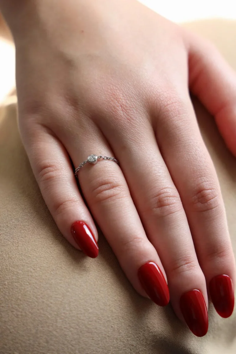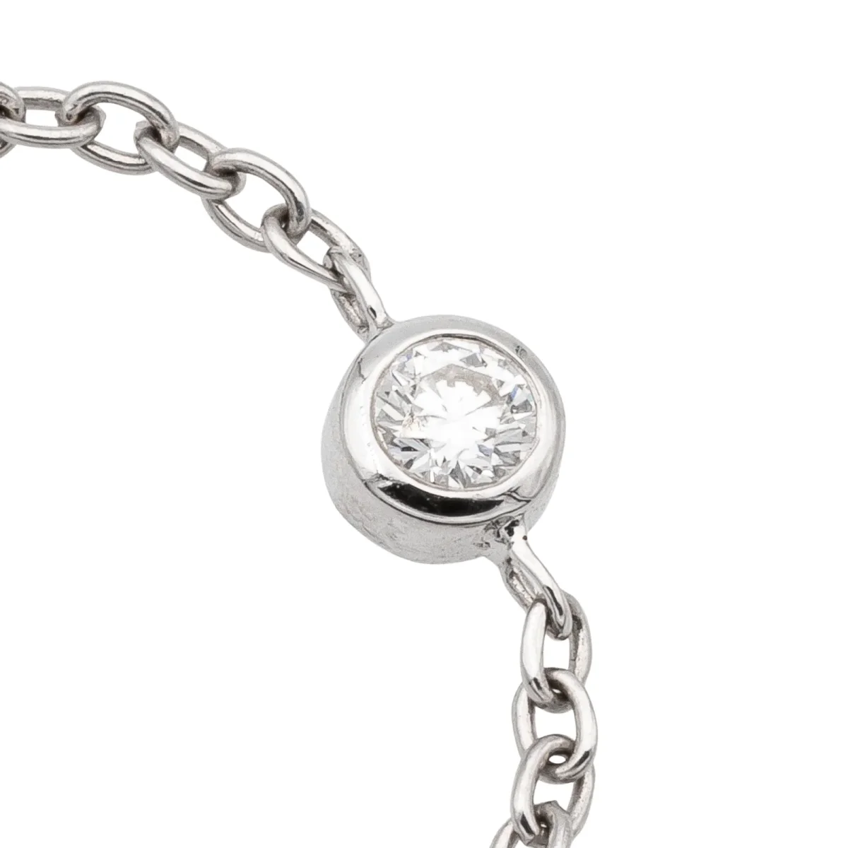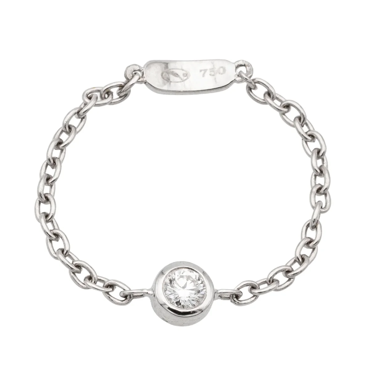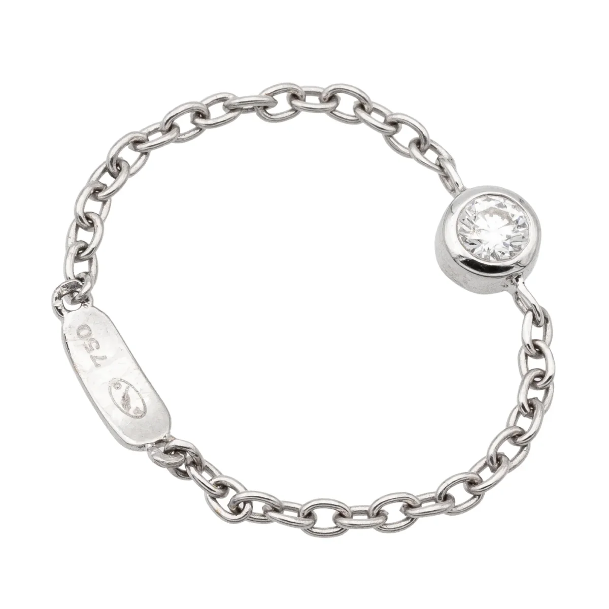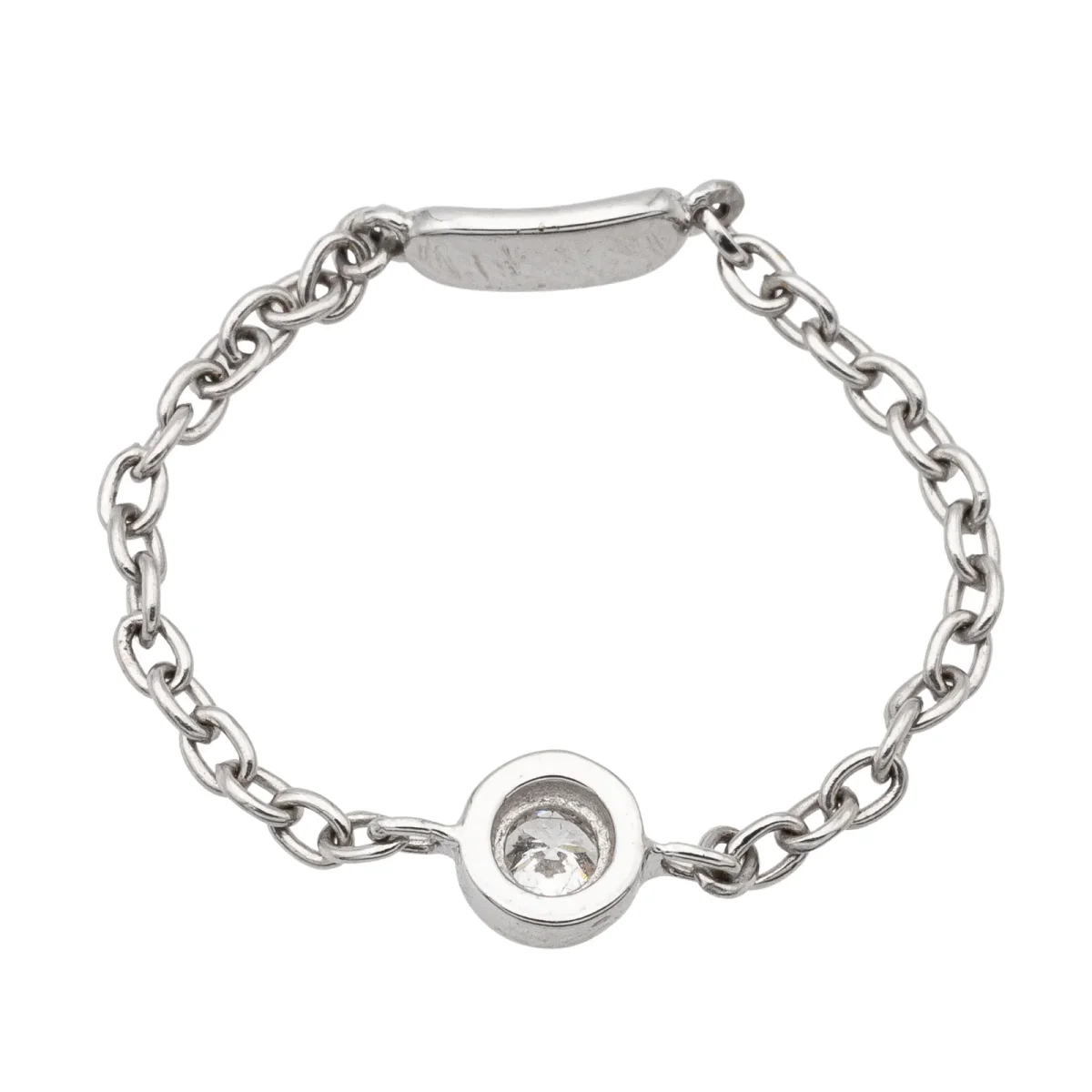 Bague chaînette en or blanc 750 millièmes (18 carats) testé, serti d’un diamant taille brillant G-VS d’environ 0,08 ct en serti clos, chaînette maille forçat de 1,4 mm de largeur, tour de doigt: 54, diamètre du serti: 0,4 cm, poids total: 0,63 g, état neuf