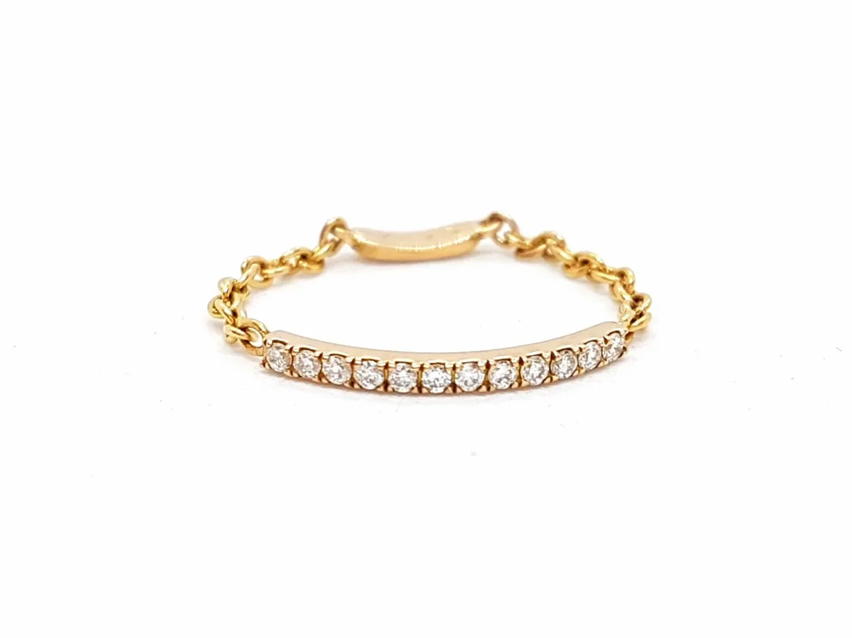 Bague chaînette en or rose 750 millièmes (18 carats), composée d’une barrette sertie de 12 diamants taille brillant G-VS pour 0,09 ct au total, chaînette maille forçat de 1,4 mm de largeur, tour de doigt: 52, largeur de la barrette: 1,3 mm, poids total: 0,72 g, état neuf