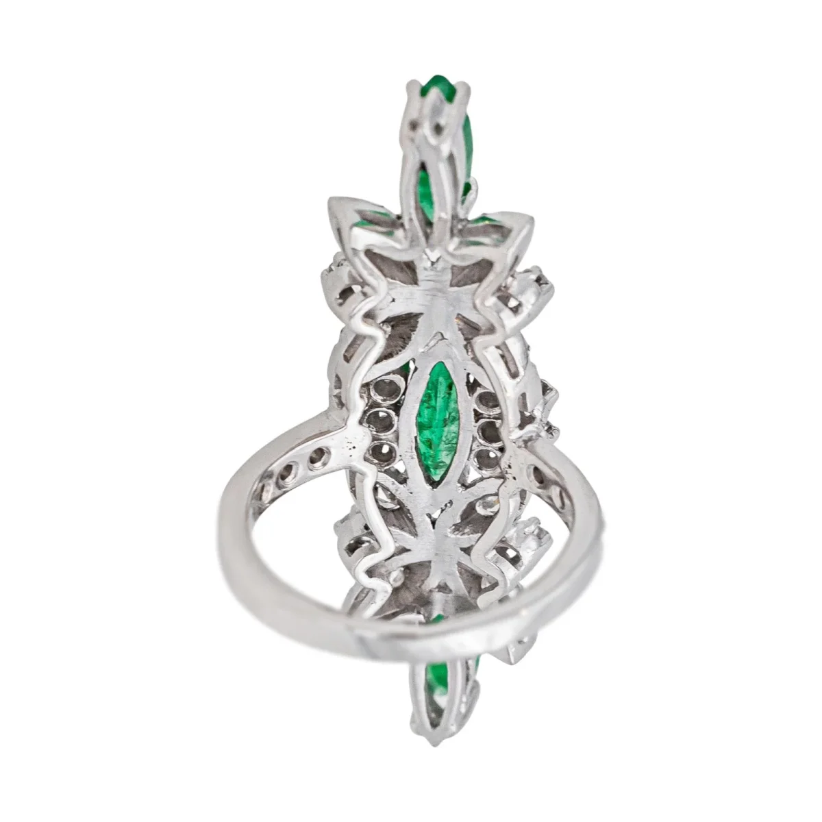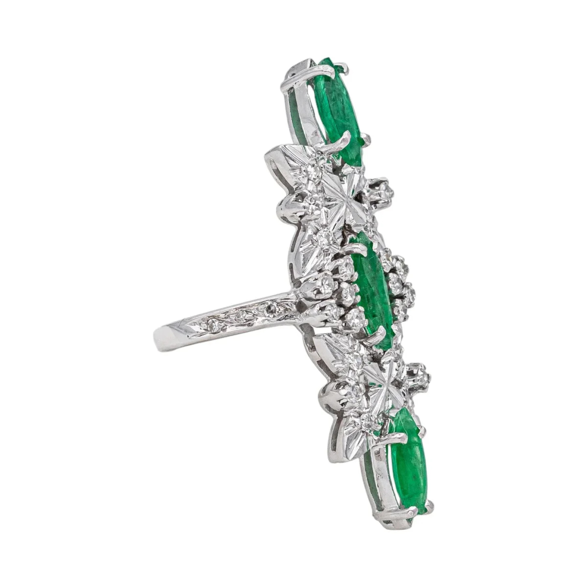 Bague cocktail en or blanc 585 millièmes (14 Carats), sertie de 3 émeraudes (2 d’environ 0,29 ct chacune et une d’environ 0,31 ct) et de 28 diamants taille brillant estimés H/SI (environ 0,01 ct chacun) Poids total estimé des émeraudes : 0,89 ct, Poids total estimé des diamants: 0,28 ct, Tour de doigt: 48, dimensions du motif : 3,80 x 1,17 cm, Poids total: 6,65 g, poinçon coquille saint-jacques, Excellent état
