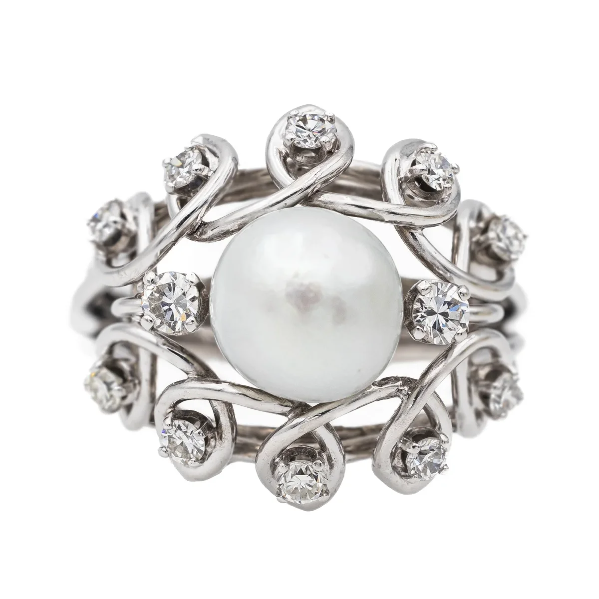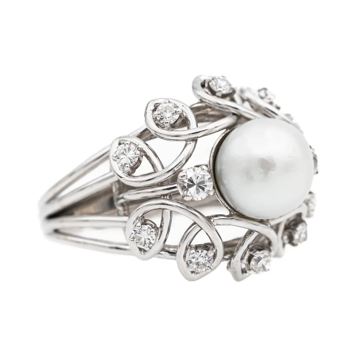 Bague cocktail en or blanc 750 millièmes (18 carats), sertie d’une perle blanche de 9,10 mm, entourée de 12 diamants taille brillant, environ G-SI, d’un poids total d’environ 0,46 ct (2 diamants d’un poids d’environ 0,08 ct chacun et 10 d’environ 0,03 ct chacun), largeur sur le dessus : 1,97 cm, tour de doigt : 55, contient un anneau qui permet une mise à taille jusqu’à 60, poids total : 11,35 g, poinçon hibou, excellent état.