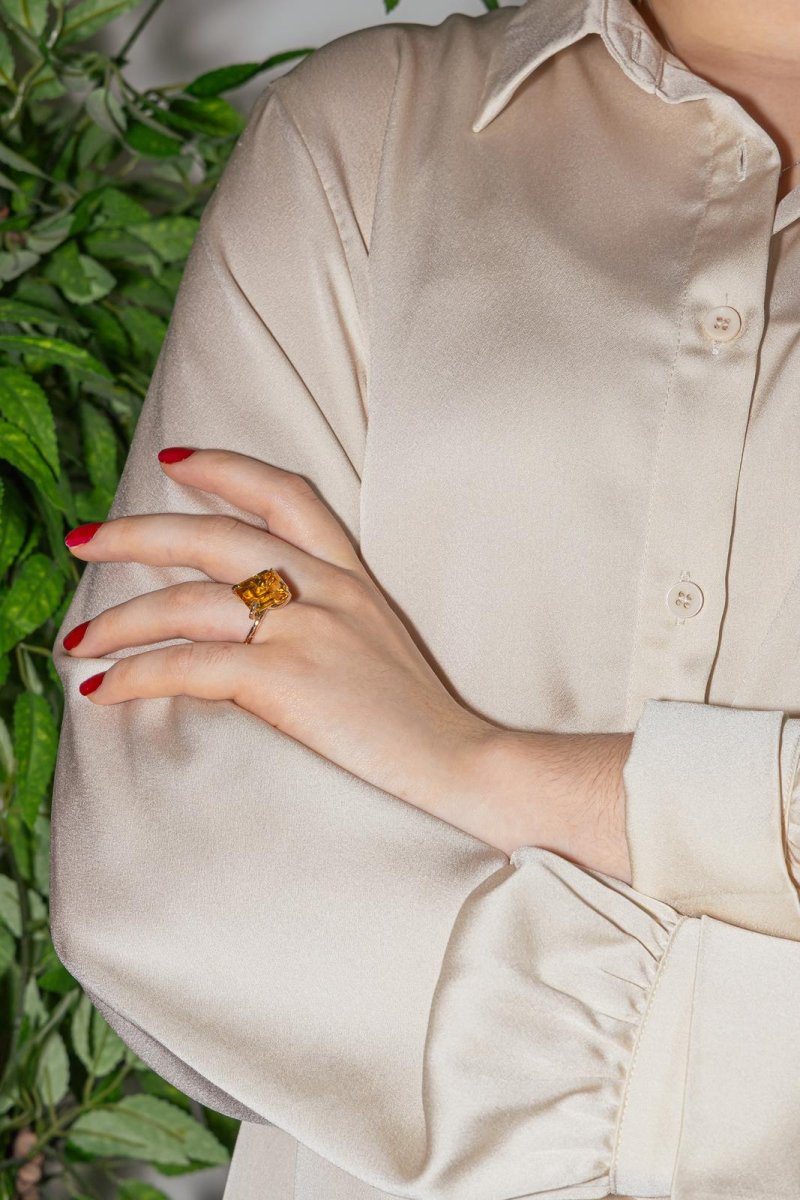 Bague en or rose 750 millièmes (18 carats), sertie d’une citrine, taille émeraude, d’un poids total d’environ 10,57 cts, largeur sur le dessus : 1,80 cm, tour de doigt : 55, poids total : 7,76 g, poinçon tête d’aigle, excellent état