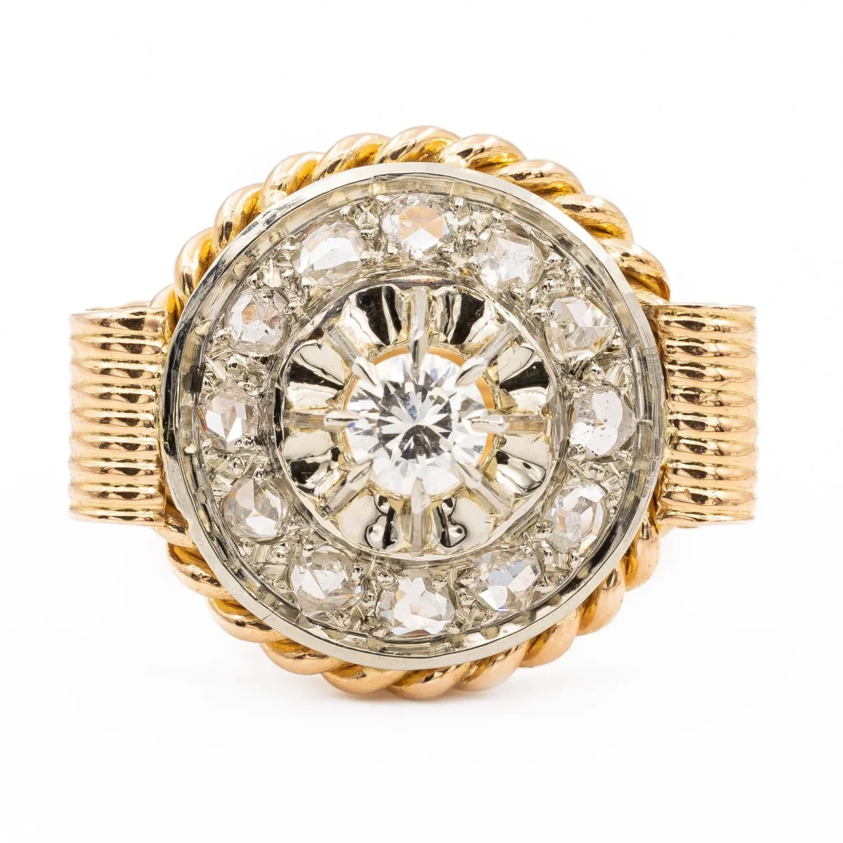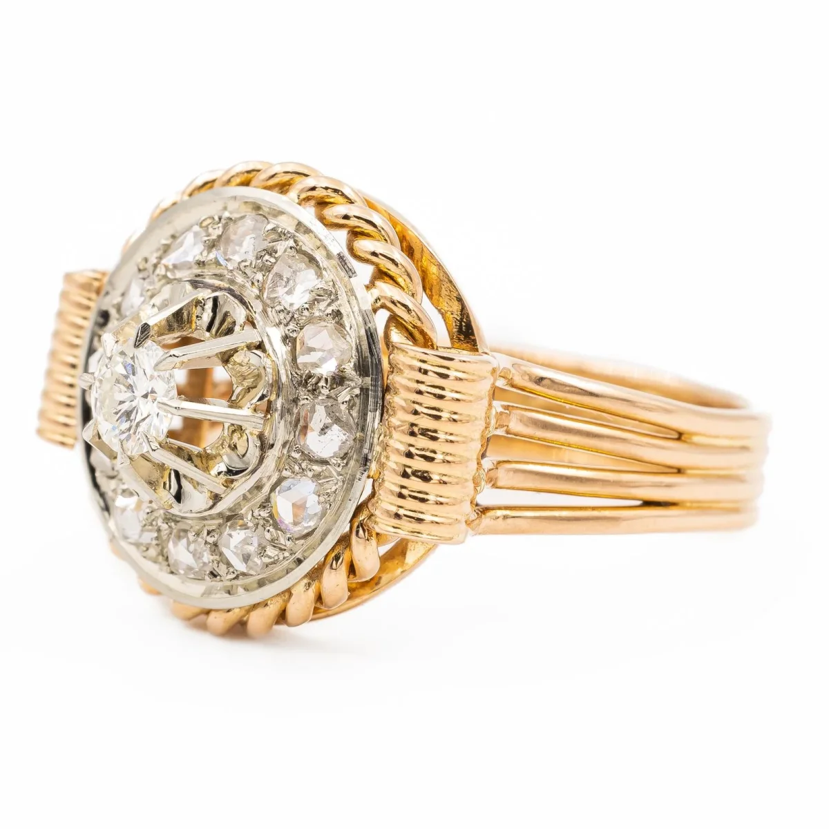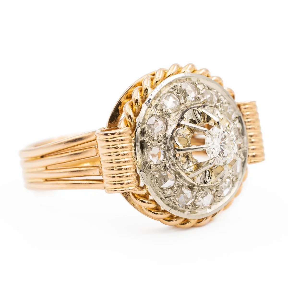 Bague rétro en or rose et or blanc 750 millièmes (18 carats), sertie d’un diamant central, estimé G/VS, environ 0,17 ct et d’un pavage de 12 diamants taille rose environ 0,01 ct chacun , environ G/VS, Poids total estimé des diamants: 0,29 ct, tour de doigt: 54, Dimensions: 1,85 x 1,5 cm, Poids total: 5,88 g, Poinçon tête d’aigle, Excellent état