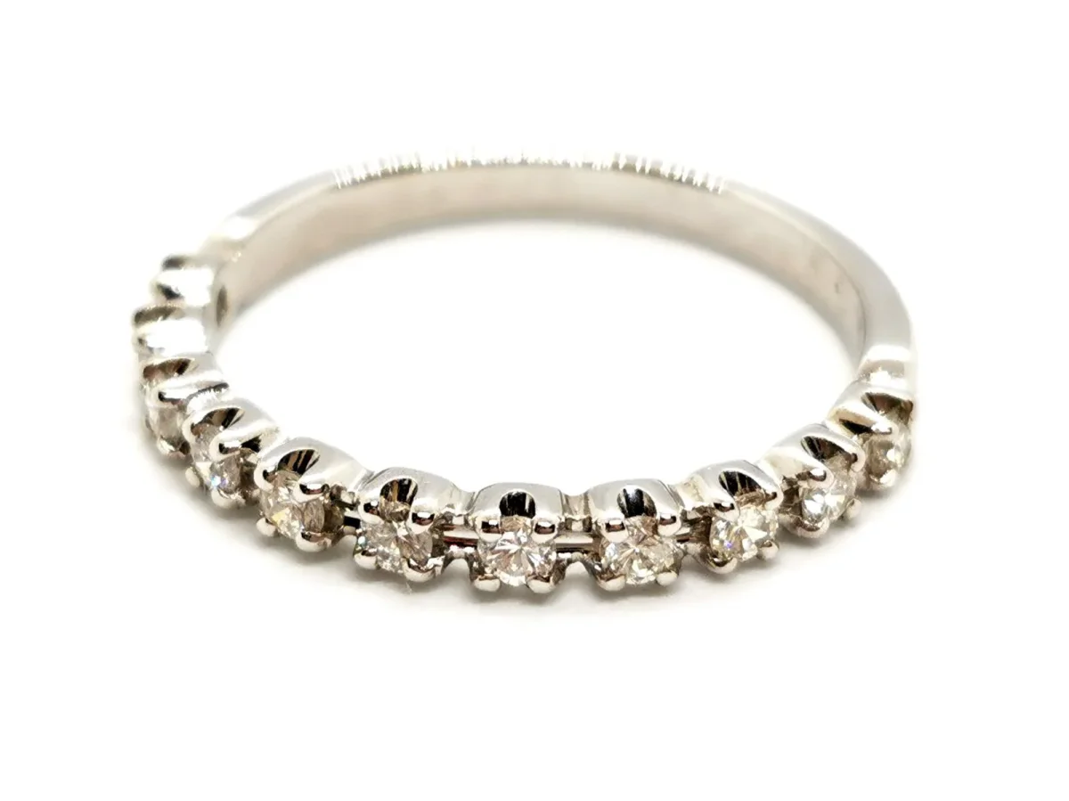 Demie alliance diamants, en or blanc 750 millièmes (18 carats), sertie sur le dessus d’une ligne de 11 diamants, taille brillant, environ G-H/VS, d’environ 0,025 ct chacun, poids total diamants: environ: 0,275 ct, serti griffes, tour de doigt: 54, largeur sur le dessus: 0,22 cm, poids total: 2,10 g, poinçon tête d’aigle, excellent état.