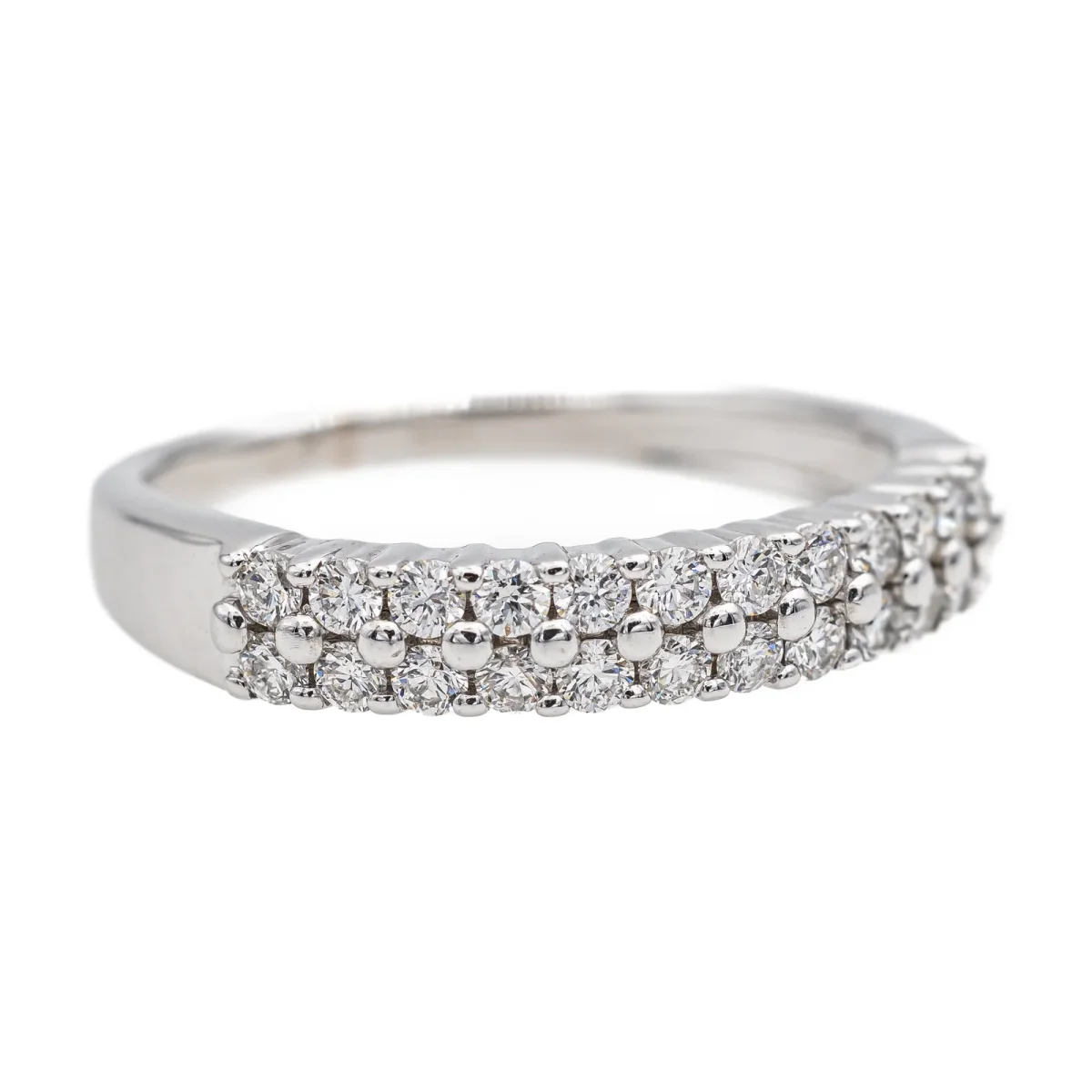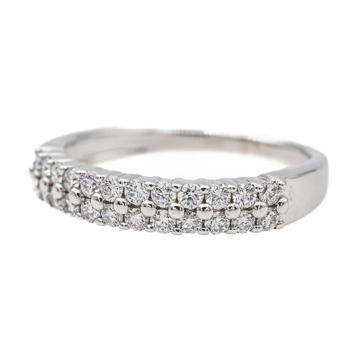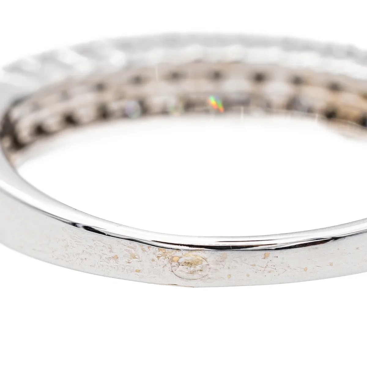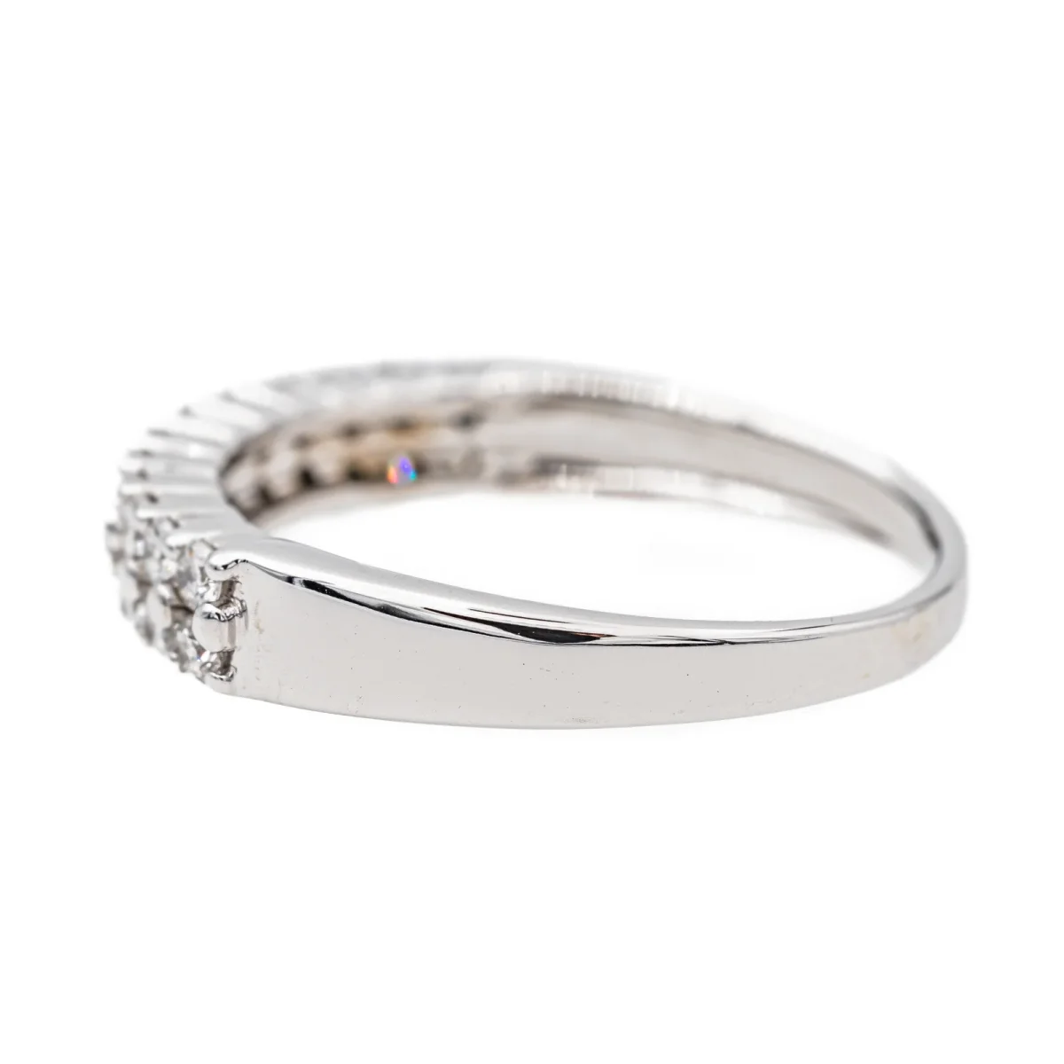 Demi-alliance en or blanc 750 millièmes (18 carats), sertie de 24 diamants taille brillant environ G-SI, d’environ 0,02 ct chacun, poids total diamants : environ 0,48 ct, largeur sur le dessus : 0,37 cm, tour de doigt : 54, poids total : 3,41 g, poinçon hibou, excellent état