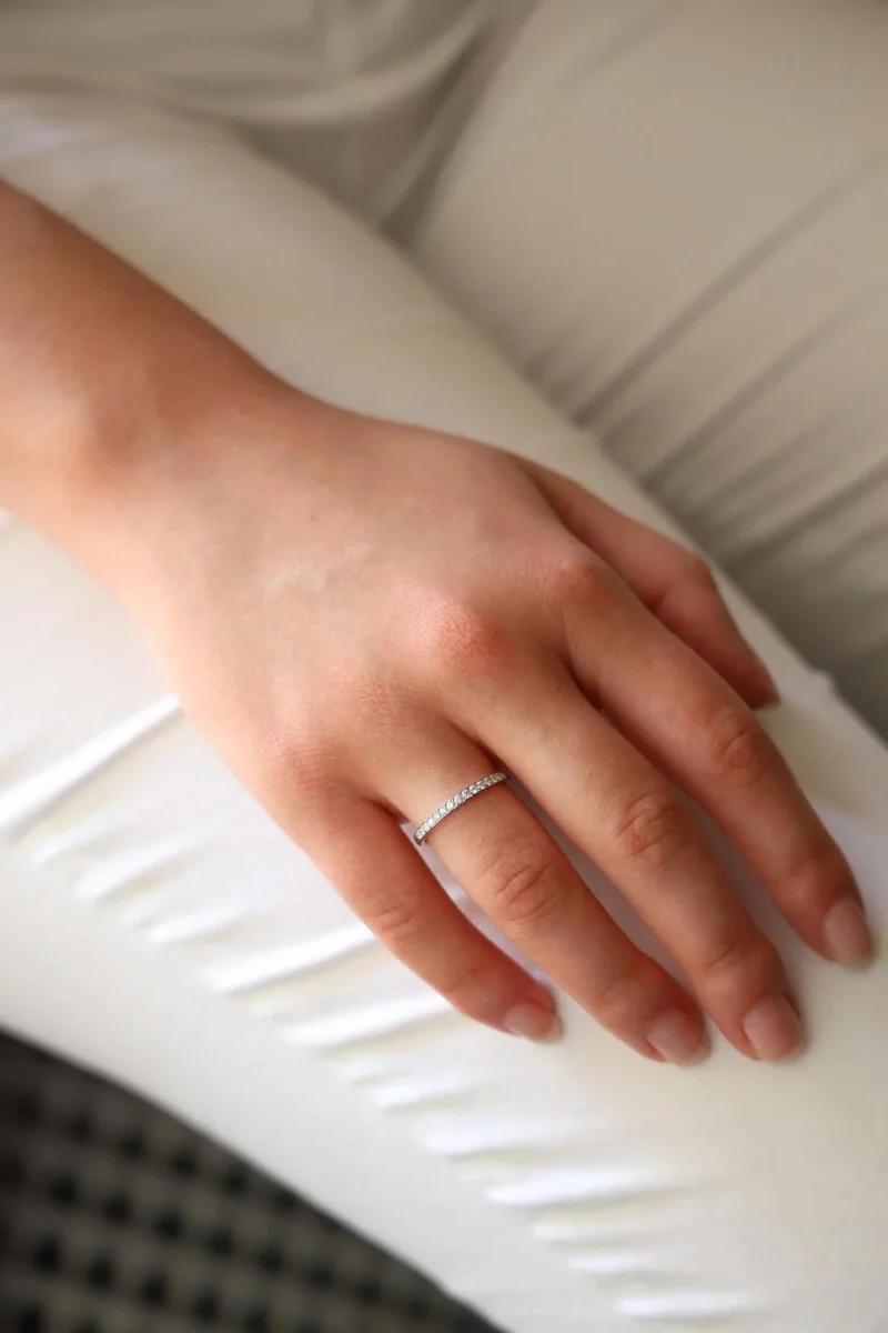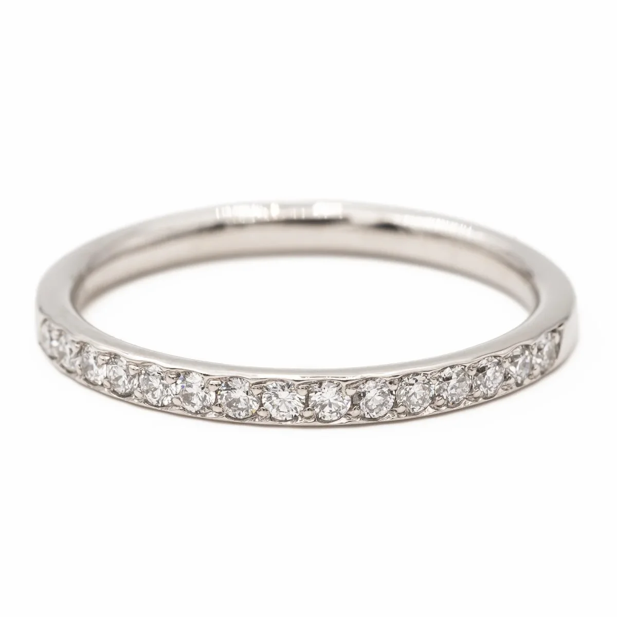 Demi alliance en or blanc 750 millièmes (18 carats) testé, sertie de 15 diamants taille brillant environ H/VS, d’environ 0,01 ct chacun, poids total diamants: environ 0,15 ct, largeur sur le dessus: 0,18 cm, tour de doigt: 51, poids total: 2,03 g, excellent état