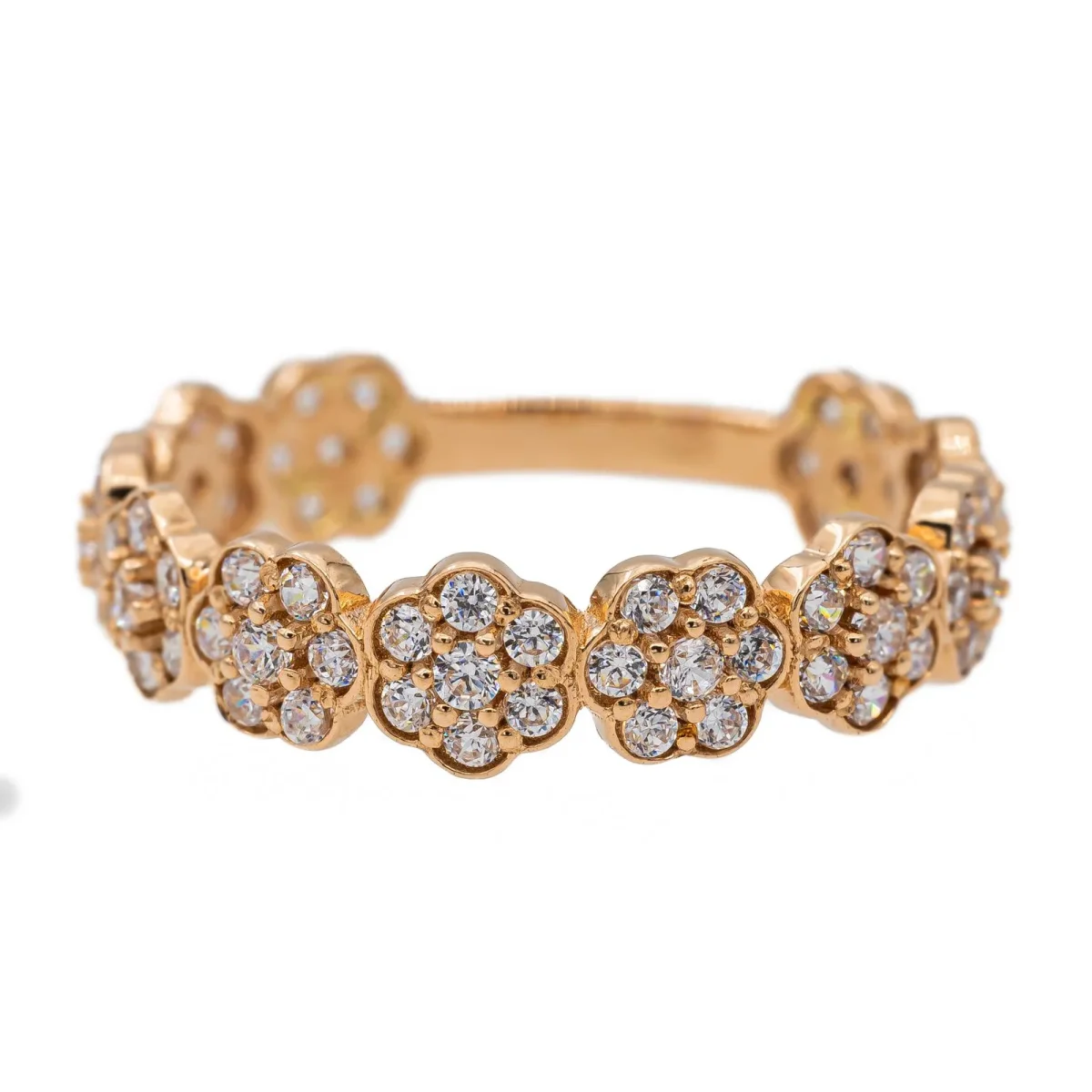 Bague en or rose 750 millièmes (18 carats) testé, 7 fleurs serties de 77 diamants taille brillant environ H-SI, d’environ 0,005 ct chacun, poids total diamants: environ 0,385 ct, largeur sur le dessus: 0,45 cm, tour de doigt: 51, poids total: 1,89 g, excellent état