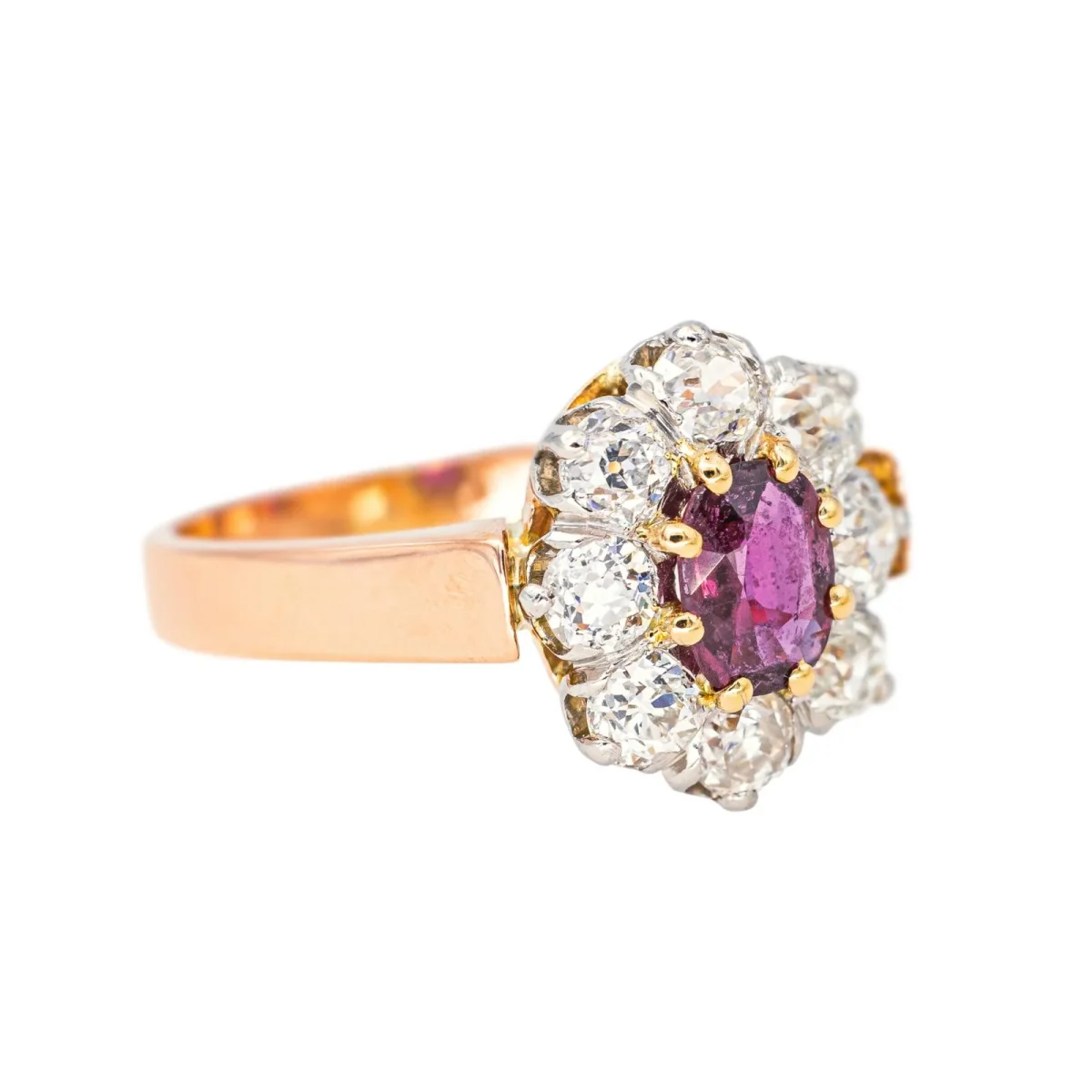 Bague en or rose 750 millièmes (18 carats) et platine 950 millièmes, sertie d’un rubis et de diamants, 1 rubis taille ovale, d’un poids total d’environ 0,47 ct, entouré de 8 diamants taille ancienne, environ I-VS, d’un poids total d’environ 1,12 ct, (chaque diamant d’un poids d’environ 0,14 ct), largeur sur le dessus : 1,27 cm, tour de doigt : 54, poids total : 5,04 g, poinçon hibou et mascaron, excellent état