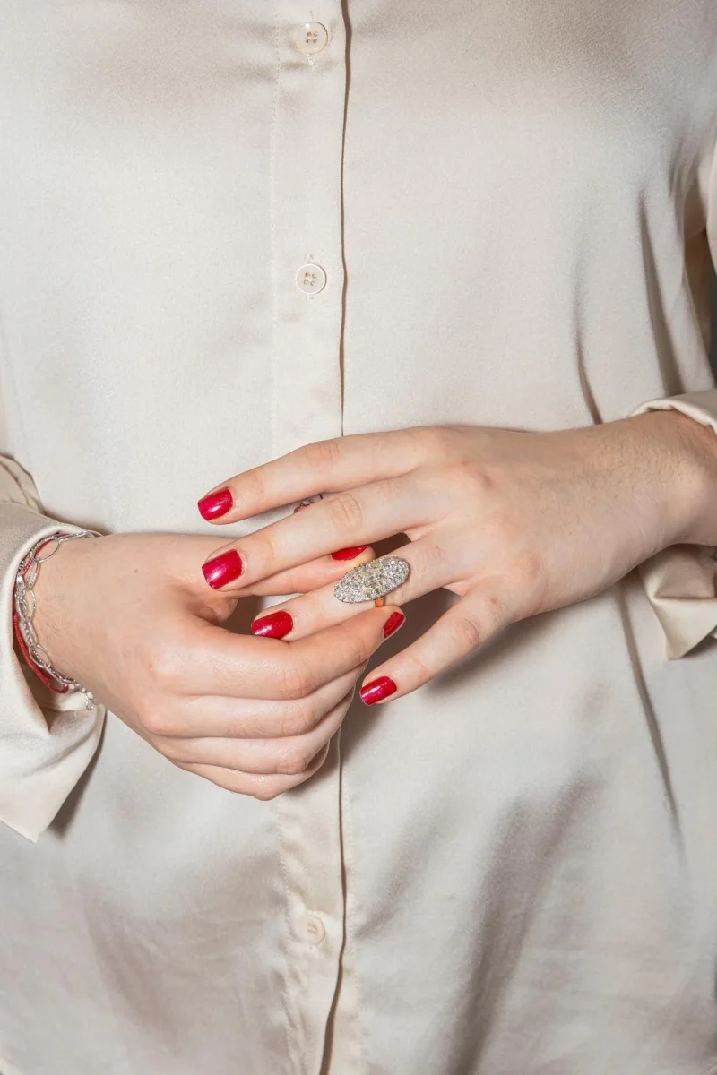 Bague marquise rétro en or rose 750 millièmes (18 carats), pavée de diamants, 1 diamant coussin taille ancienne, environ J-SI, d’un poids d’environ 1,02 ct, 2 diamants taille ancienne, environ I-P, d’un poids total d’environ 0,34 ct (chaque diamant d’un poids d’environ 0,17 ct), 17 diamants taille ancienne, environ I-P, d’un poids d’environ 2,21 cts, (chaque diamant d’un poids de 0,13 ct environ), 6 diamants taille ancienne, environ I-P, d’un poids total d’environ 0,36 ct (chaque diamant d’un poids 0,06 ct), 4 diamants taille ancienne, environ I-P, d’un poids total d’environ 0,04 ct (chaque diamant d’un poids d’environ 0,01 ct), poids total diamants : 3,97 cts, largeur sur le dessus : 2,81 cm, tour de doigt : 49, poids total : 6,36 g, poinçon tête d’aigle, excellent état