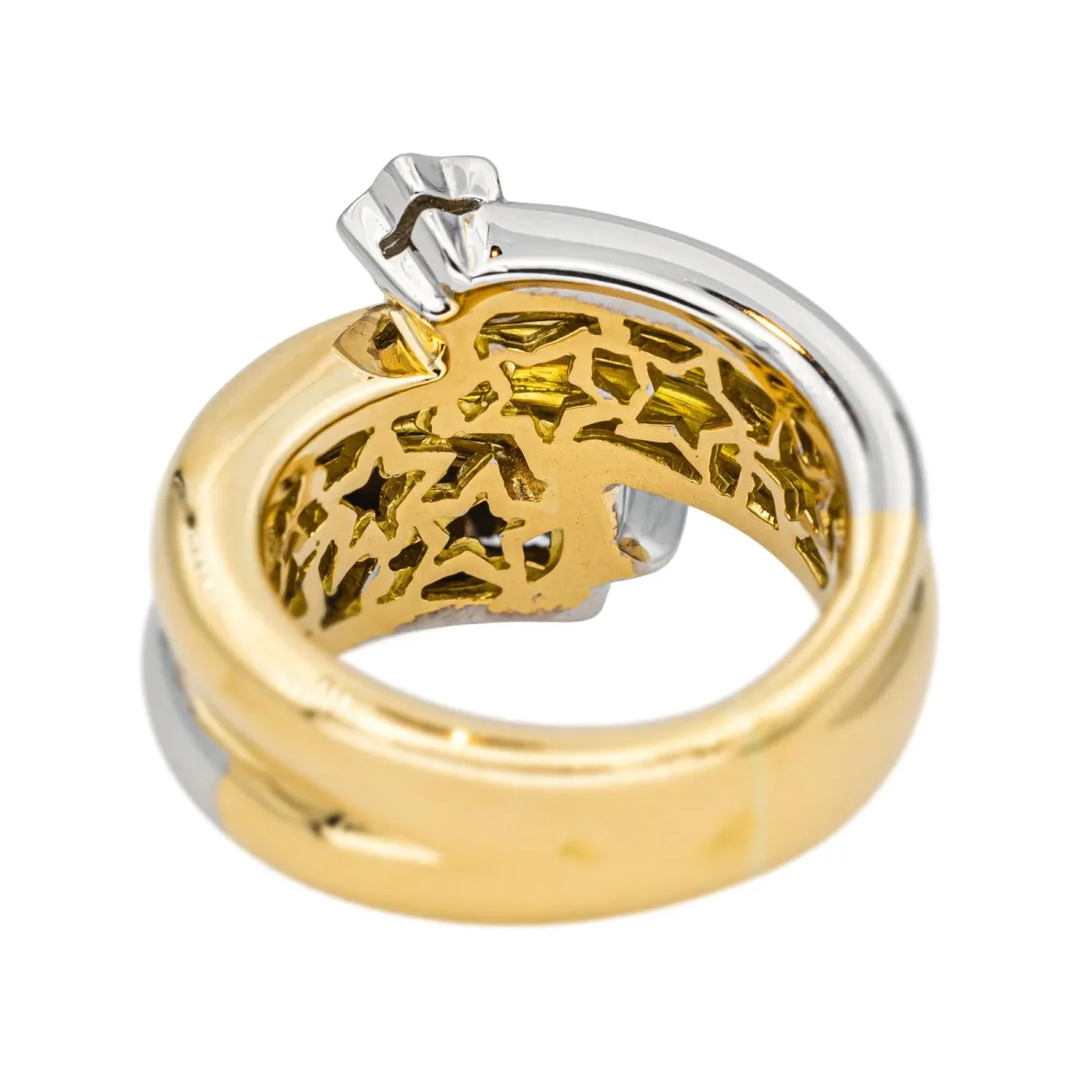Bague en or blanc et jaune 750 millièmes (18 carats), pavée de 7 diamants, 2 diamants taille brillant, environ H-VS, d’un poids total d’environ 0,10 ct, (chaque diamant d’un poids d’environ 0,05 ct) entourés de 5 diamants taille brillant, environ H-VS, d’un poids total d’environ 0,05 ct (chaque diamant d’un poids d’environ 0,01 ct), poids total diamant : 0,15 ct environ, largeur sur le dessus : 1,56 cm, tour de doigt : 53, poids total : 18,10 g, poinçon hibou, excellent état