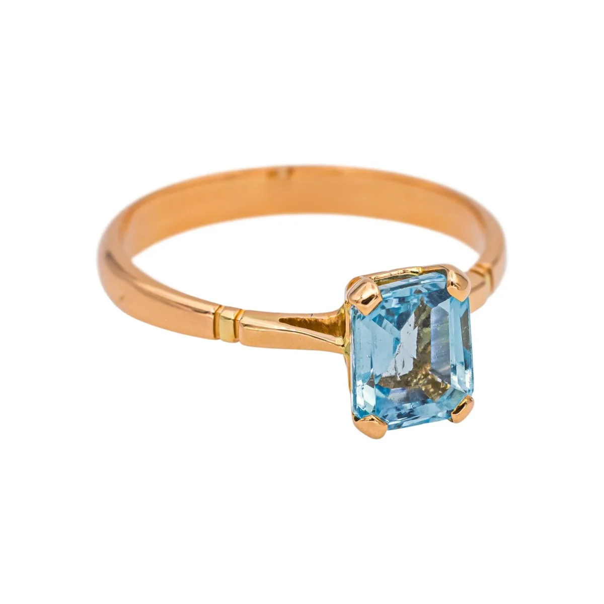 Bague solitaire en or rose 750 millièmes (18 carats), sertie d’une aigue-marine taille émeraude, d’un poids d’environ 0,86 ct, largeur sur le dessus : 0,41 cm, tour de doigt : 49, poids total : 1,97 g, poinçon tête d’aigle, excellent état